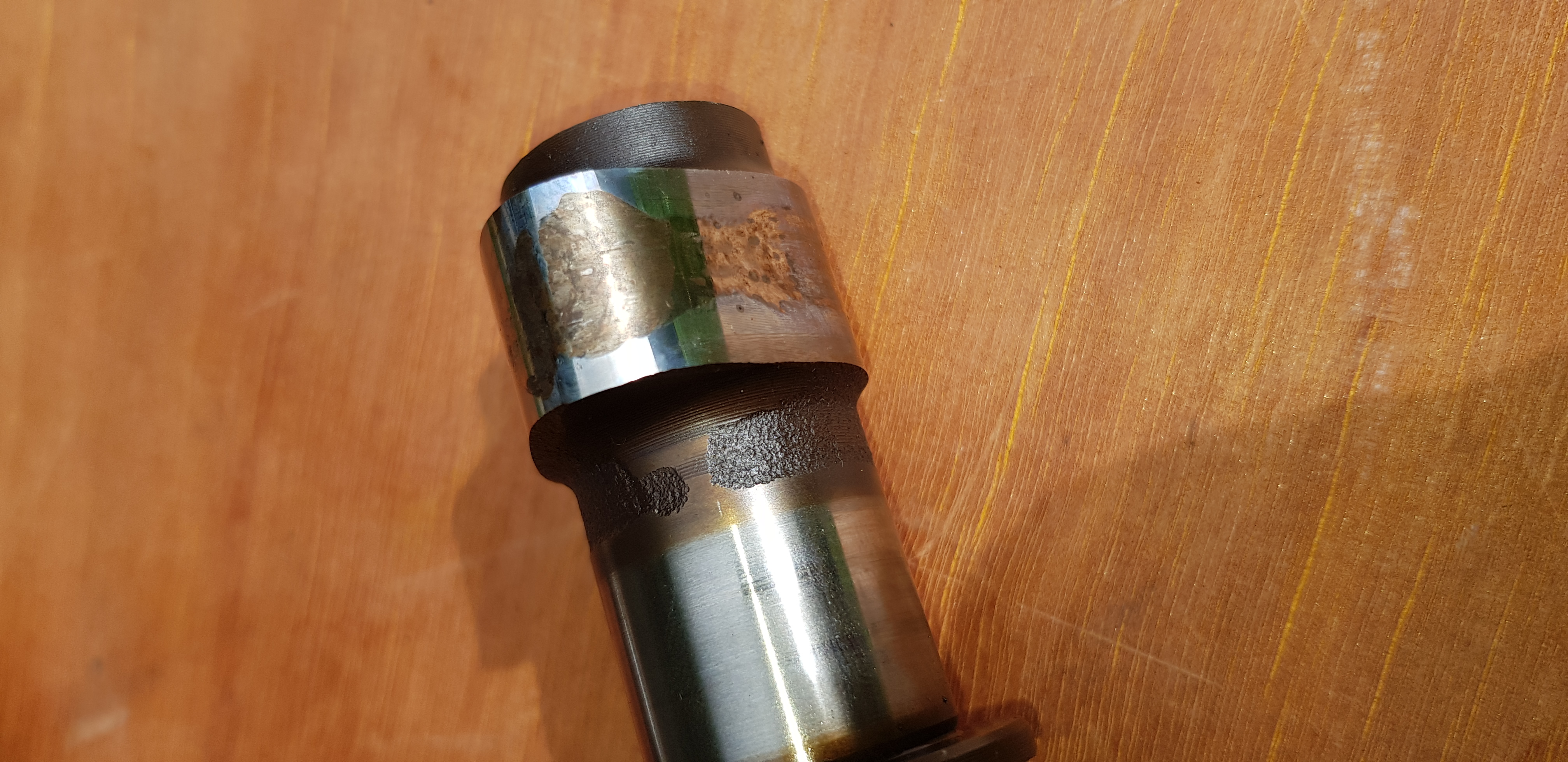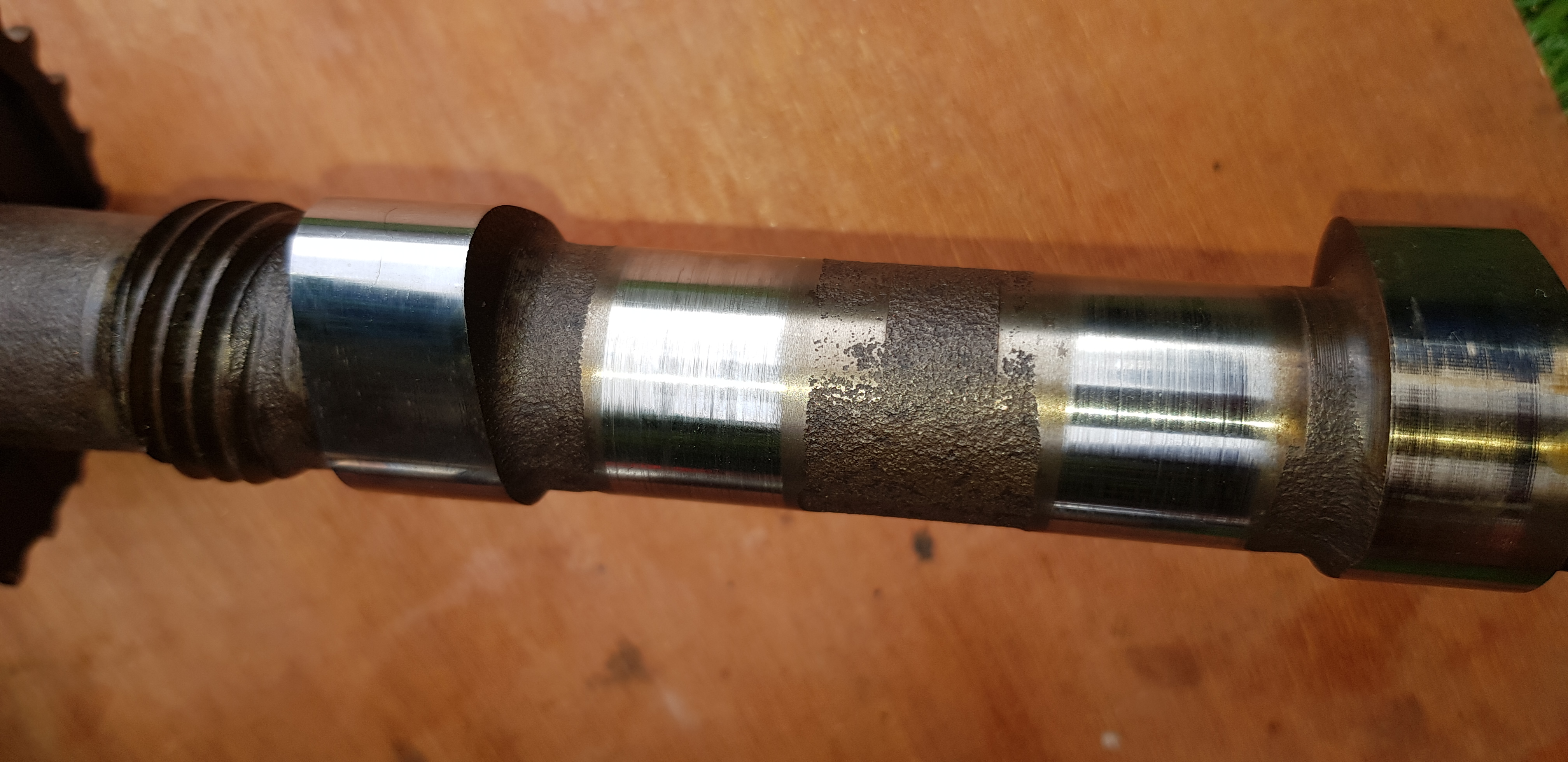 There is some scoring on journals and looks like some kind of wear on exhaust lobe, looks like when chrome wears off parts showing zinc underneath.