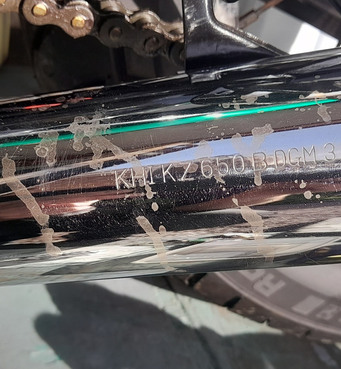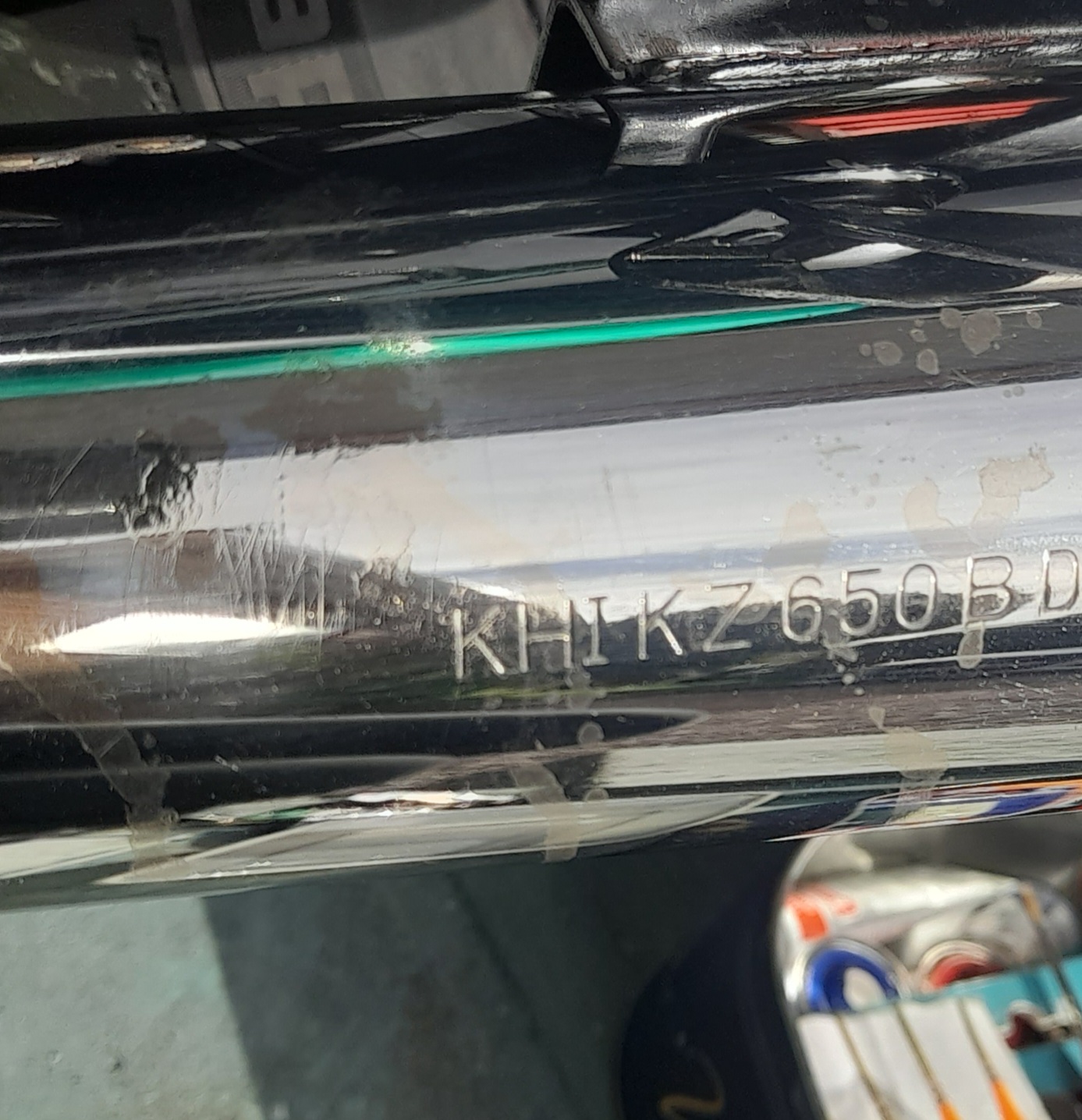 Battery acid marks on chrome exhaust. It's not bad but more irksome than anything. If I could make the marks silver coloured rather than tan I'd be happy. Silver foil seems to be the go to method, but really? There must be a better or more permanent solution than that.