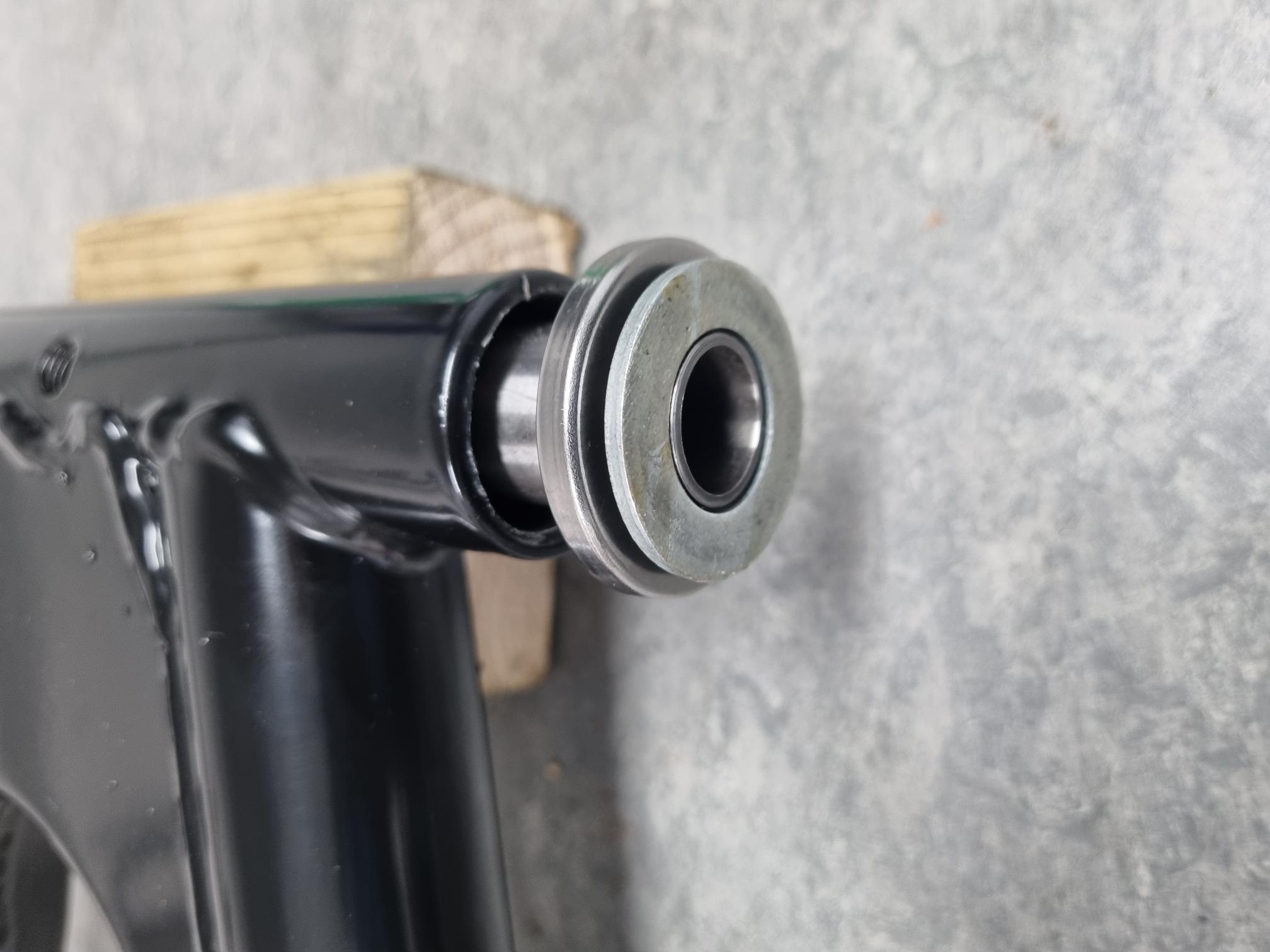 Despite this I'm sort of committed now so thought I would persevere. I know that fitting these ought to be fairly straightforward, however the bearing cap/washer doesn't seem like it is properly designed to fit on the end of the swingarm pivot tube. The photos below show the way I think they ought to go. The instructions are in German only and lack anything helpful like a diagram. I was hoping that someone might be able to tell me if I have this wrong or what should be the correct way to assemble the parts.