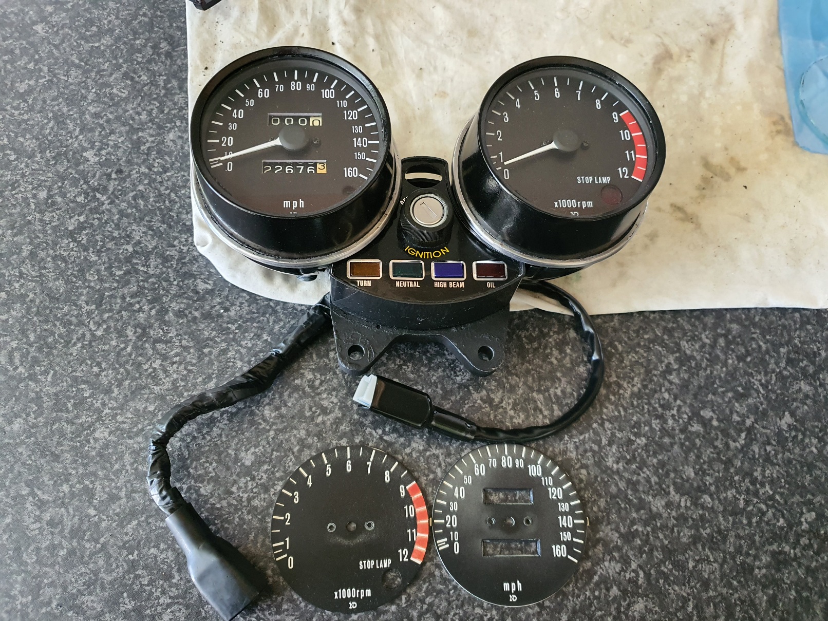 New faces fitted, new glass screens, fully re painted, new bulbs as needed, replacement top idiot lamp sticker, new ignition switch, all wiring tested and gauges too using a drill.
