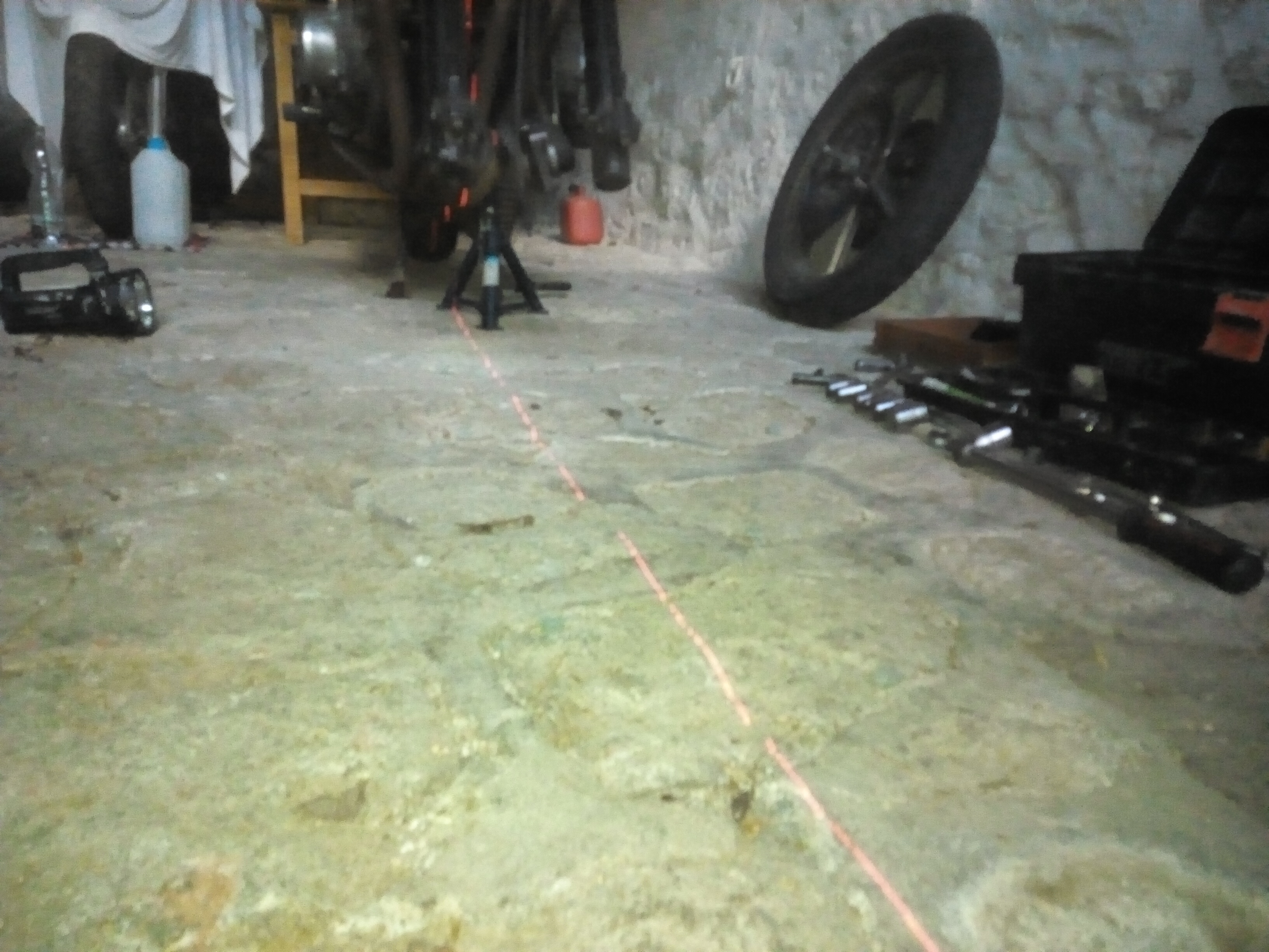 Once that's achieved you can easily check front and rear tyre Contact points with the road are in line with a Lazer and if they still in the veritcle plane with a plumb line.