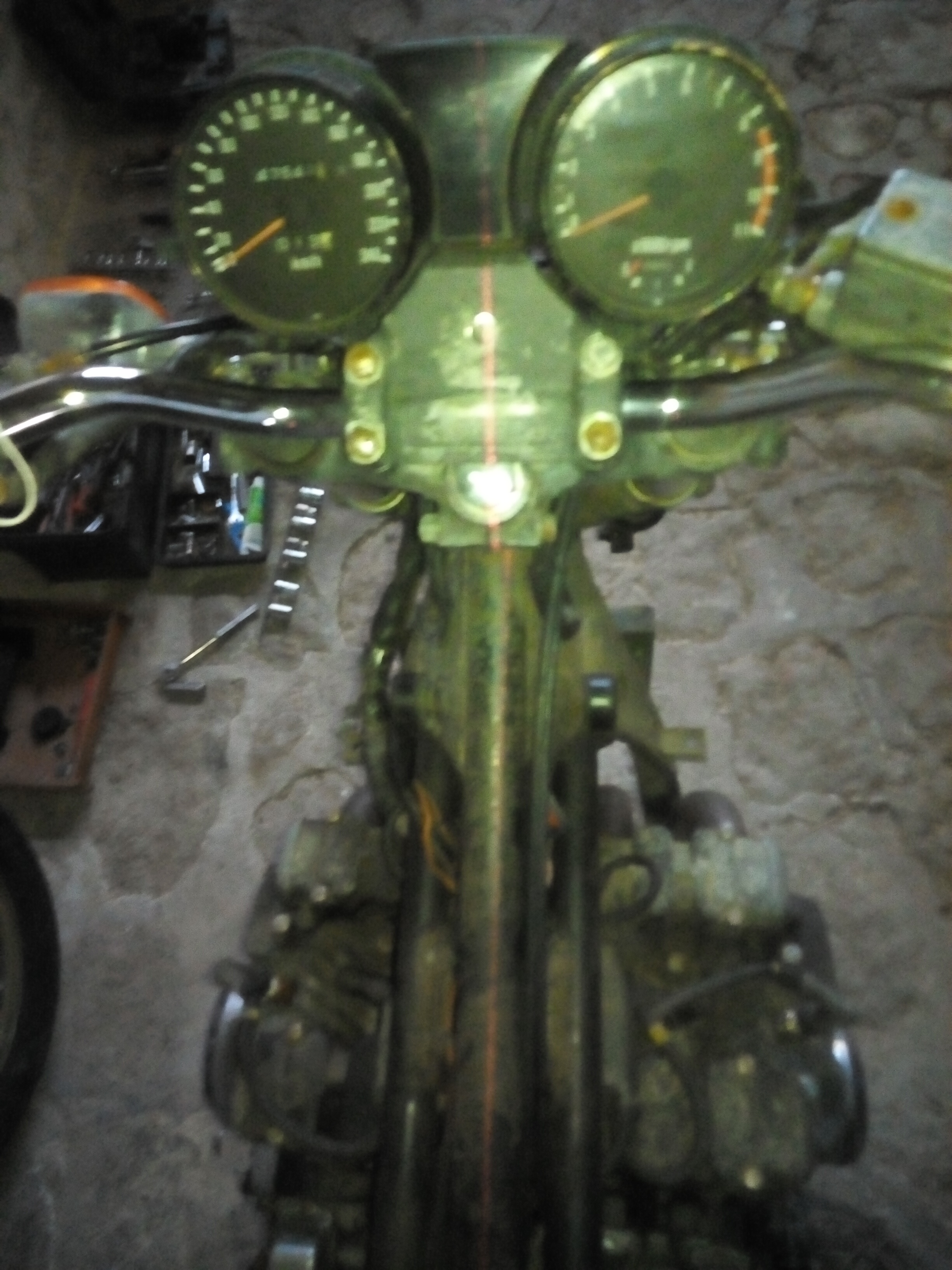 I know the forks are straight because when I rebuilt them I did a roll test with my foot on the stanchion and the top of the fork tubes ran true. The tubes also fit through the bottom yoke and into the top one nice and easily. I'm hoping it's bent yokes but fearing headstock. There is no visual damage anywhere on the frame that I can see. The swing arm has had new bearings (set up as per the WM) and there is no play in the headstock bearings. The other thing that is slighly odd is that the speedo drive only just locates in it's groove in the fork, like 2mm.