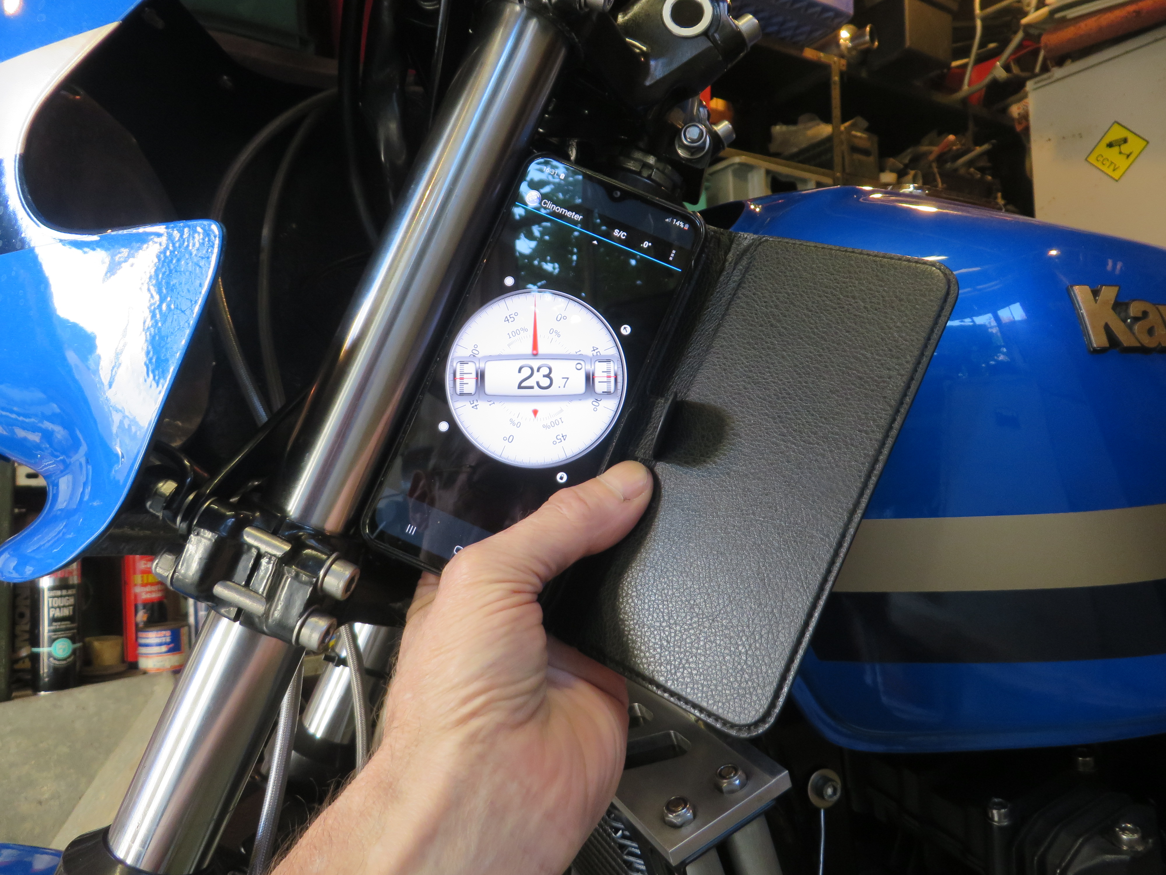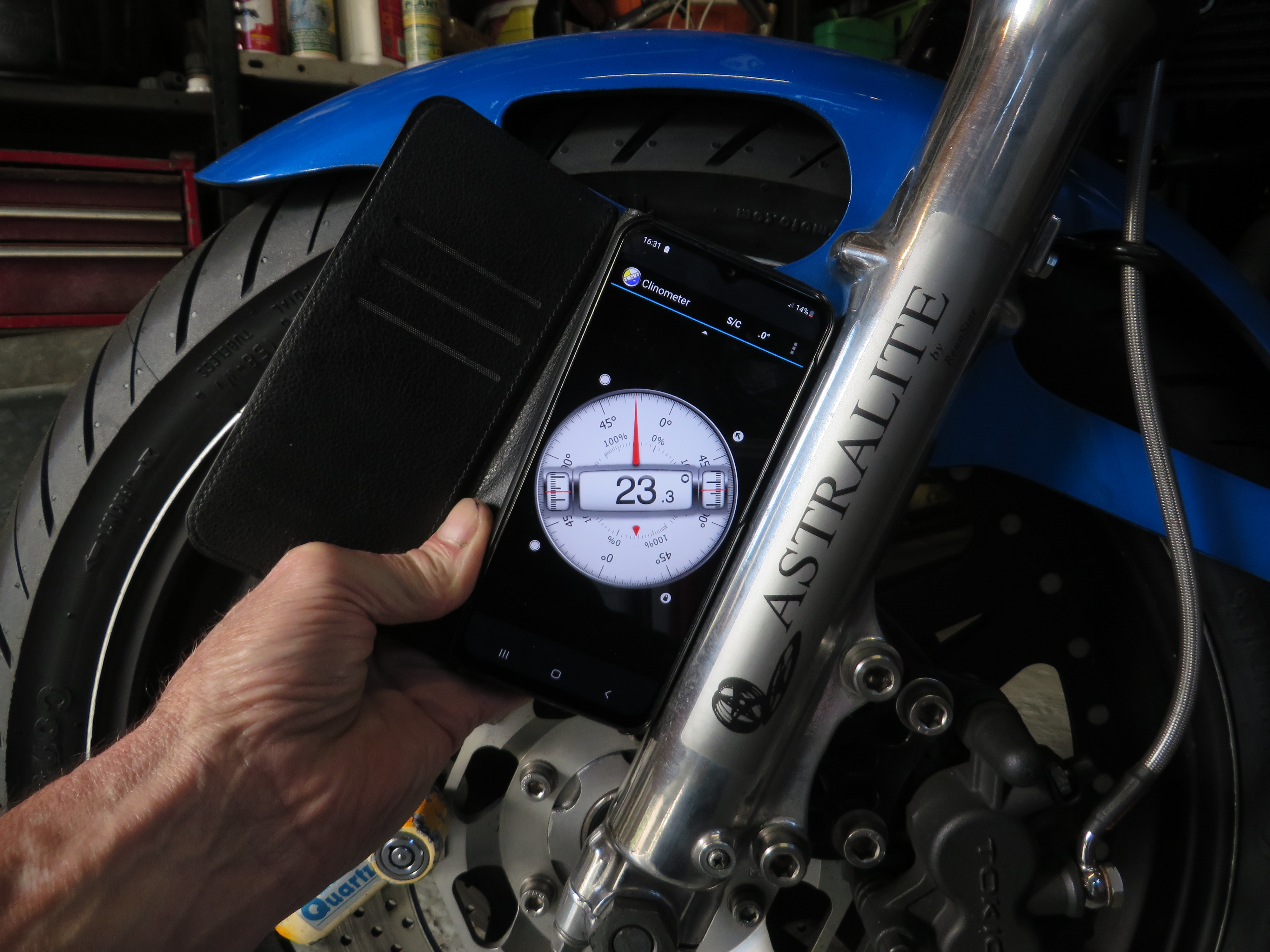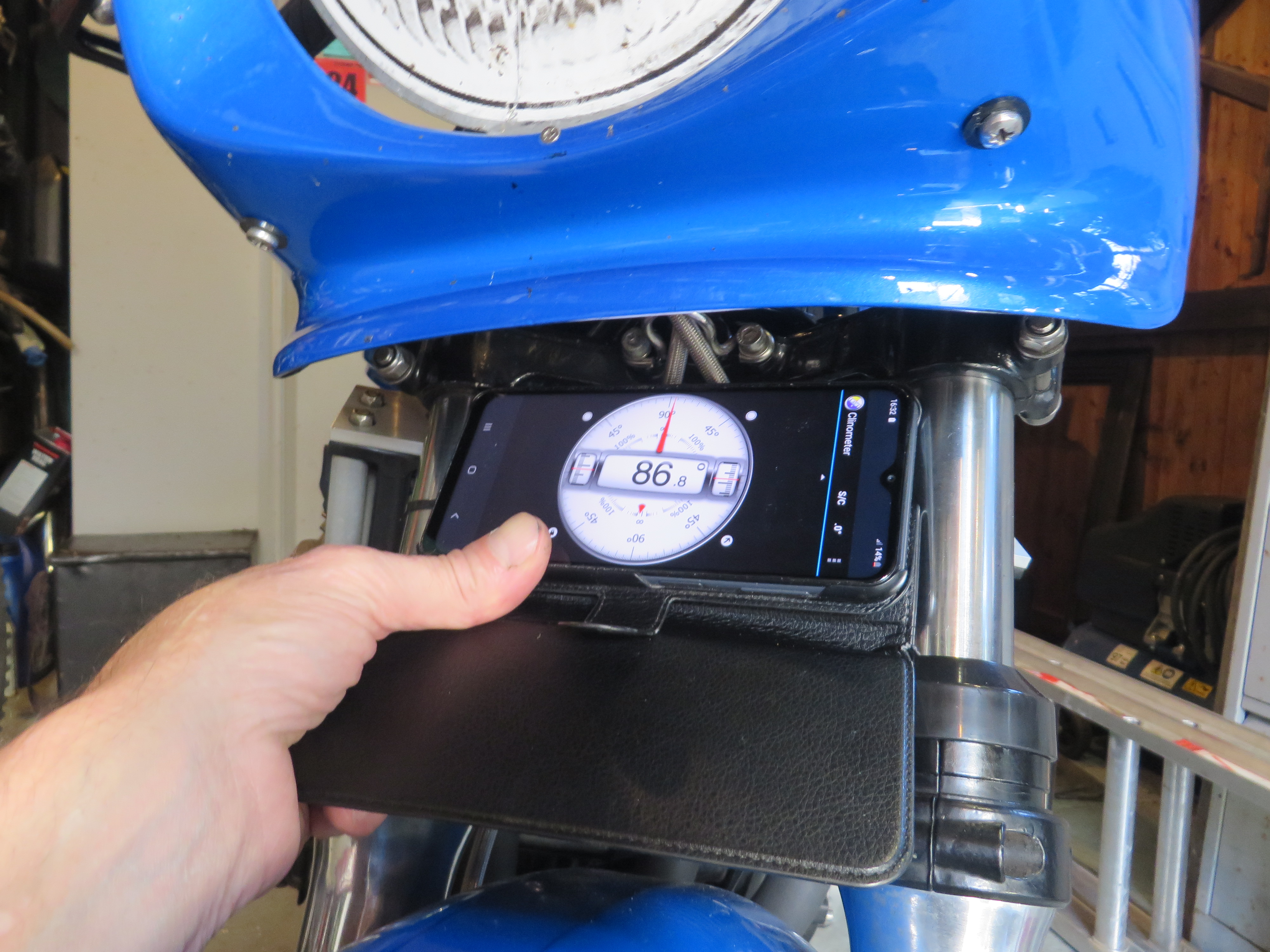 Dont know if it helps by i use the free clinometer app on my phone for both bikes and for building car bodies. Its very good and very versatile.