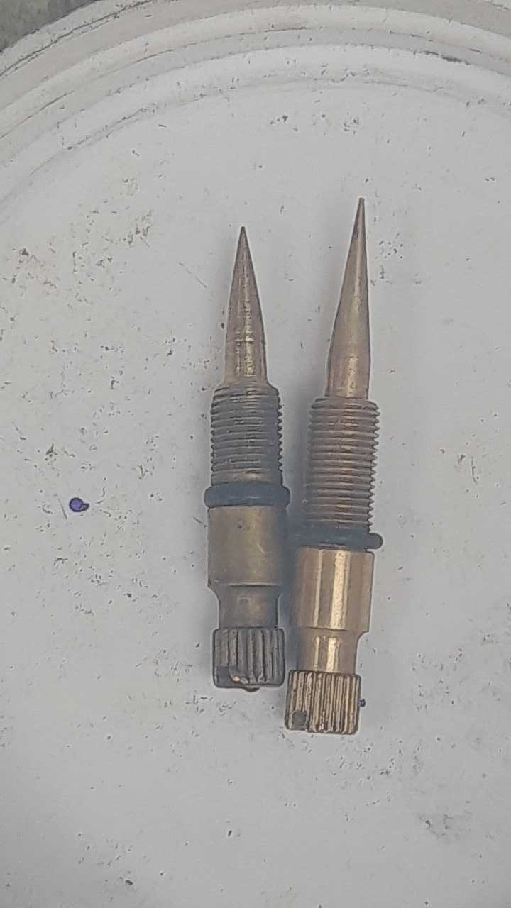Got a set of Vm24ss fuel screw only carbs which have zero low revs fuel/air mixture control. Above 1500 rpm it'll run fine but low that its grossly rich. Standard 15 pilot jets. It had Tourmax fuel needles in when I got them (right in picture) , I swopped out for genuine mikuni (left in picture) and even have tried ebay shiters and regardless which are in them with the needles fully seated (closed) they still colourtune very rich.