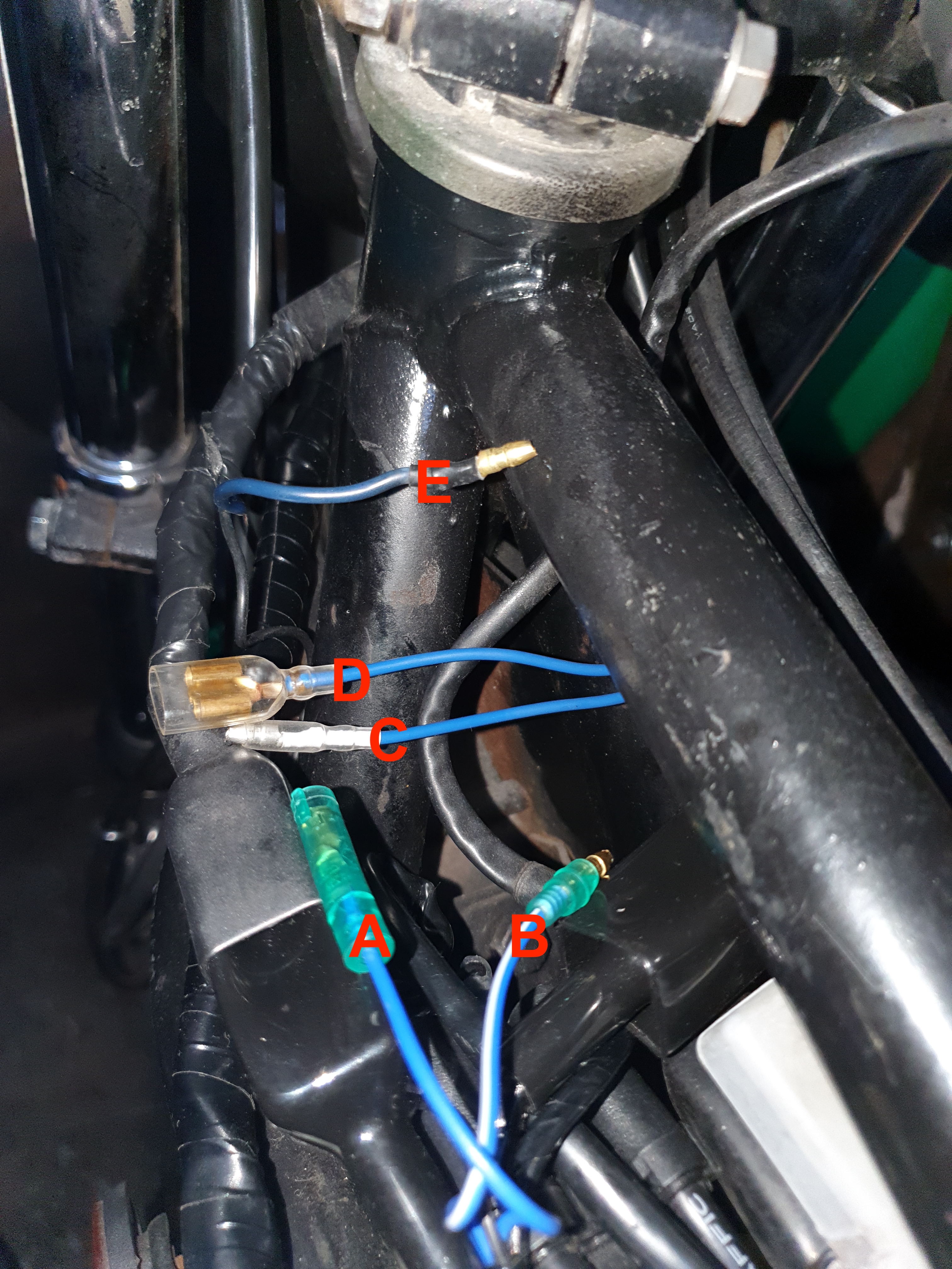 From the left hand switch block I have one blue wire with a single male connector marked E.
