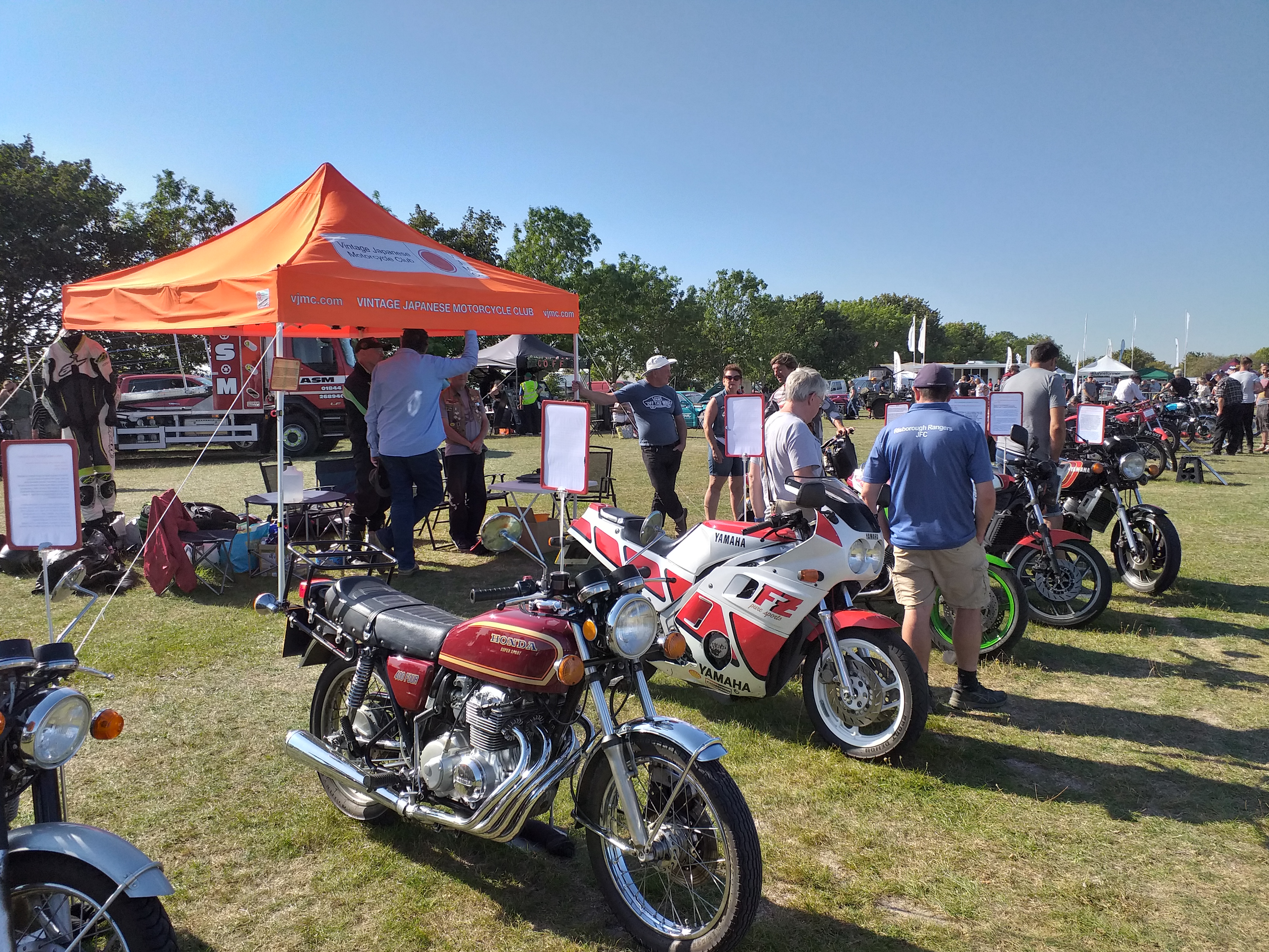 Also, a word of warning. You need to get a reasonable response from the guys and gals, as should there not be enough bikes to display to justify the allocated space (a stand area will accommodate up to 20 bikes) the organisers may lump the few bikes in with other groups. This nearly happened to me when I tried to get enough bikes for a VJMC stand last year and had to pull it in the end due to lack of interest. I did manage to get a stand sorted in 2019 before the pandemic hit though which was a great success. A large number of visitors mentioned that the era we were covering (late 60's and 70's) was when they started biking, and that the kit on display was more relevant than a lot of the older stuff and the British models of that era. I've attached a couple of pic's of the 2019 stand for your amusement.