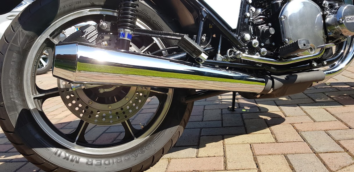 Gradually I've been restoring the shed and today I finished when I recovered the seat. The bike has had a complete nut and bolt restoration from what was a very complete bike. It now looks like it did when it left the showroom except for Hagon shocks, HEL brake lines , Reg/rectifier and new tyres. It has the original, re-chromed exhaust and all the other bits normally missing in a shed .....kick start, helmet lock, ammeter wiring and the incredible front brake !