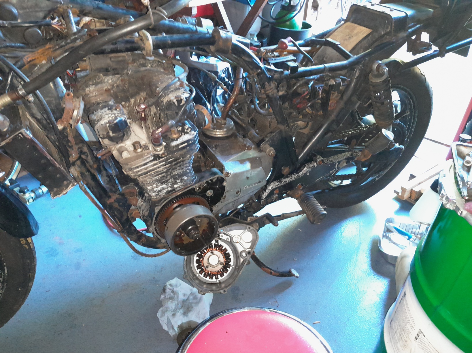 I purchased this bike new in January 1982 and had to ride it back home about 40 miles on one of the coldest January's for many years, but strangly hardly noticed the cold and snow. It has had many different looks over the years but suffered very badly in a damp garage for about 10 years. I decided that if it started, I would make the effort to restore it to a rideable condition. It took about 3 hours of carburettor cleaning, plug changing, new fuel, and freeing off the starter motor, and it started after only a couple of turns. Because I've had it for so long, I just wanted to ride it again and decided not to go for a full show piece restoration. It's far from standard, particularly the motor, so I couldn't see the point. I've put about 500 miles on it since finishing. The one big job for this winter is making a new wiring loom as the copper in this one has gone black and brittle.