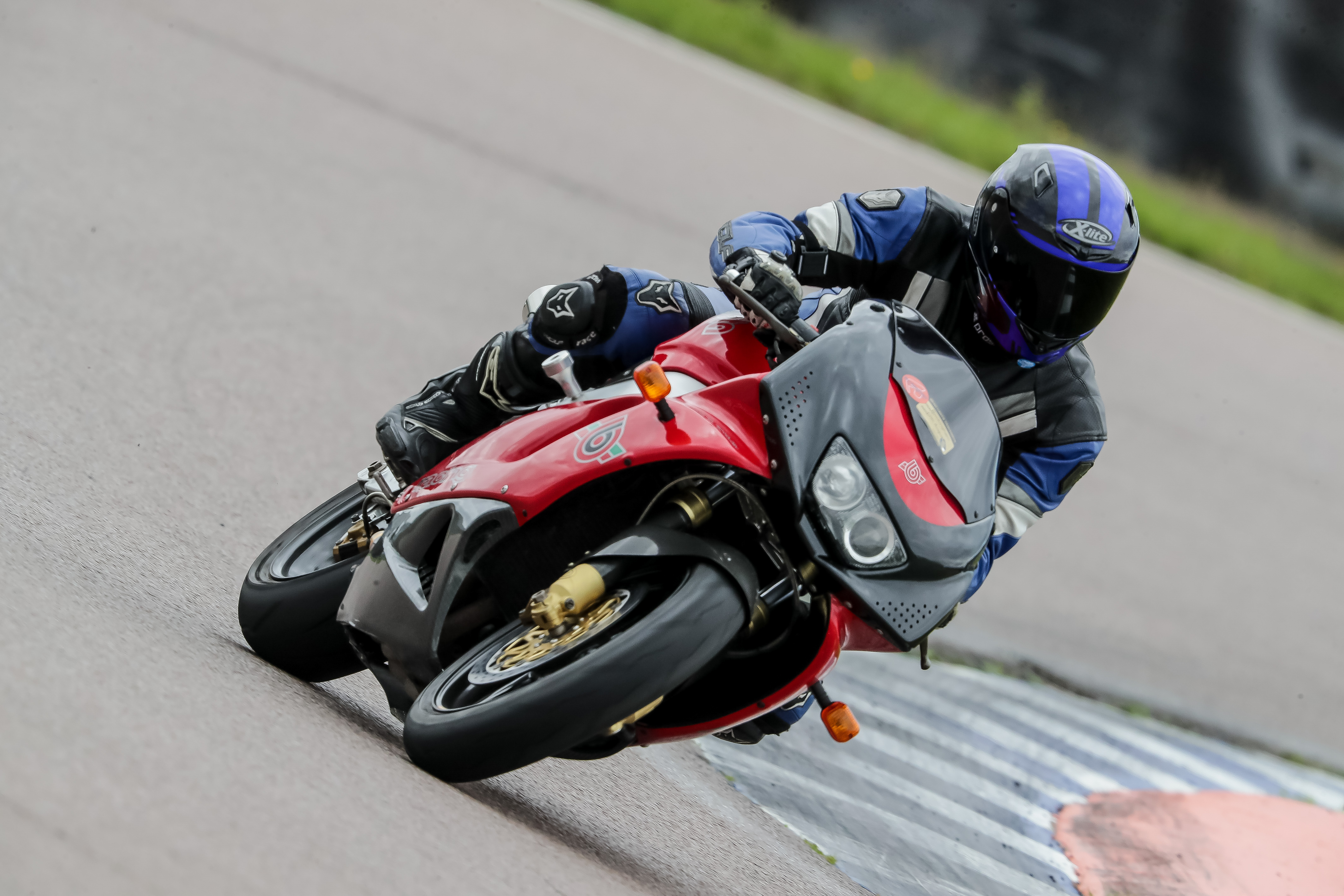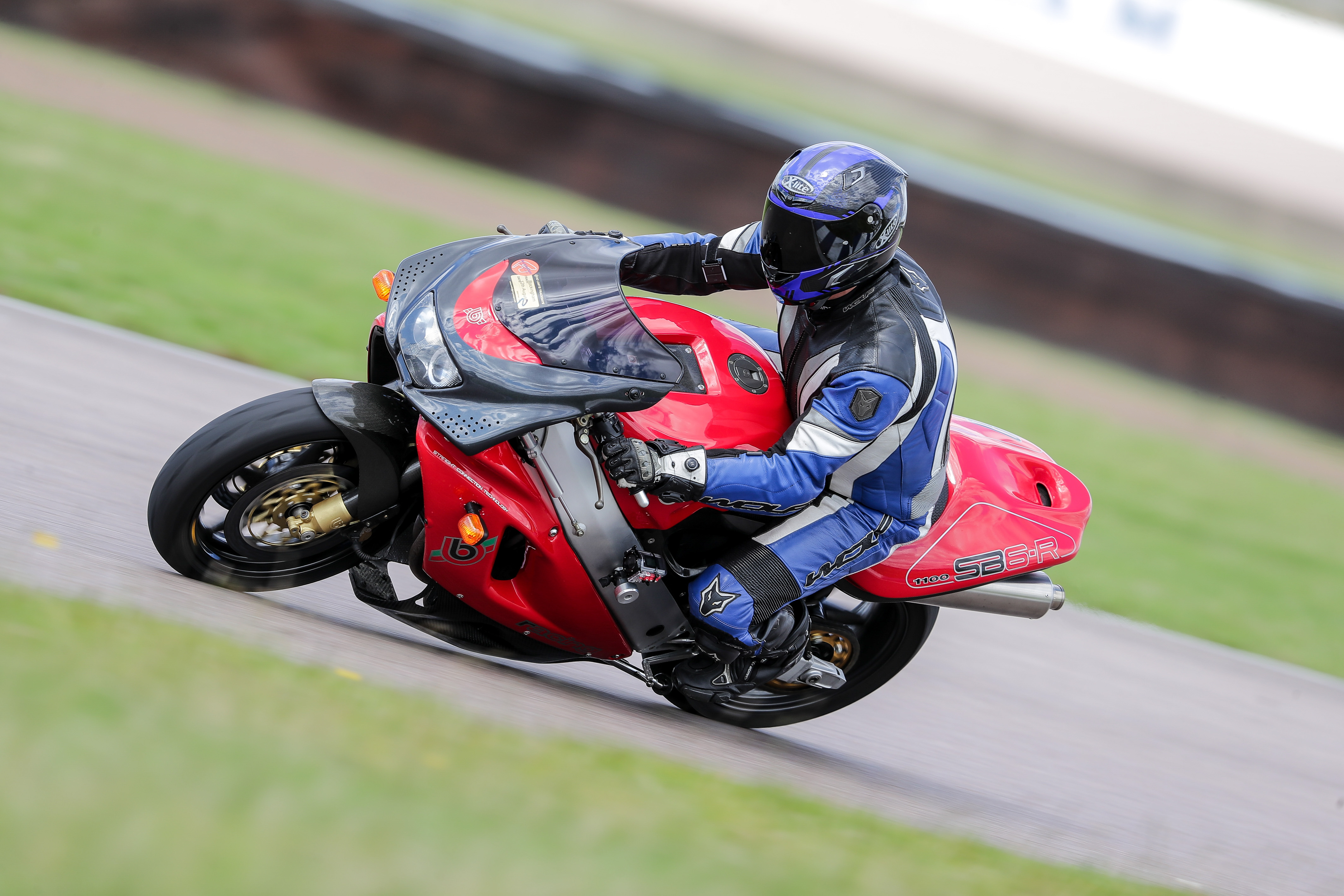 Here's a video of me on one of the sessions in lower group. Camera positioning was not great as i attached to crash bung on the left frame rail. I was riding a Bimota SB6R so being very restrained; falling off this and damaging unobtainable bodywork does not bear thinking about. I really enjoyed my day though. The massive power and torque of the 1100 GSXr motor makes riding this so much fun. Just roll on the throttle and it pulls like a train. Rockingham is very short so limited opportunities to really let it go but coming round the banked section it was hitting 130mph before having to brake. At one point you can hear the back wheel chattering as it is bouncing under hard braking before the sharp left hander on to the infield circuit.