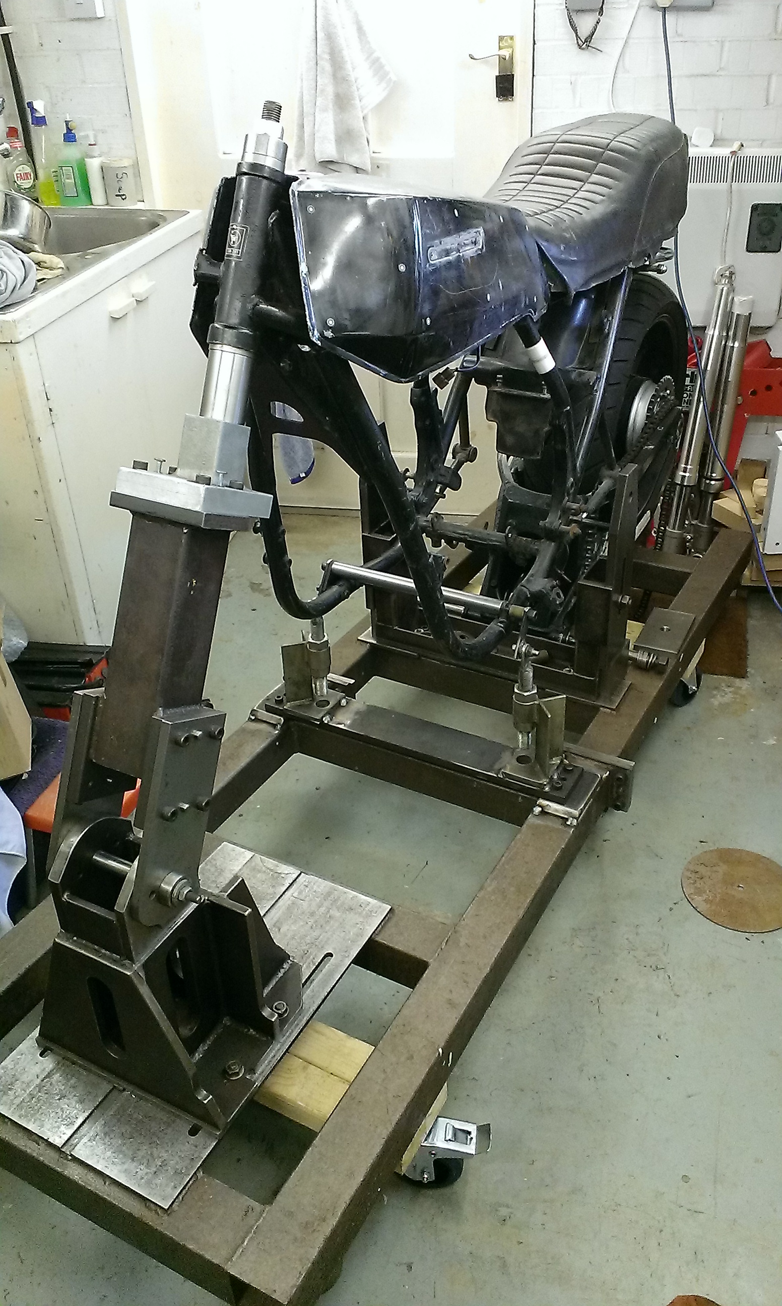 Impressive and a little scary to look at but hopefully it will be, or is, all well again. Will you leave or have you left the standard geometry after fitting modern running gear? Its hard to see but it looks like 24 degrees of rake but could be an optical illusion.