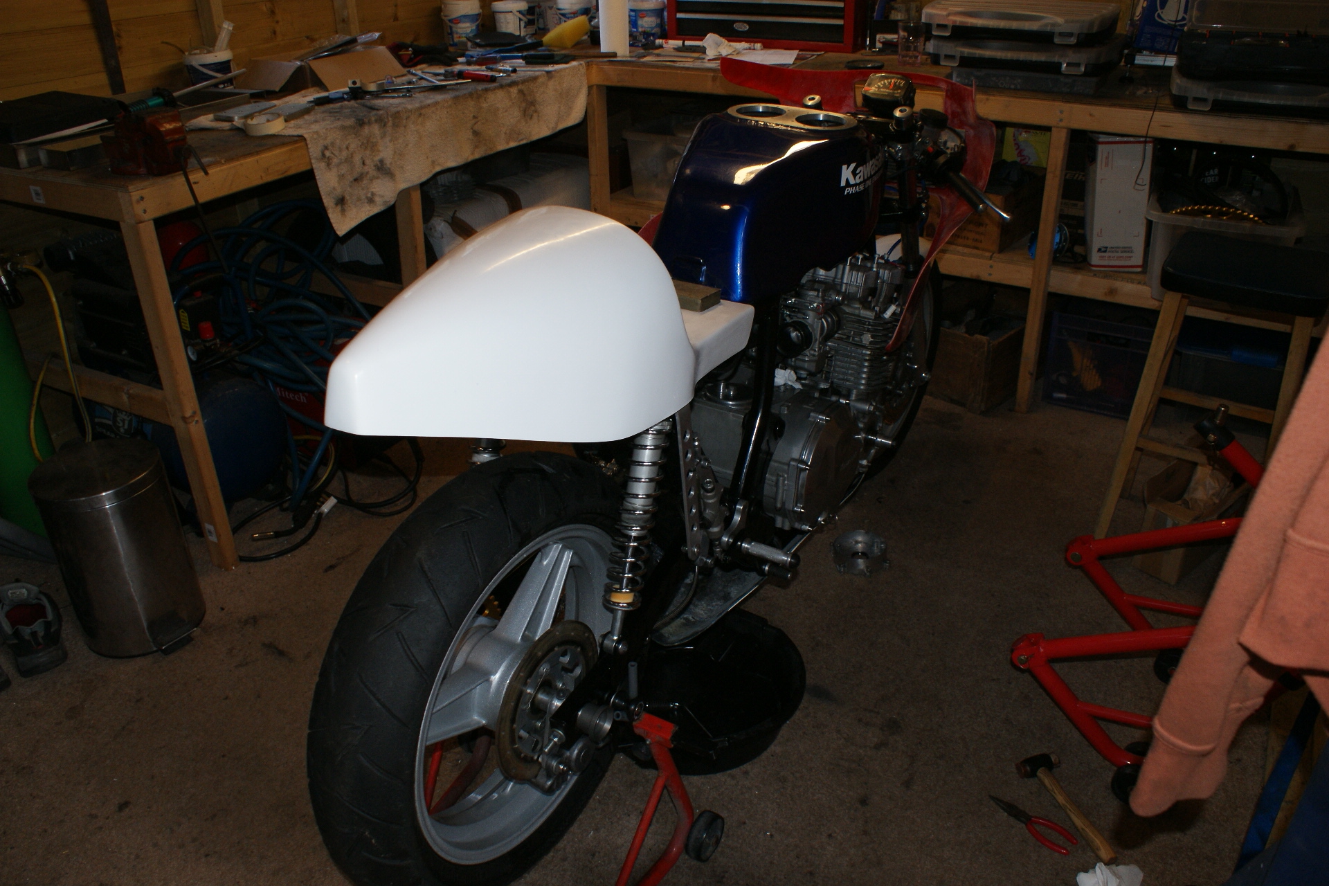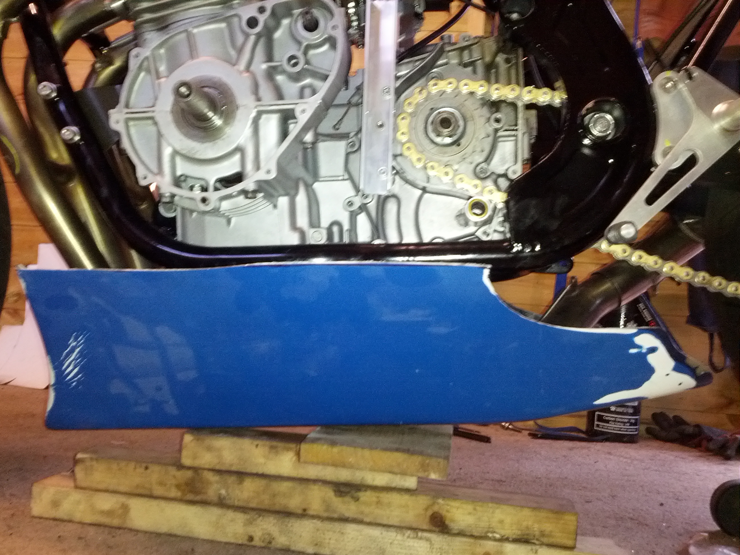 After trying to locate an endurance style belly pan that will actually fit the wide P&M frame and hold an engine full of oil and look the part i gave up and took the cutting disc to the "XR69" fairing that came with the bike: