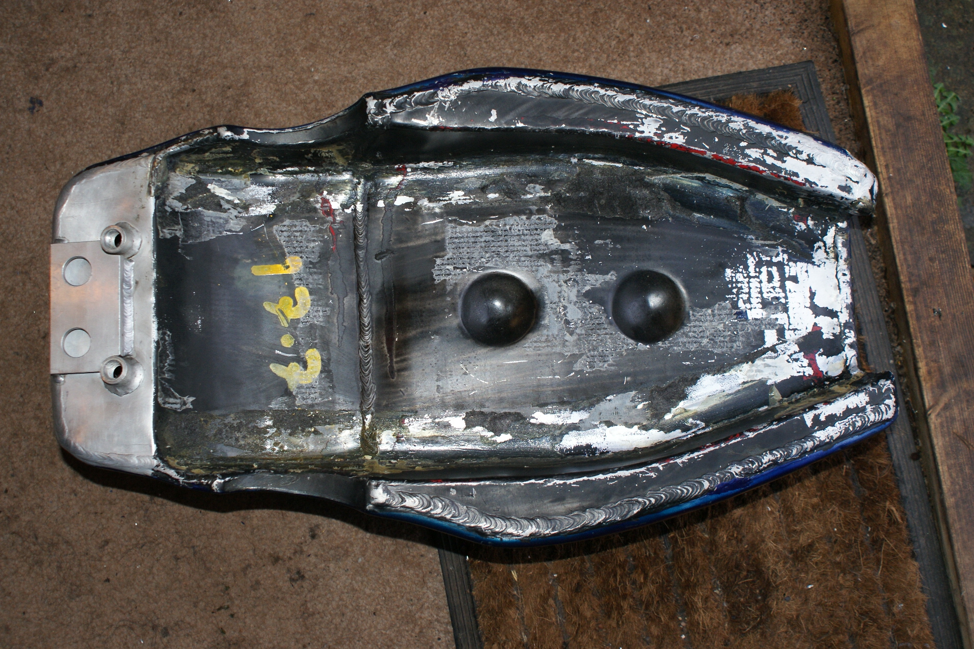 Spent a good hour or so pushing the dent out of the front top of the tank under the breather fitting. End result, dent partially pushed out, found out it was already bogged as well as witnessed by the cracked filler next to the breather. Now need to leak test it somehow?