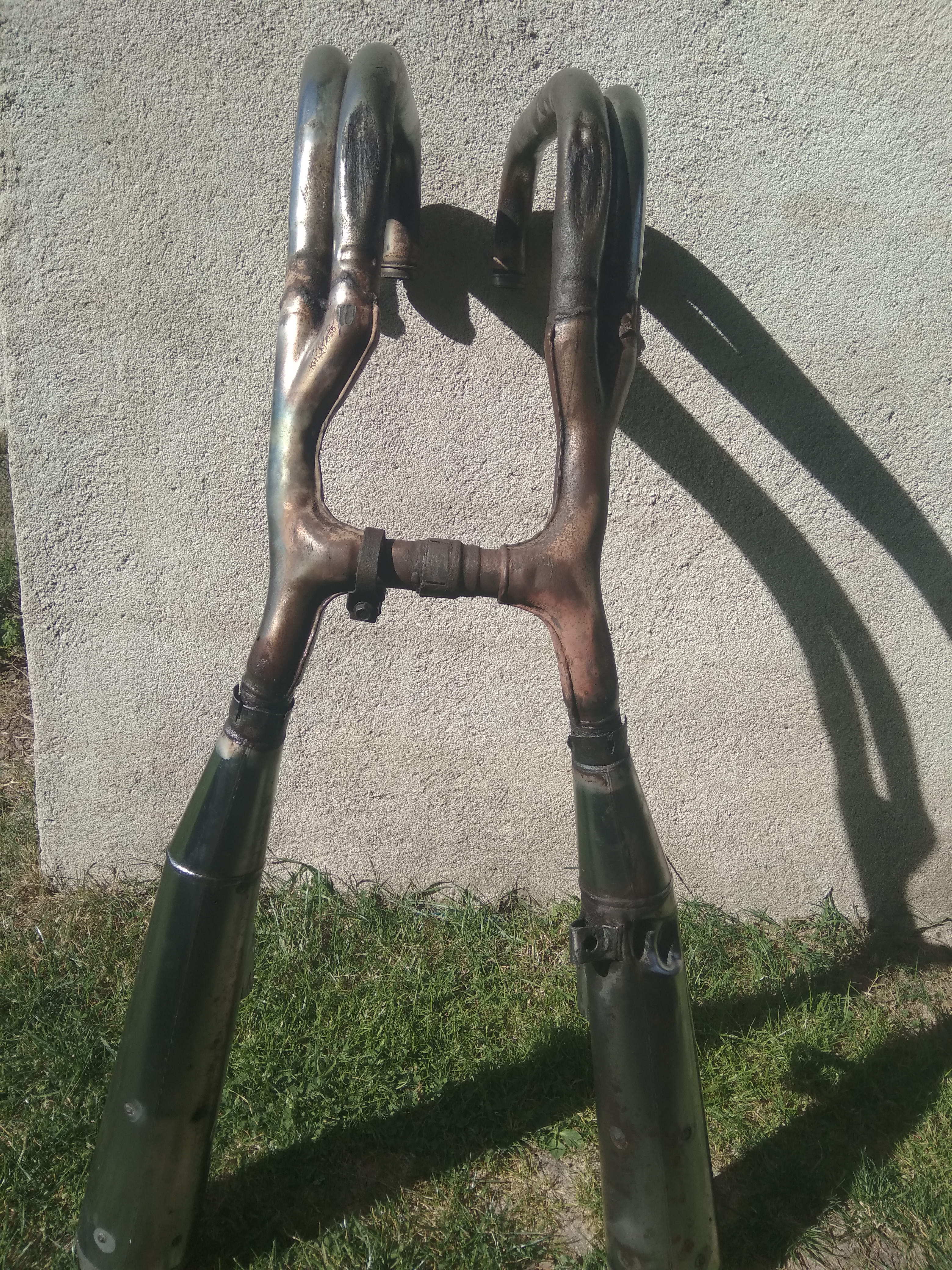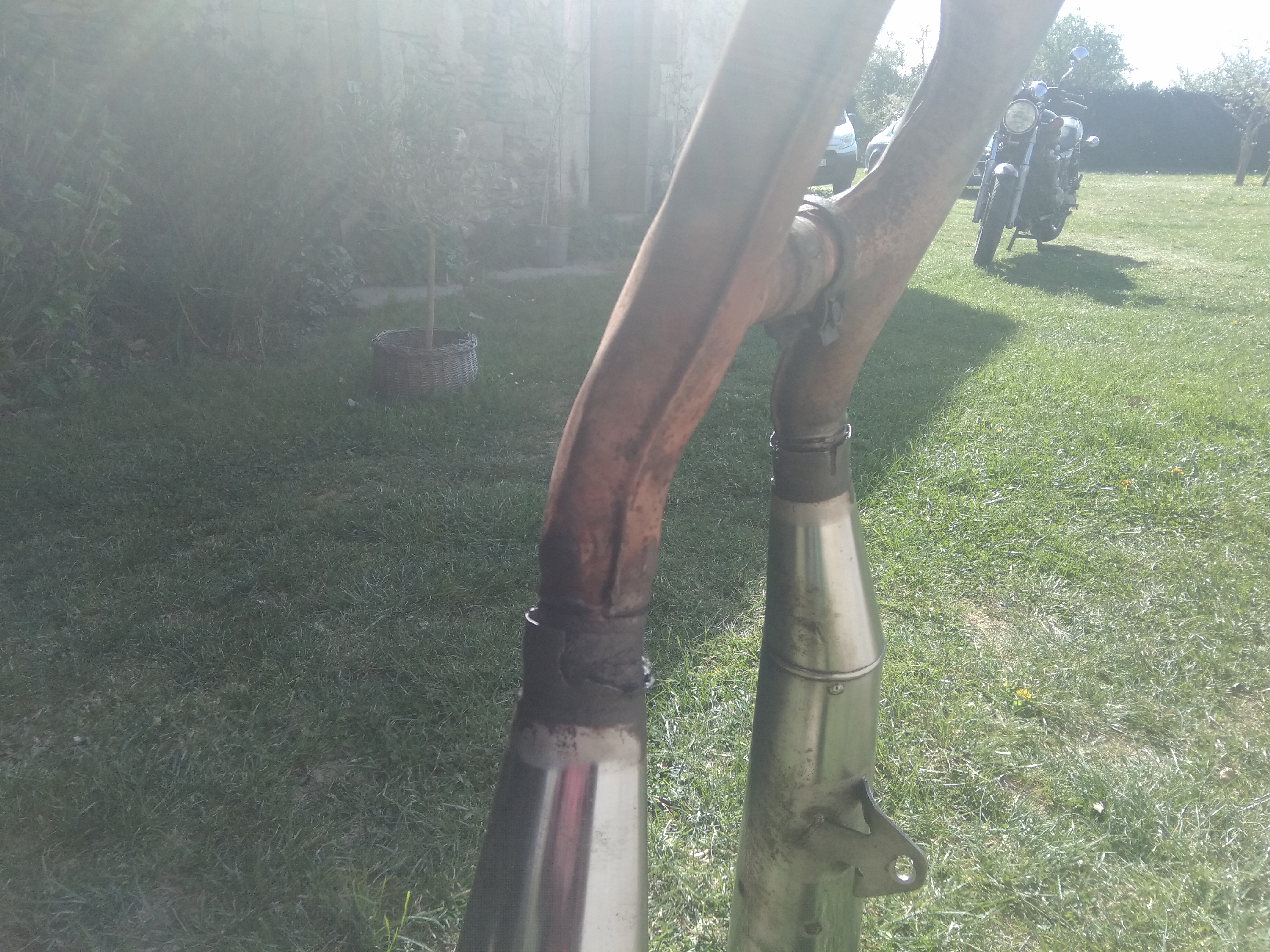 They've been 'kerbed' but more importantly I tried to dismantle them in situ, no chance. Choice remove front end to slide them out or maybe taking the centre stand off may allow them to come out sideways, luckily the 2nd option worked. Lots of releasing fluid and wire brushing and teasing later and the won't budge. I'll wreck them if I continue so going to autosol the silencers, treat the balance pipe area then paint black and depending on the downpipes they may become black as well.