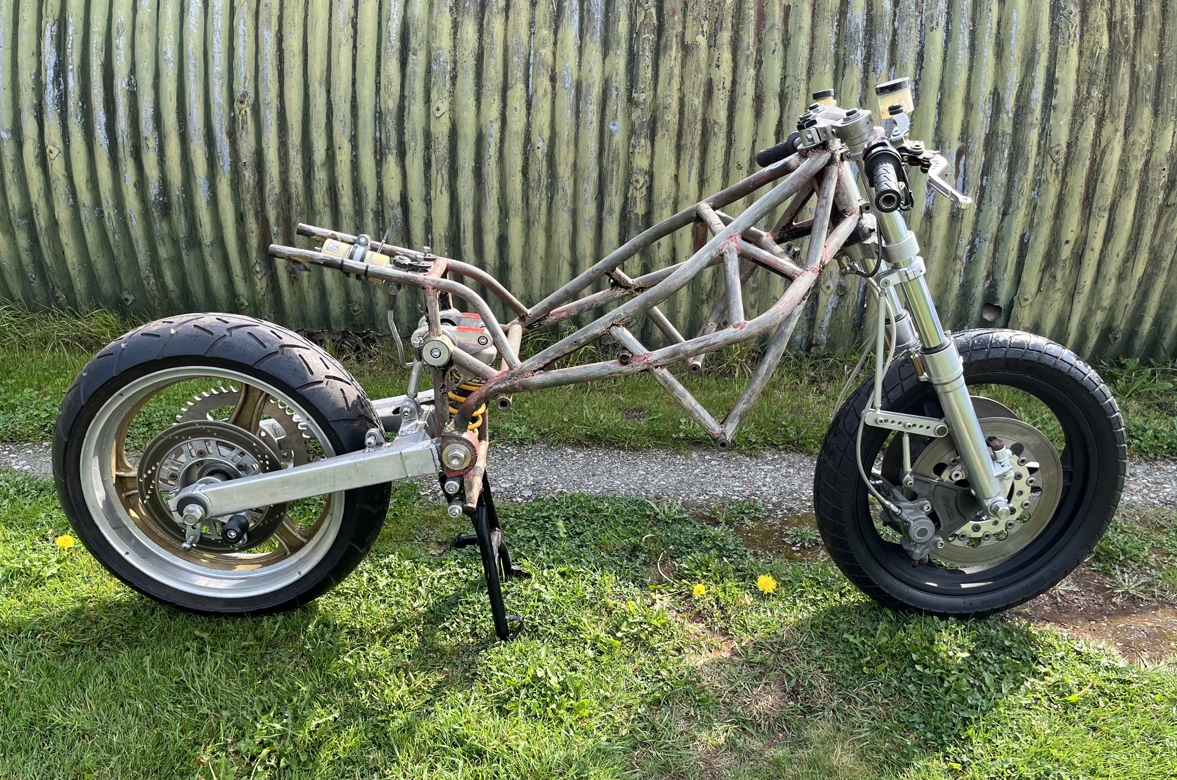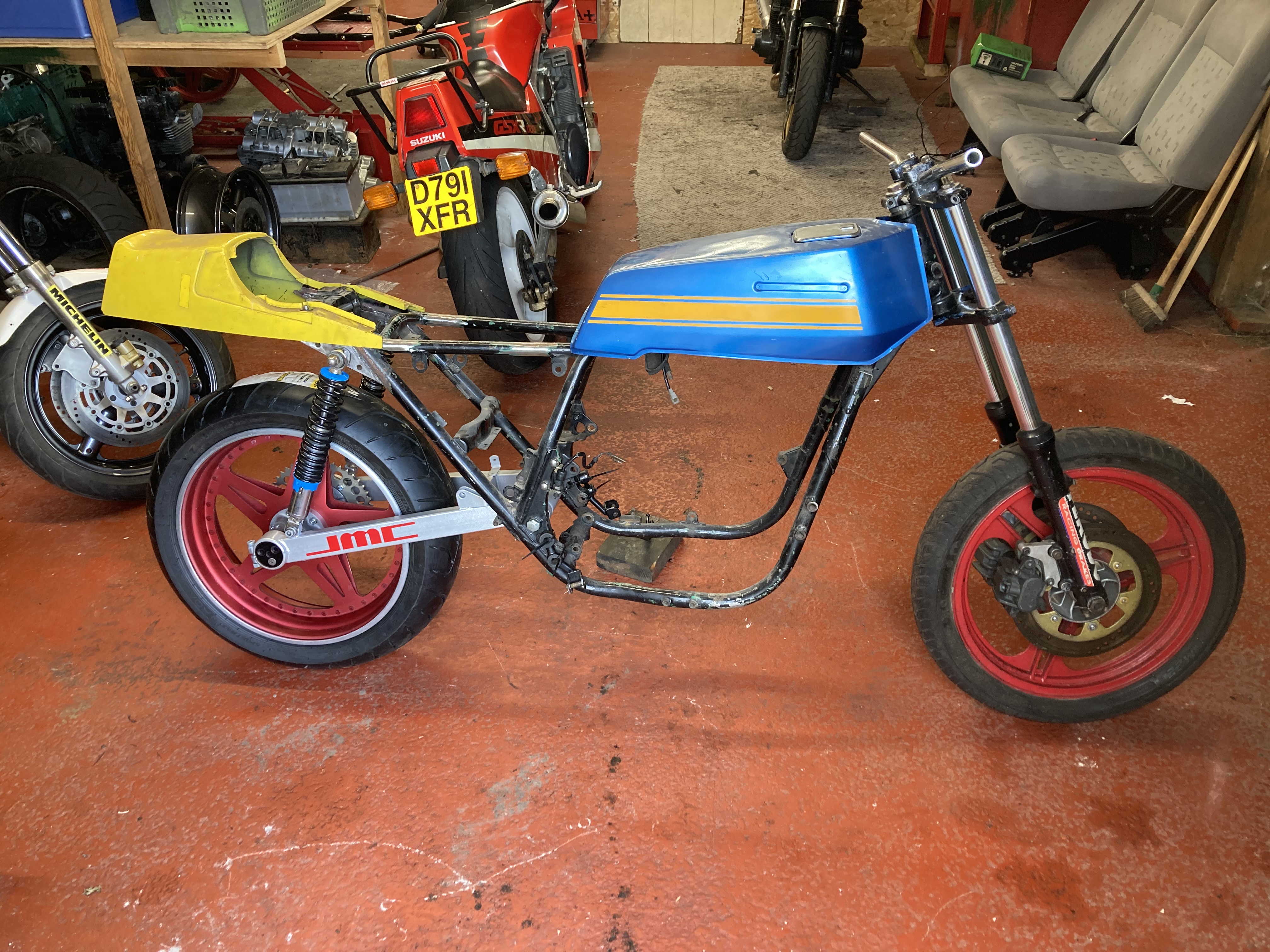 I can’t believe how quickly the time seems to go by these days but I’m still trying to collect all the parts needed for the z1r moriwaki, I’ve been lucky enough to find a metmachex braced swing arm which I really like, unfortunately I don’t think I’ll be able to use the 5x18” astralite wheel though as it’s a little too wide….we’ll see how things work out…. in the meantime I’ve been preparing my steel framed z1 Spondon for some frame repairs, I’ll try and build it up with the z1r as effectively they’re both going to have similar power plants …