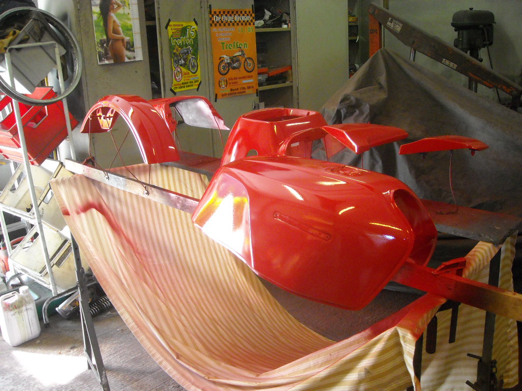 The usual preparation was done on the bodywork: grinding, grounding with epoxypaint, putting putty on, grinding again, painting with “firecracker red” paint, putting the decals on it, giving the parts an overspray of clearcoat…