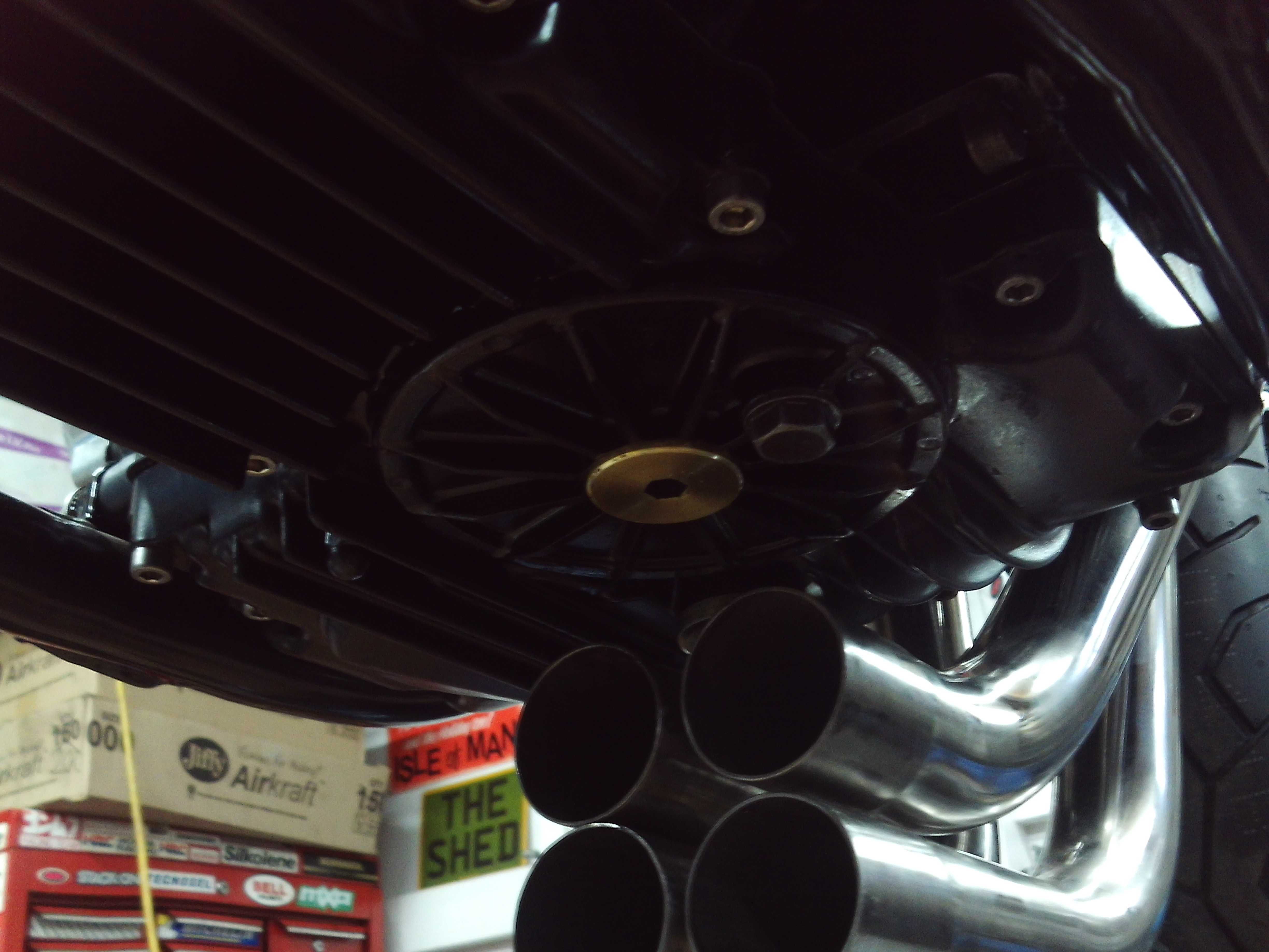 Made some stainless exhaust studs and got the downpipes on but they run very close to the sump and the collector fouls the stock filter cover so had to knock up another low profile version with flush fitting bolt the same as i did on the alloy cafe..