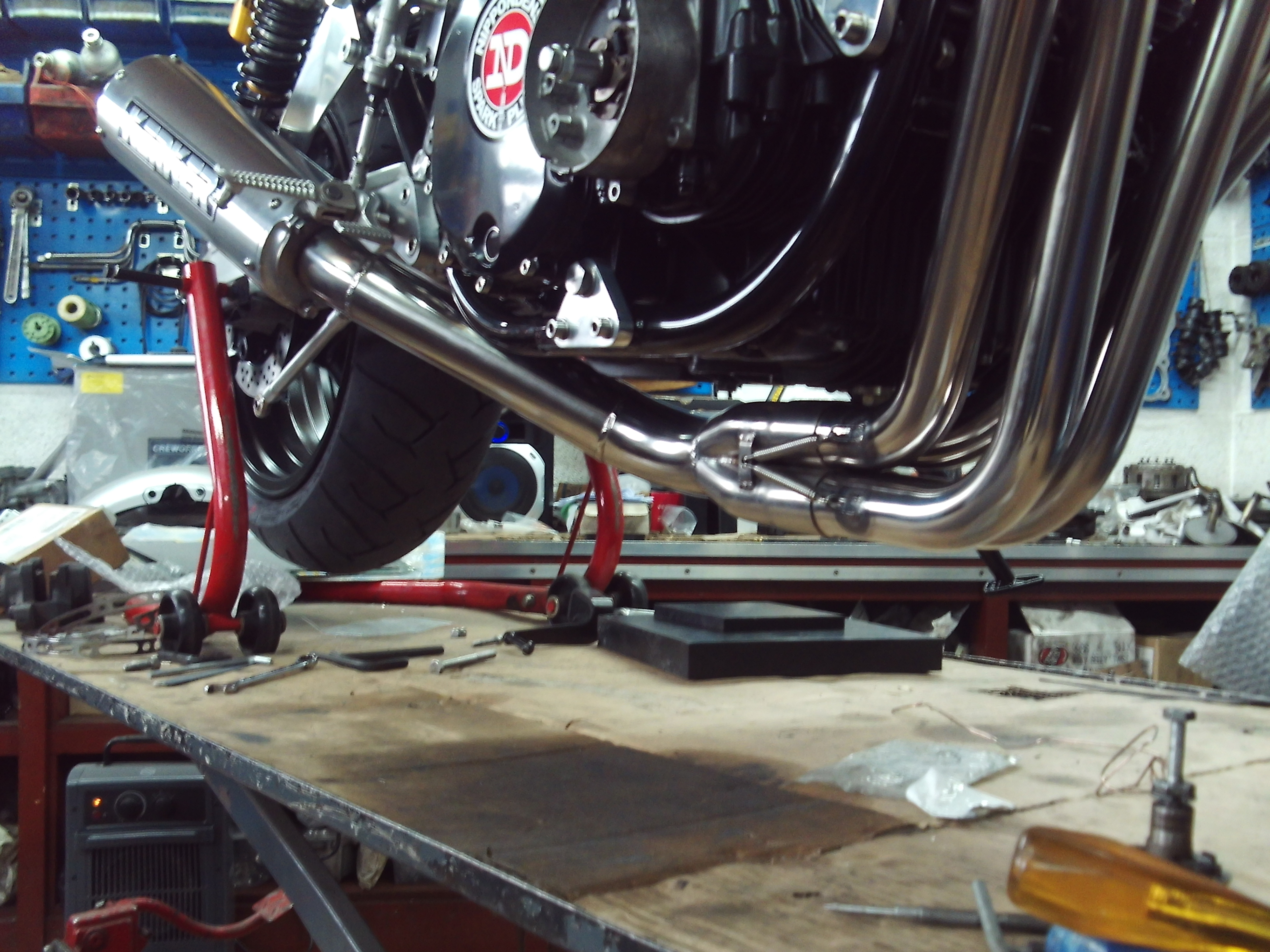 And the eagle eyed may notice that the angle grinder has been back in action again which has resulted in the link pipes third and final incarnation which takes a straighter path to the can and is tucked in tighter to the frame for better ground clearance.