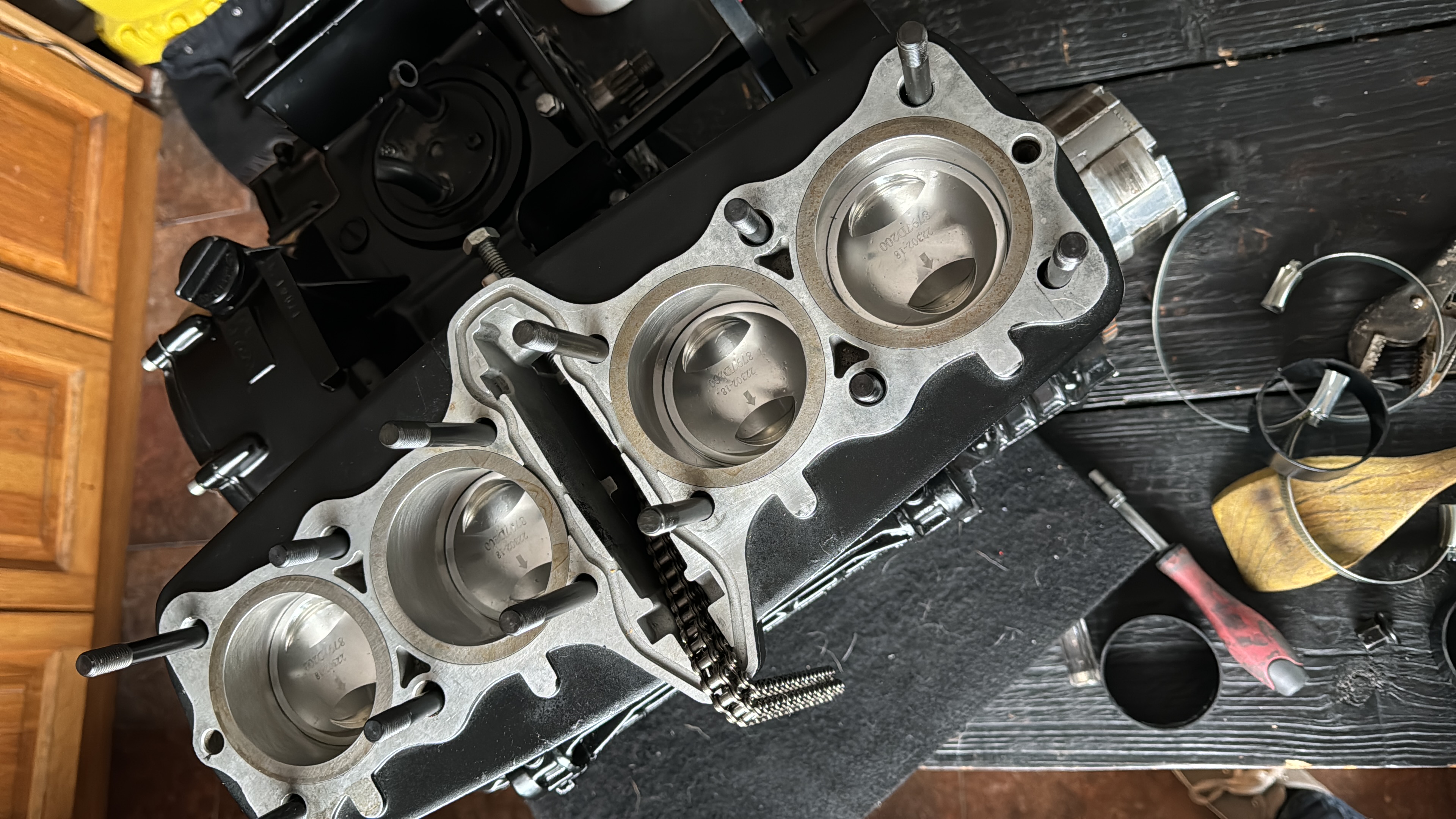 Engine is in the frame now, Wiseco 72mm gasket. Andrew’s cams and upgraded the cam chain, idlers and tensioners and Andrew’s cams. I’ll set the timing and finish off tomorrow.