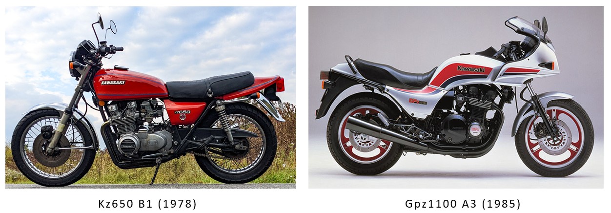 The winner: the tight, compact frame from the early Kz650 B1 (1976–1977 models), combined with the Gpz1100 A3 two-valve engine (1,089 cc, delivering around 100 plus