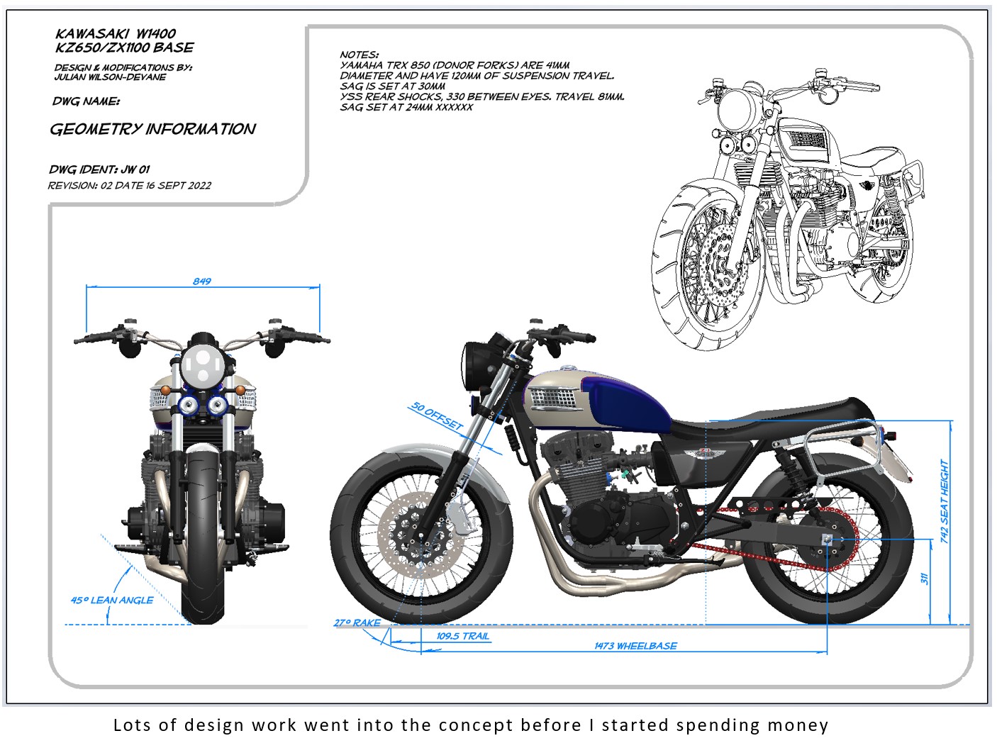 Compare the stock W800's geometry to the Kz650's and that of the ZX1100 in the table above. Culminating in my custom hybrid (W1400): tighter proportions for quicker