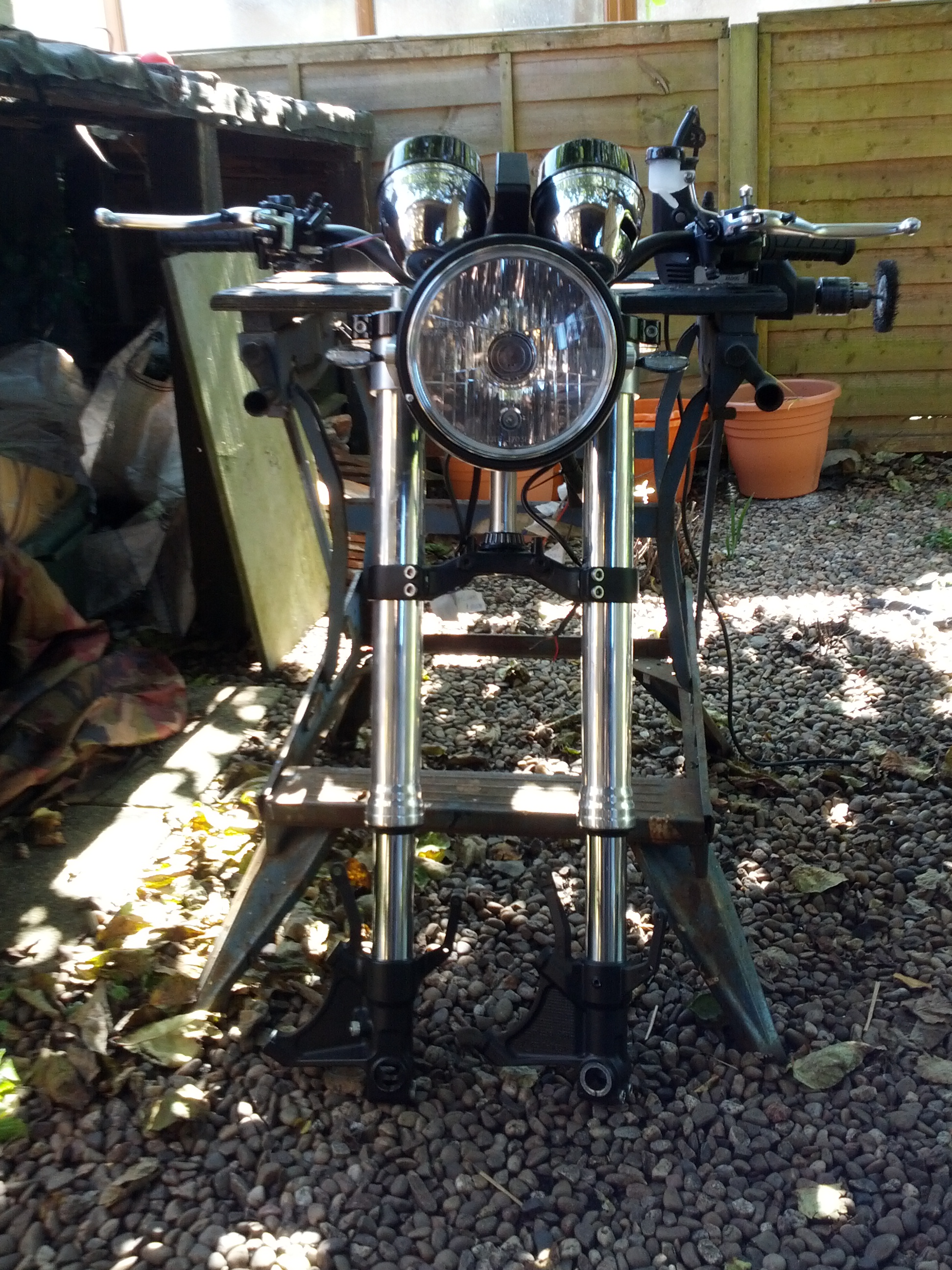 The forks i have got Mikey to polish at the moment. I have real doubts about the forks as i may have to lengthen them to get more ground clearance at the front. If i think i may have to do this i will have to make some tube extensions to screw in the top of the forks and lengthen the cartridge by the same amount. The end goal is to get the forks anodised black, but i have decided to wait until i have the whole bike built up and at least do some riding on it to decide how much the front end may need to be raised, then get the extensions machined and then send the whole lot off for anodising, so everything matches colour wise. I only want to do this once as the internal PTFE coated bushes will need to come out of the forks for anodisng and this looks like a prick of a job, and im sure the bushes wont be cheap either