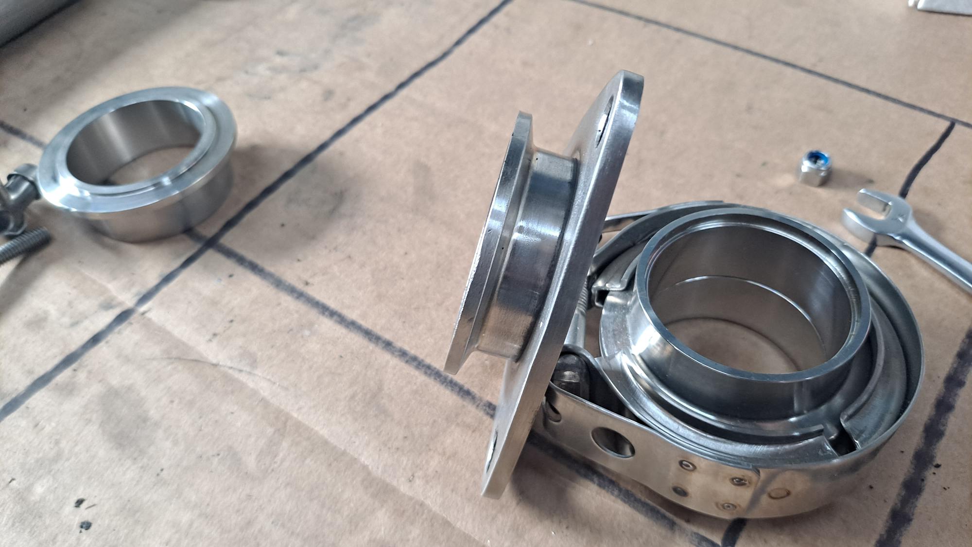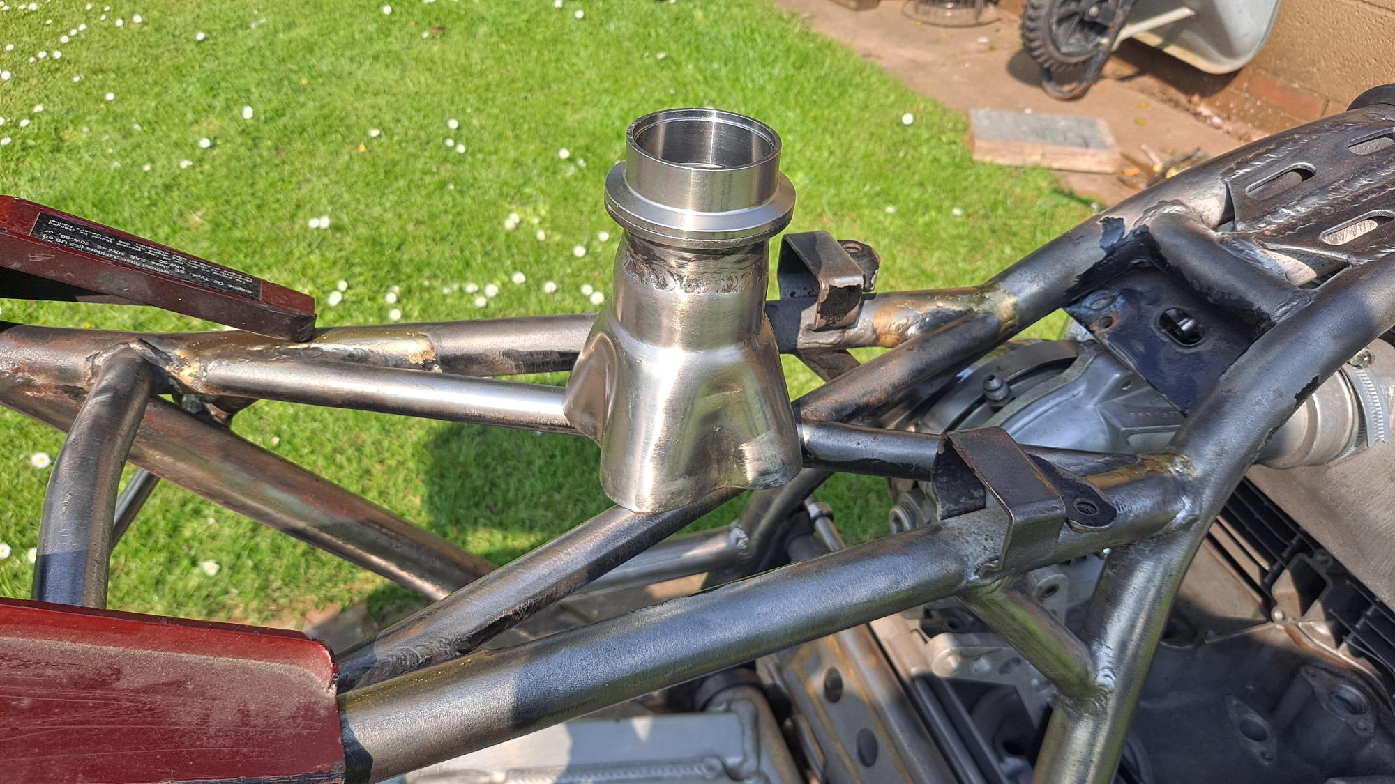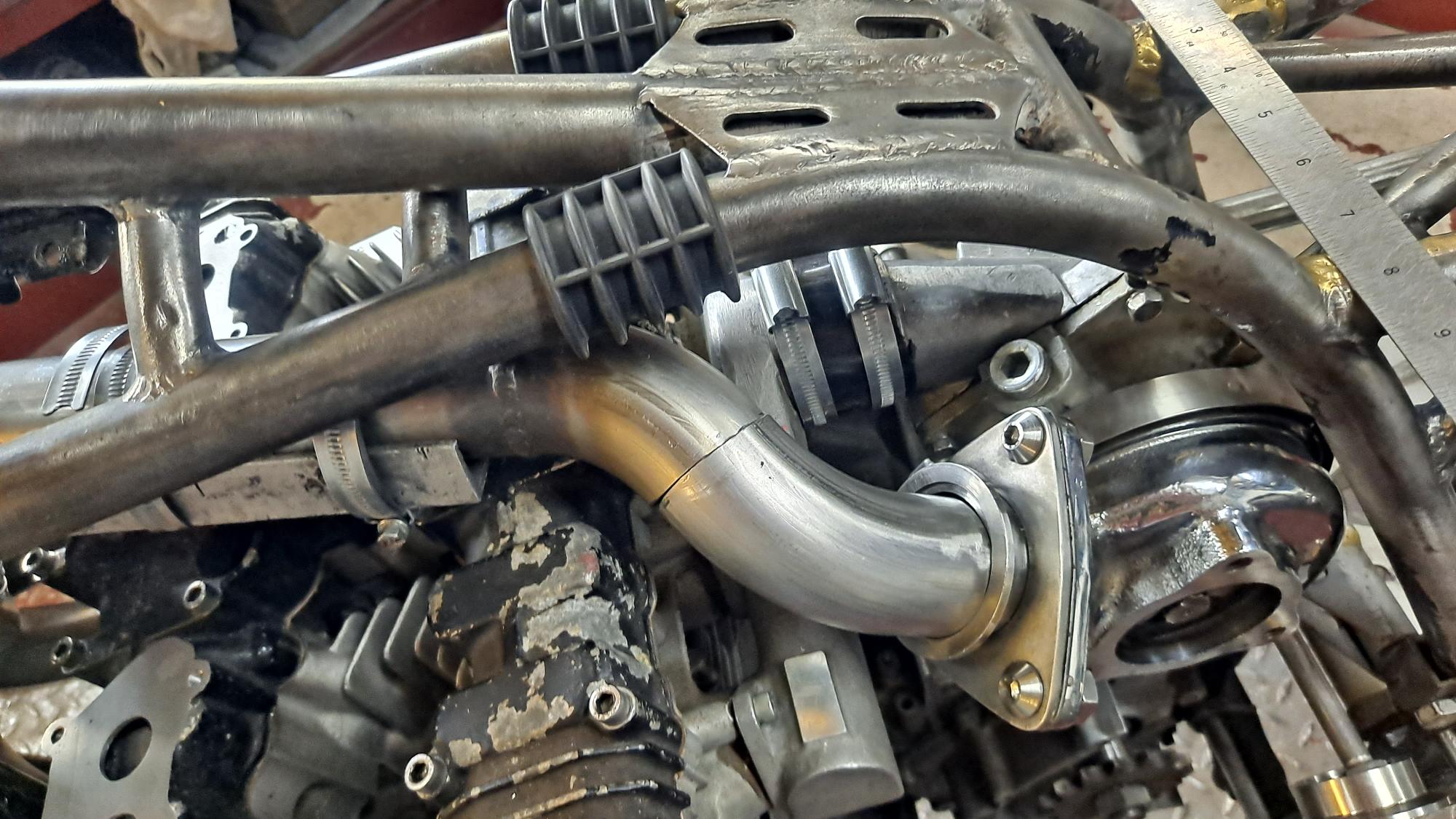 And the V band clamp ended up in the perfect spot with just enough clearance between the frame tubes to slip the retaining strap off.