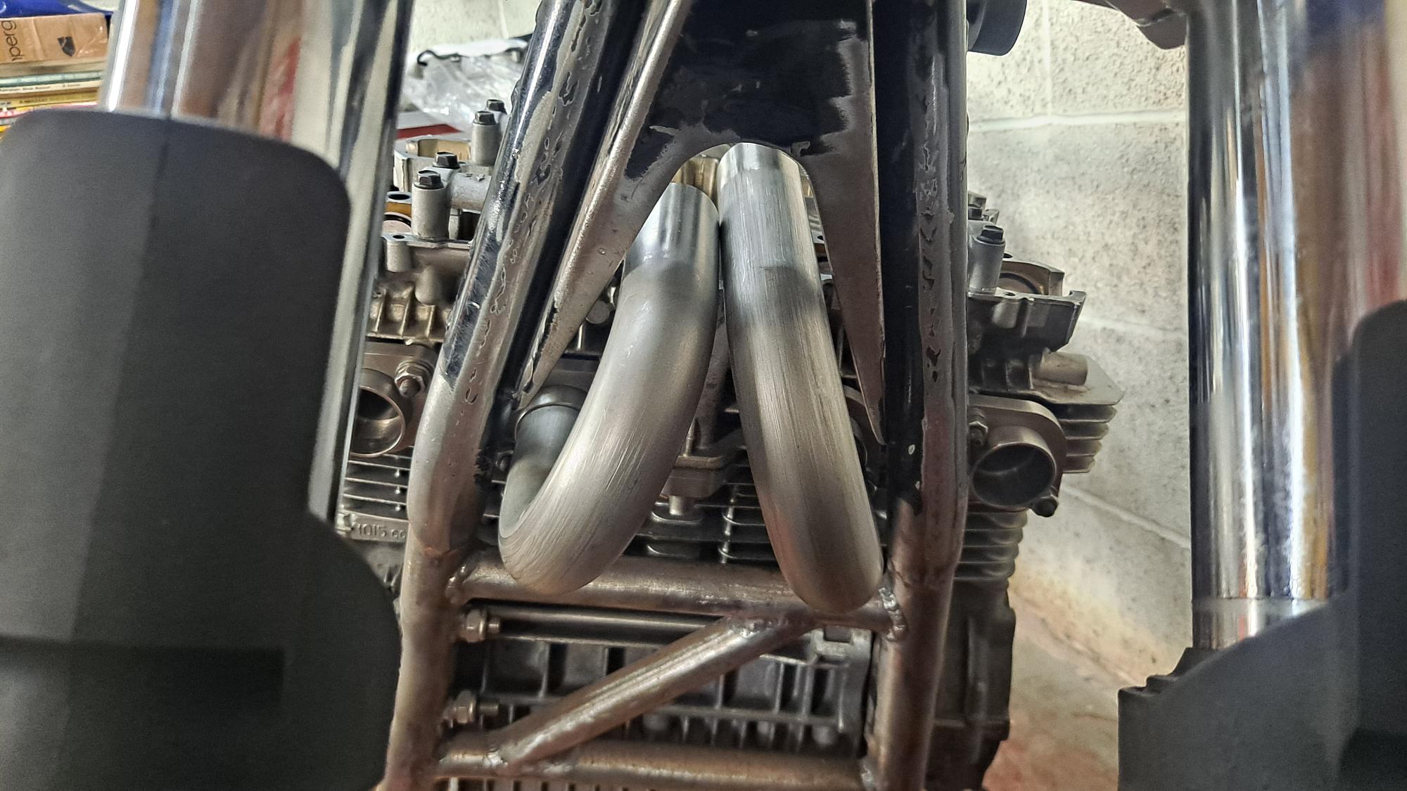 Plenty of room to snake 1 and 4 around the down tubes and up behind the midpipes and i think i've got half a chance of getting them close to equal length with the middle ones.