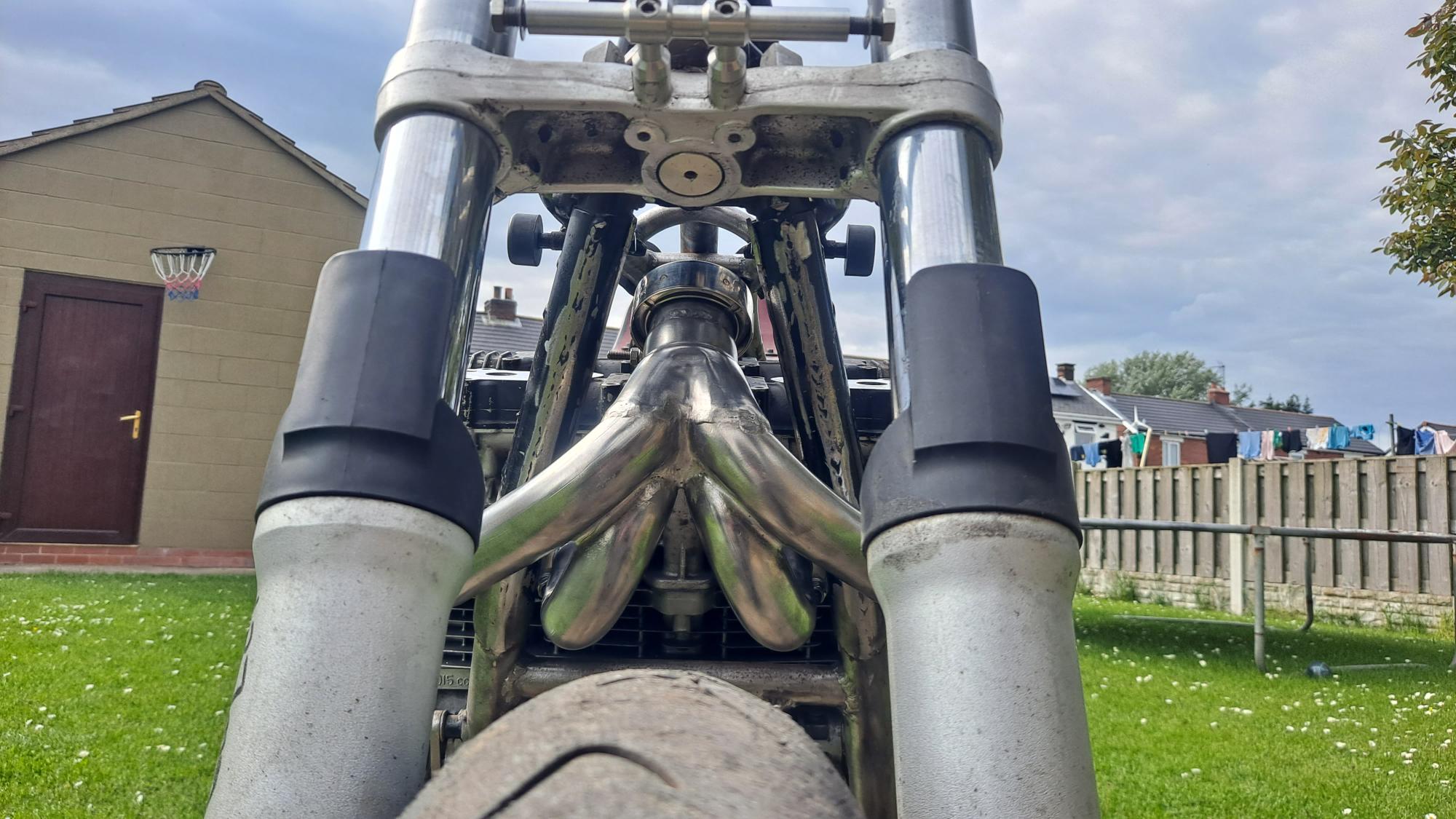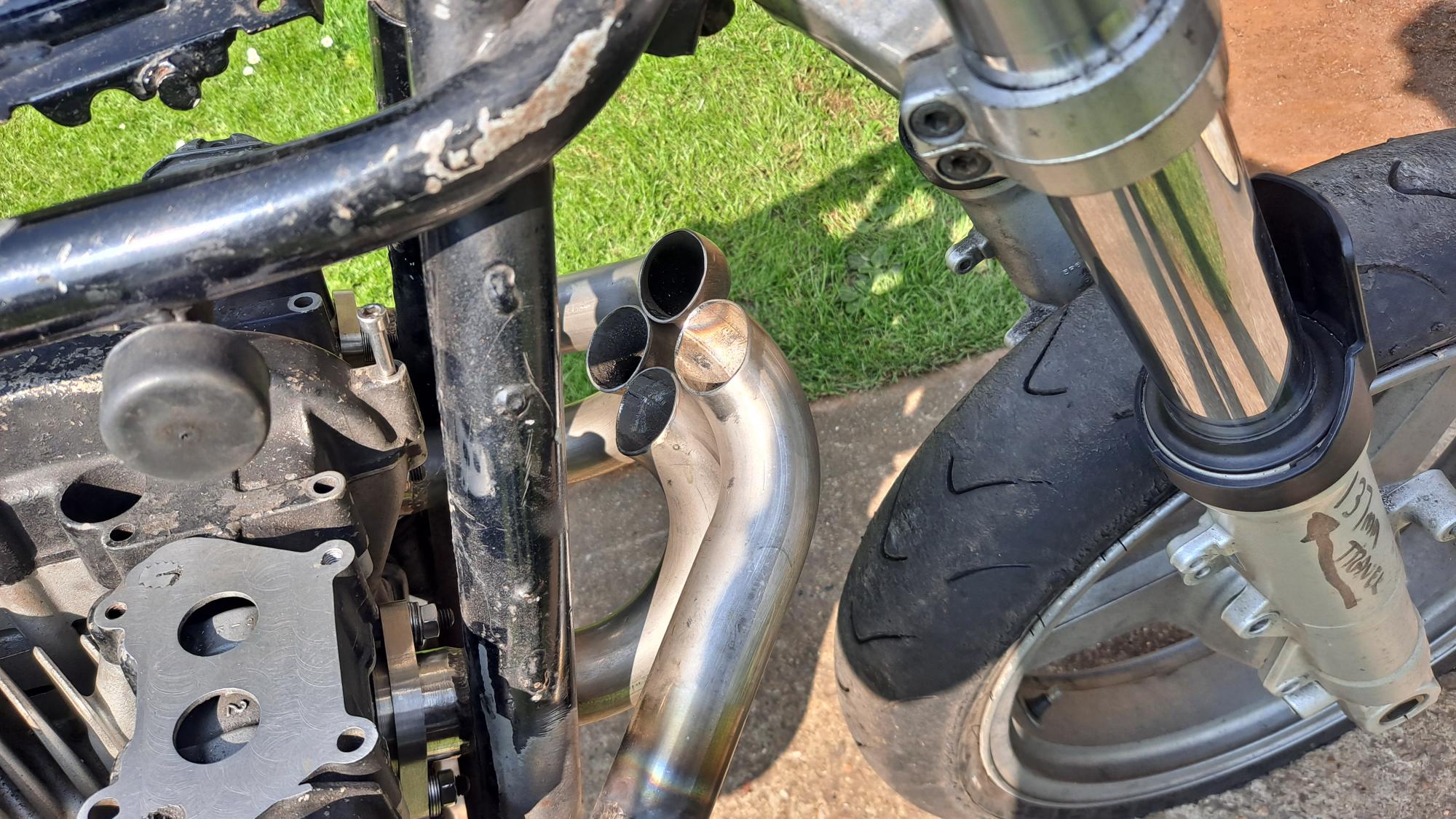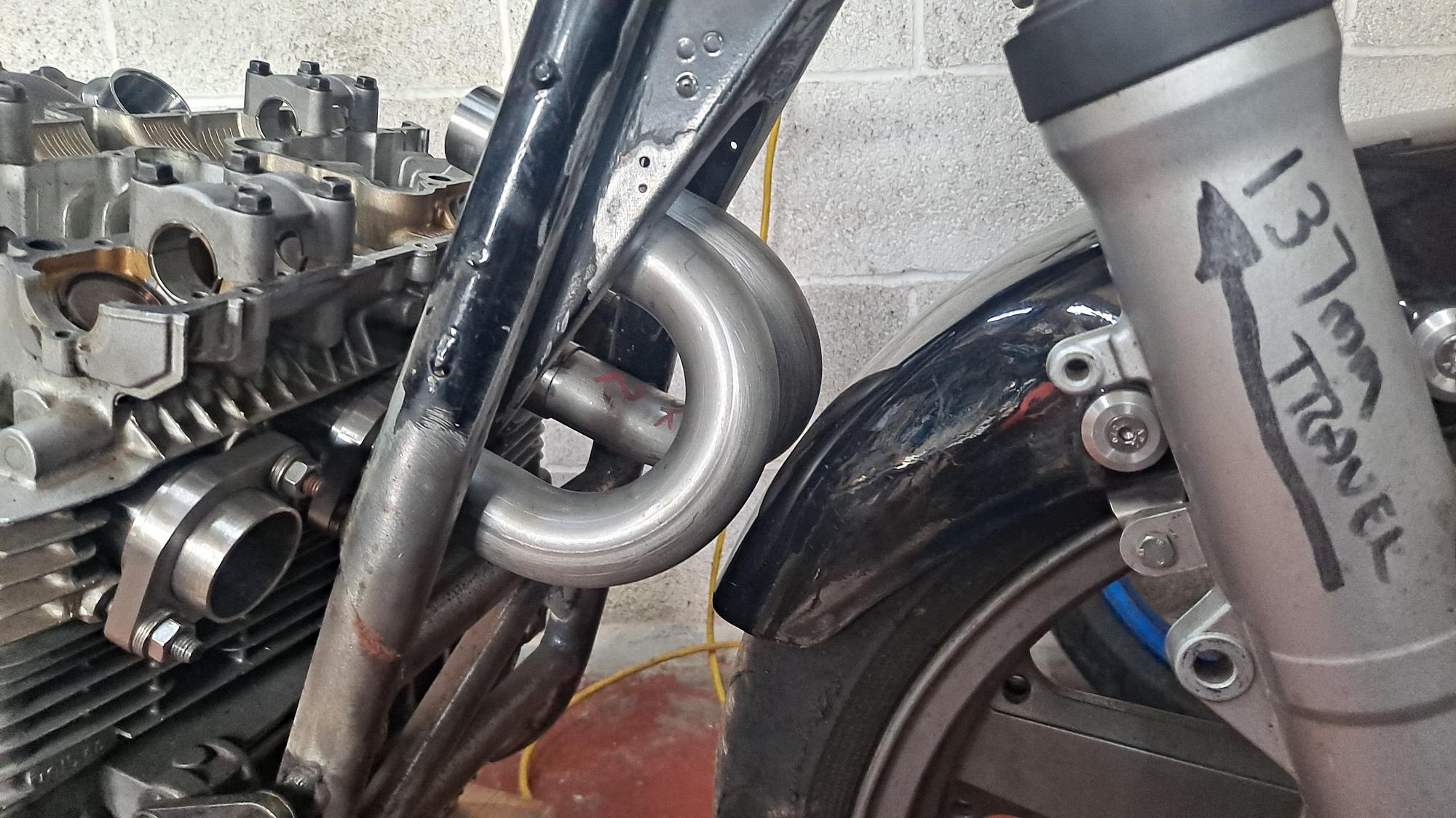 I want the pipe to take the shortest route to reduce lag as much as possible so i've dropped the FJR forks in the yokes by the maximum amount of their 137mm fork travel which shows me how much room above and behind the mudguard i have to work with.