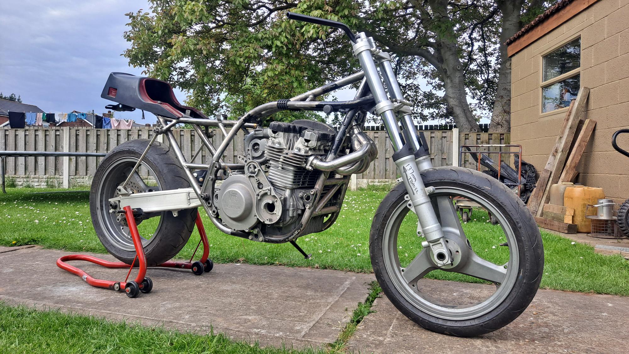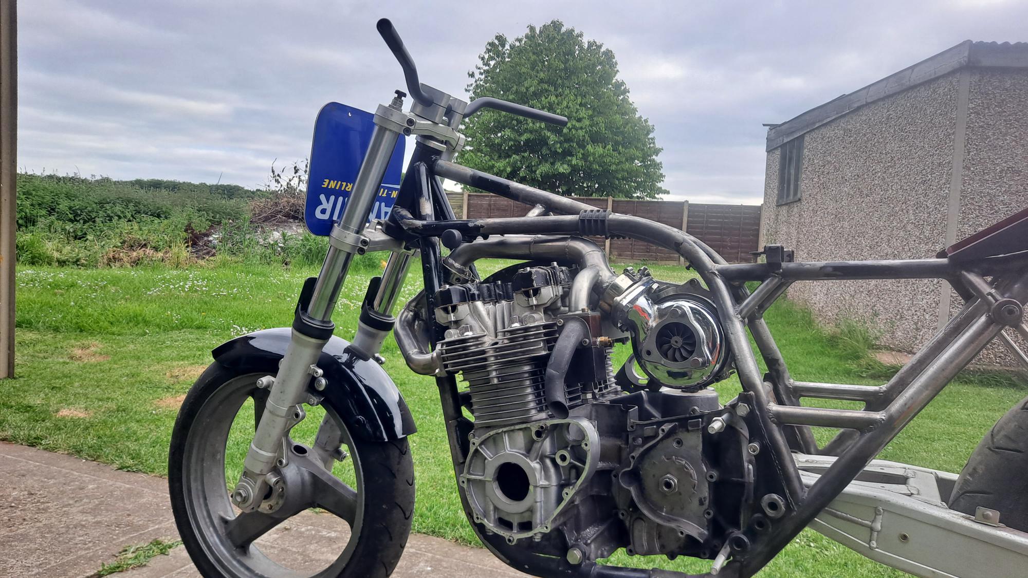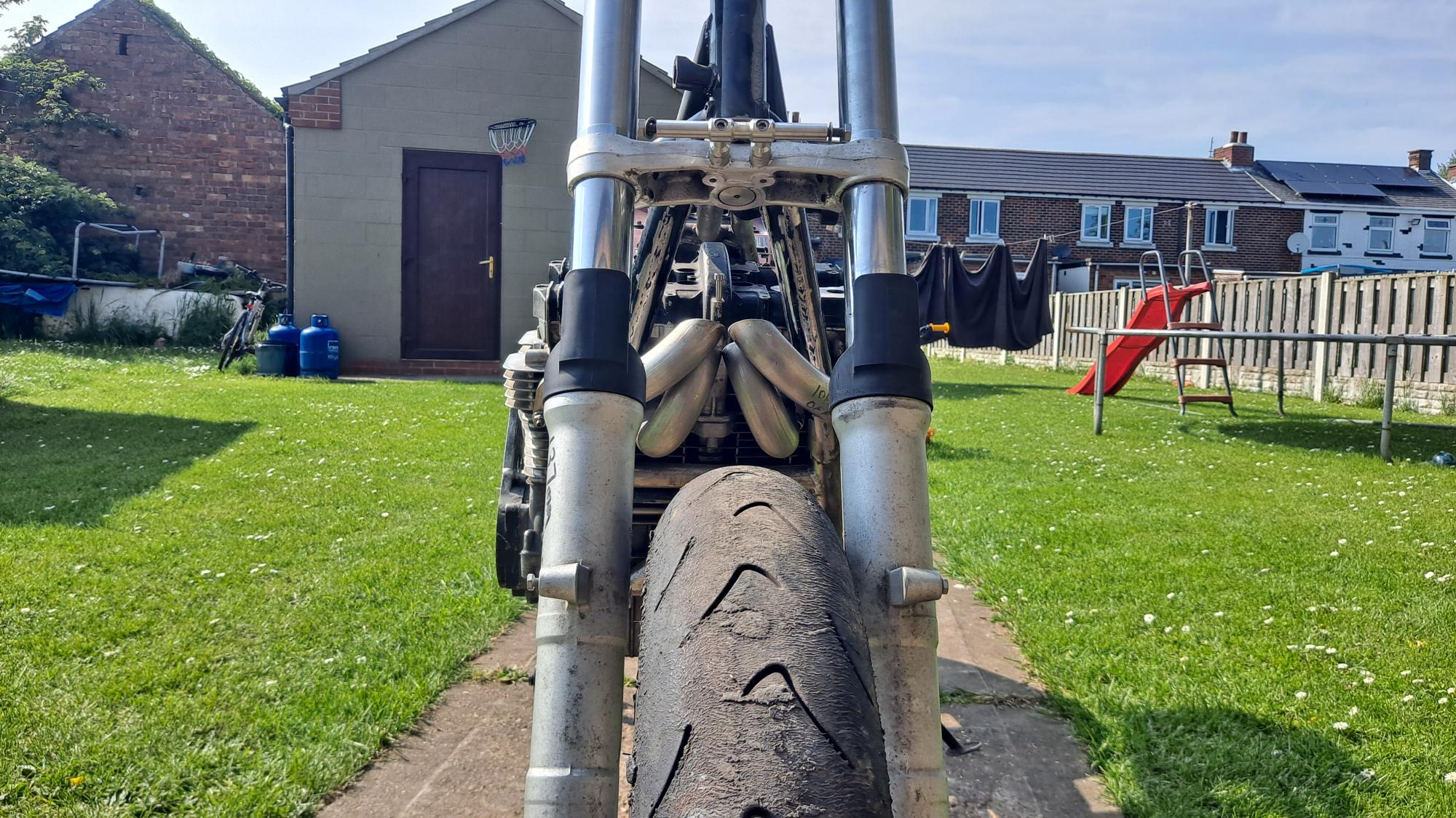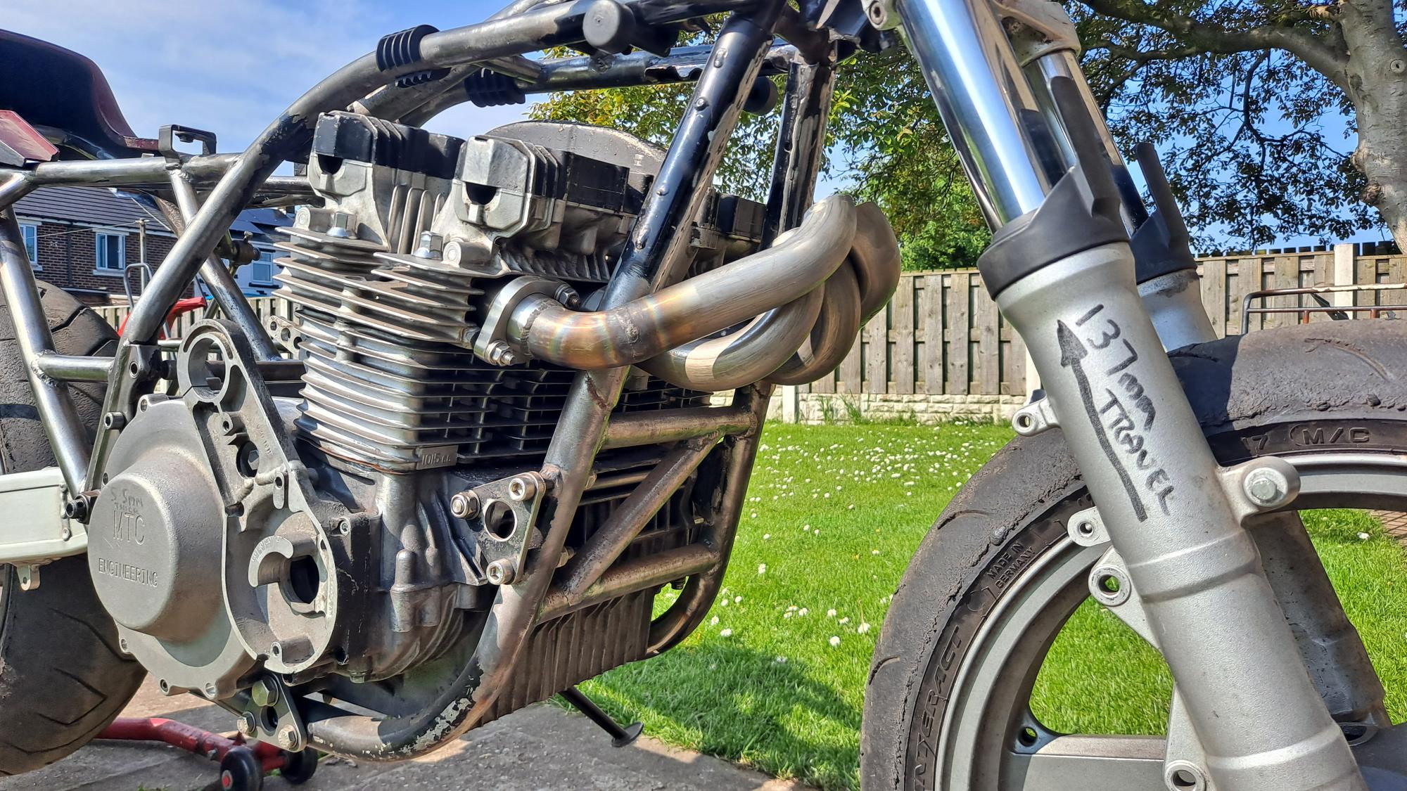 I want the pipe to take the shortest route to reduce lag as much as possible so i've dropped the FJR forks in the yokes by the maximum amount of their 137mm fork travel which shows me how much room above and behind the mudguard i have to work with.