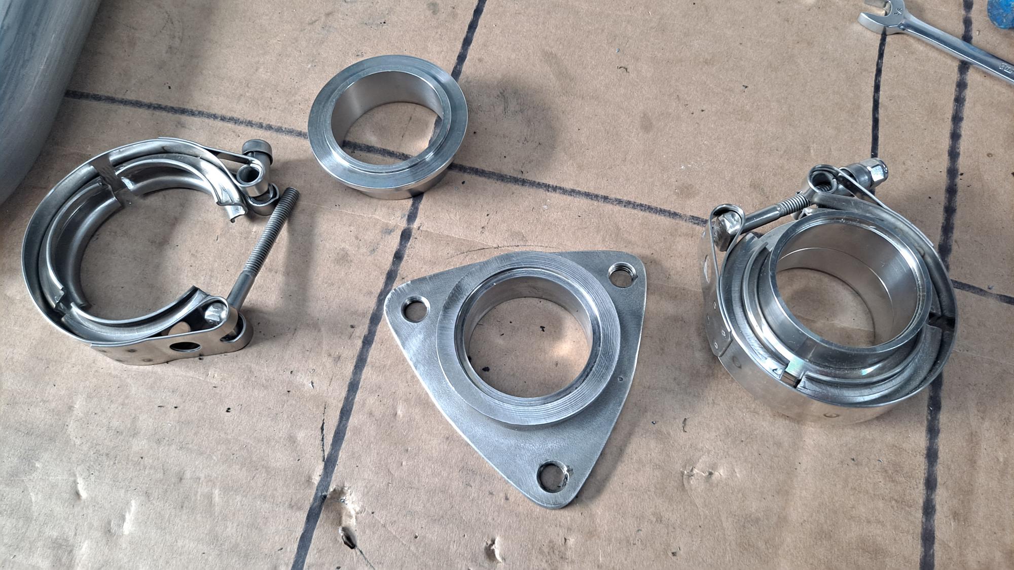 Another piece of 5mm stainless plate bored and shaped with the same method as the exhaust can mount, then one half of a v band connecter pressed in half way and welded on around the inside which was machined smooth to blend in with the bore and faced off on the back for the gasket..