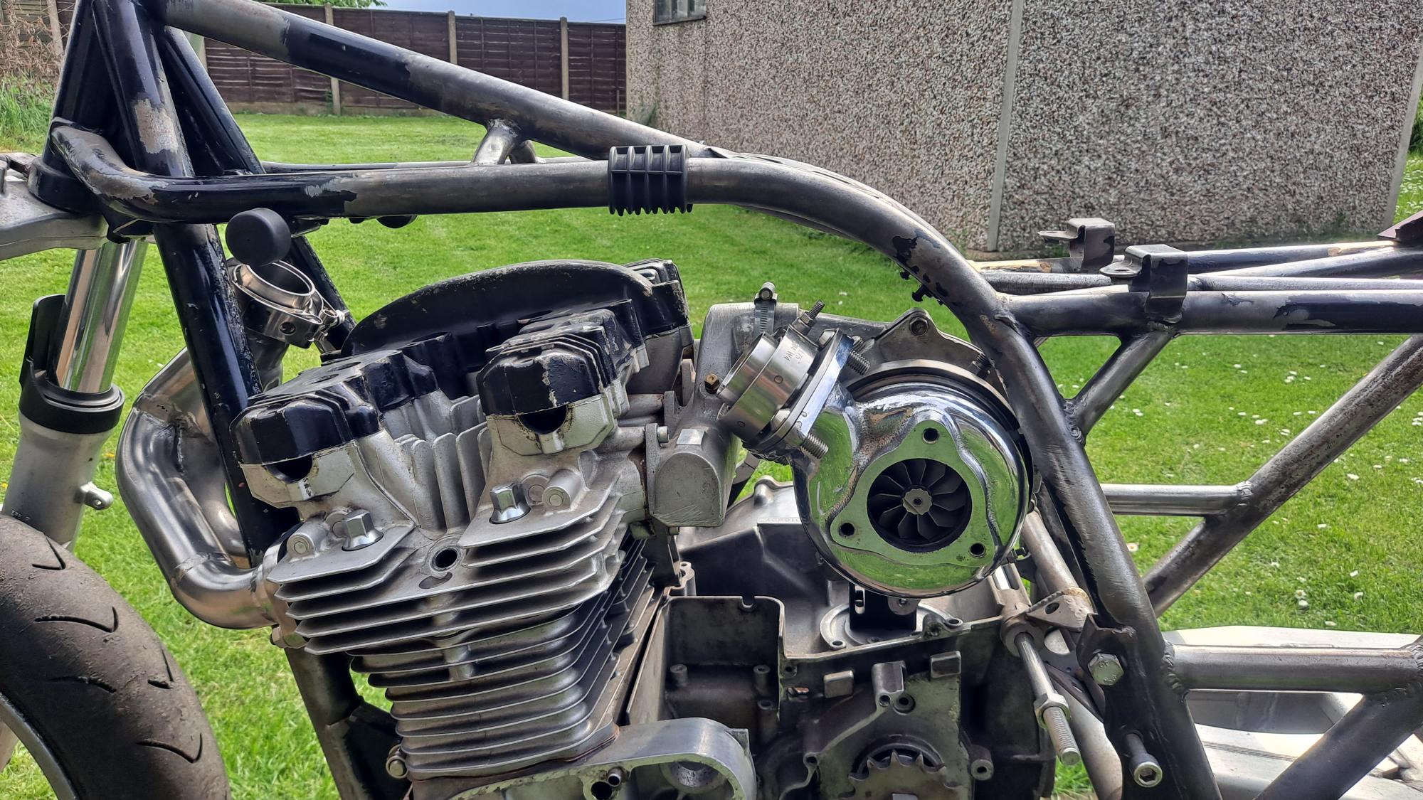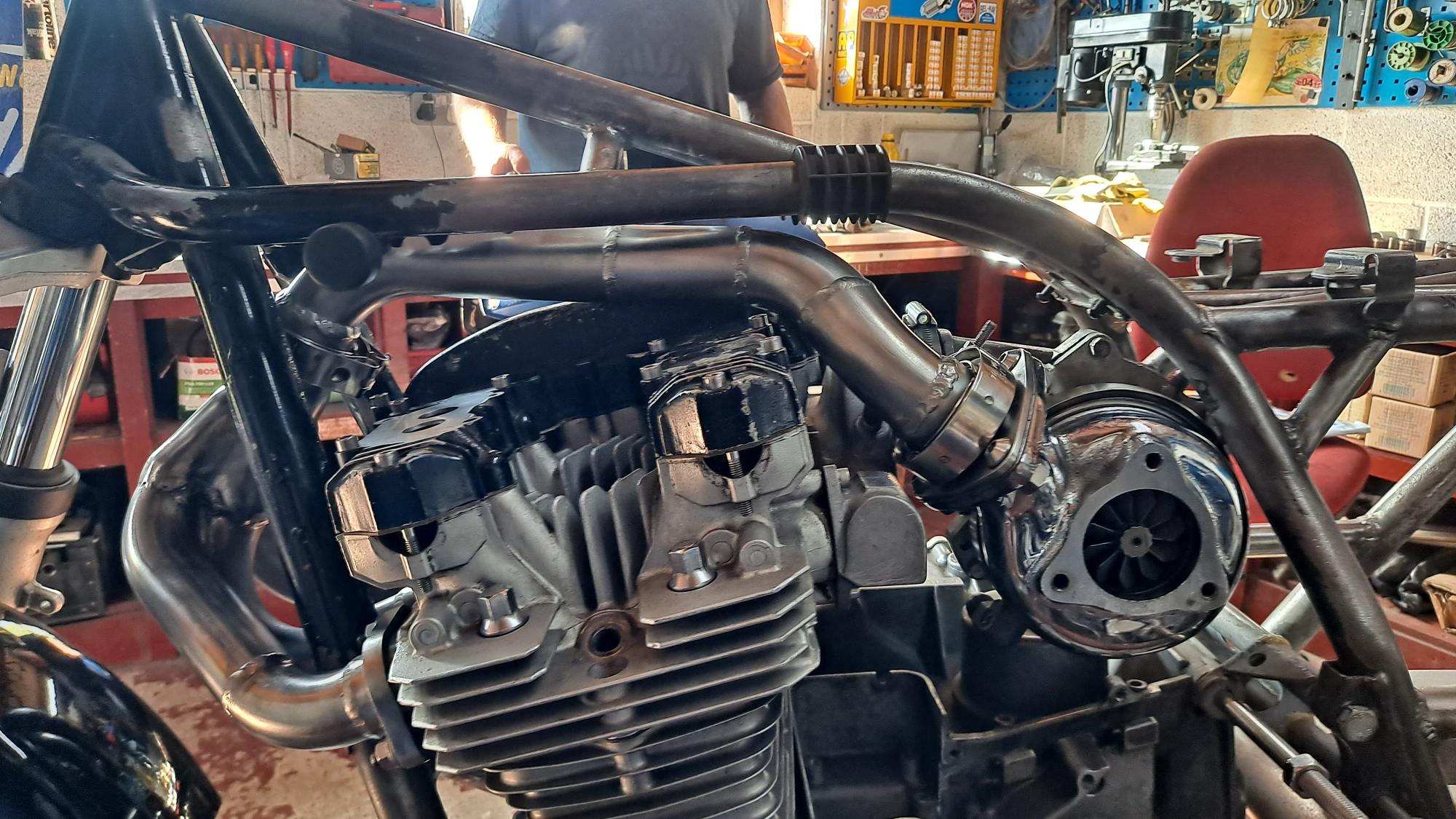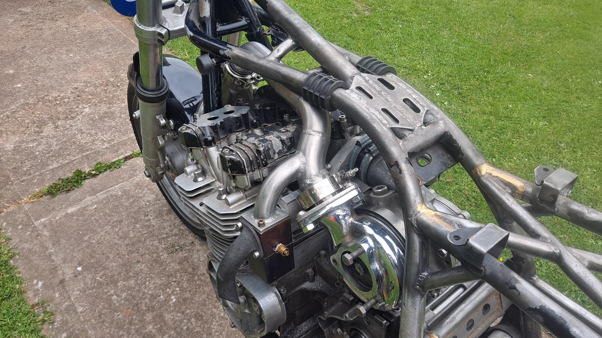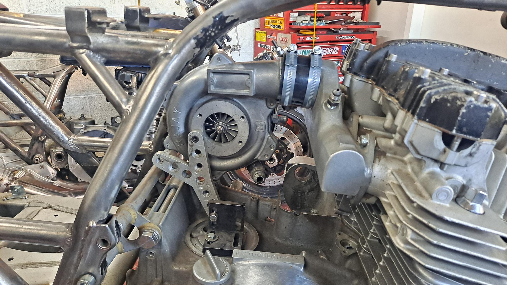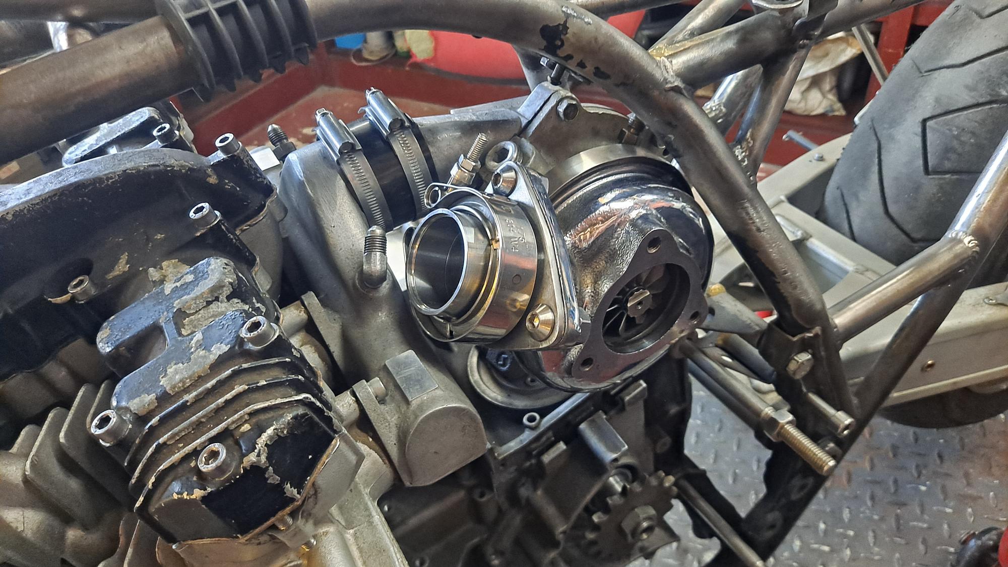 Dry built the bare motor with some slighty thicker head and base gaskets etc and Jigged up the turbo square to the frame centerline and vertical to the engine with enough clearance fore and aft to allow for exhaust gaskets if needed.