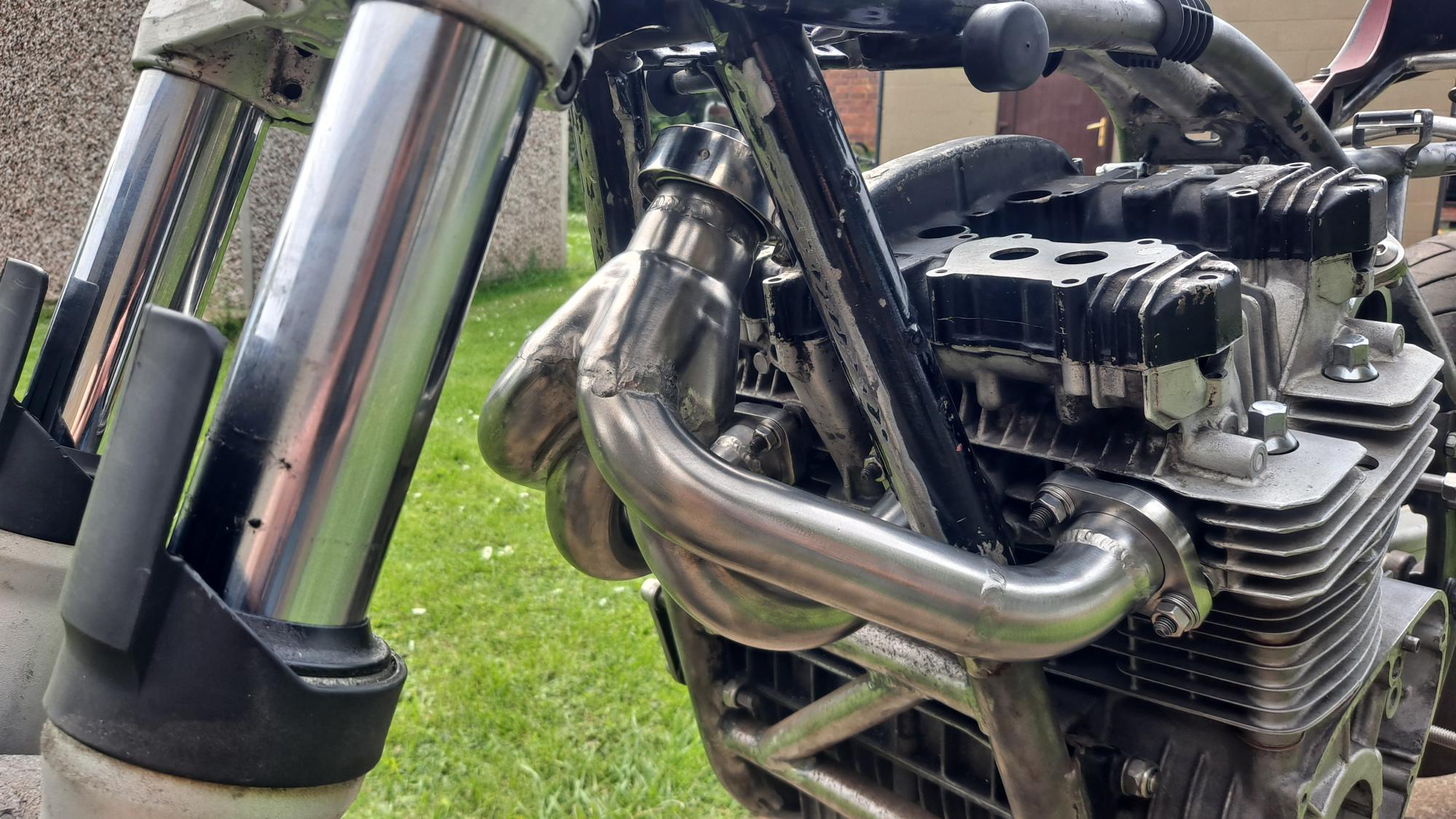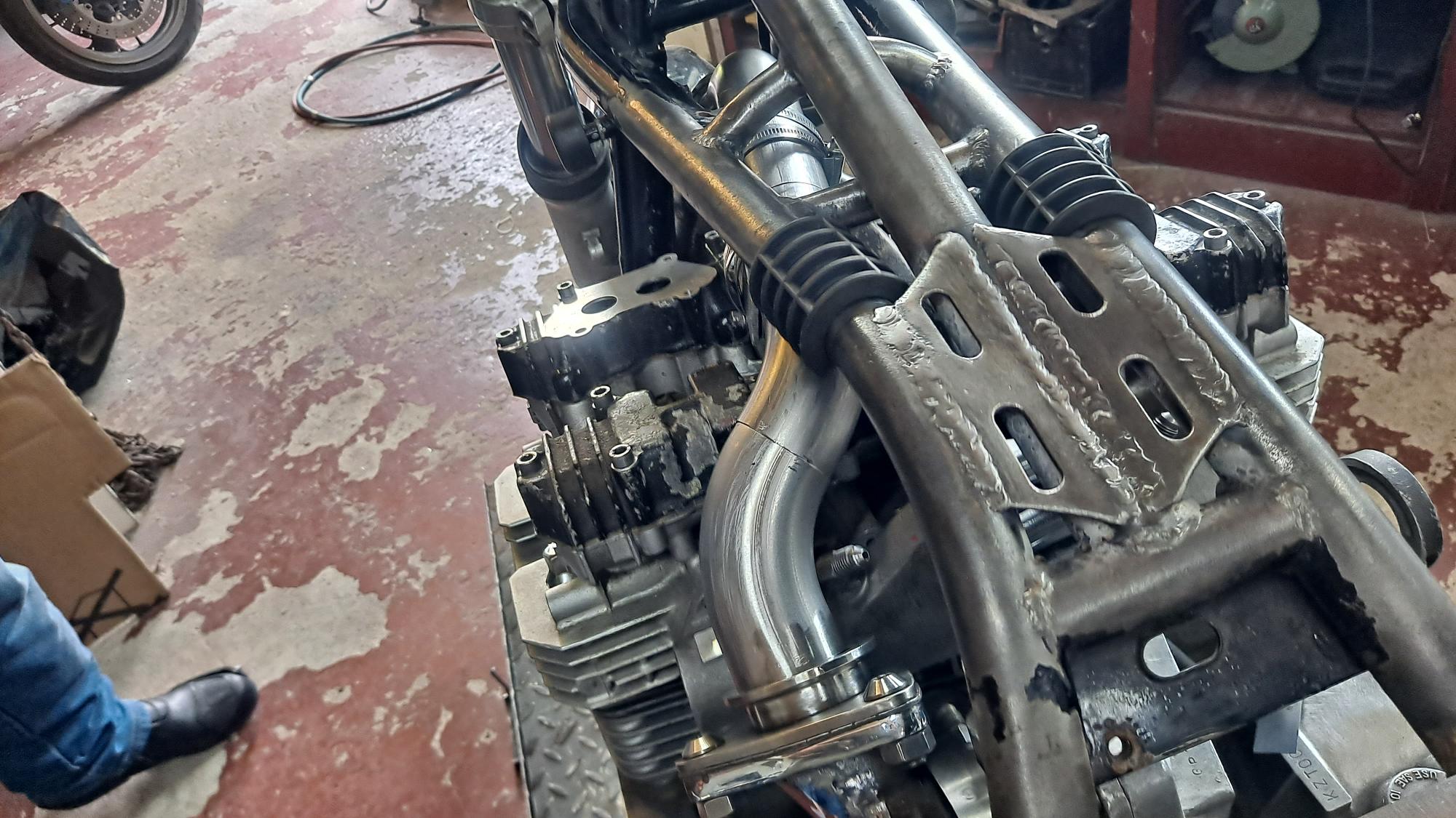 Now to see if i can make this a 4-1 that meets a link pipe v band connector somewhere near where the horn used to live :ooer
