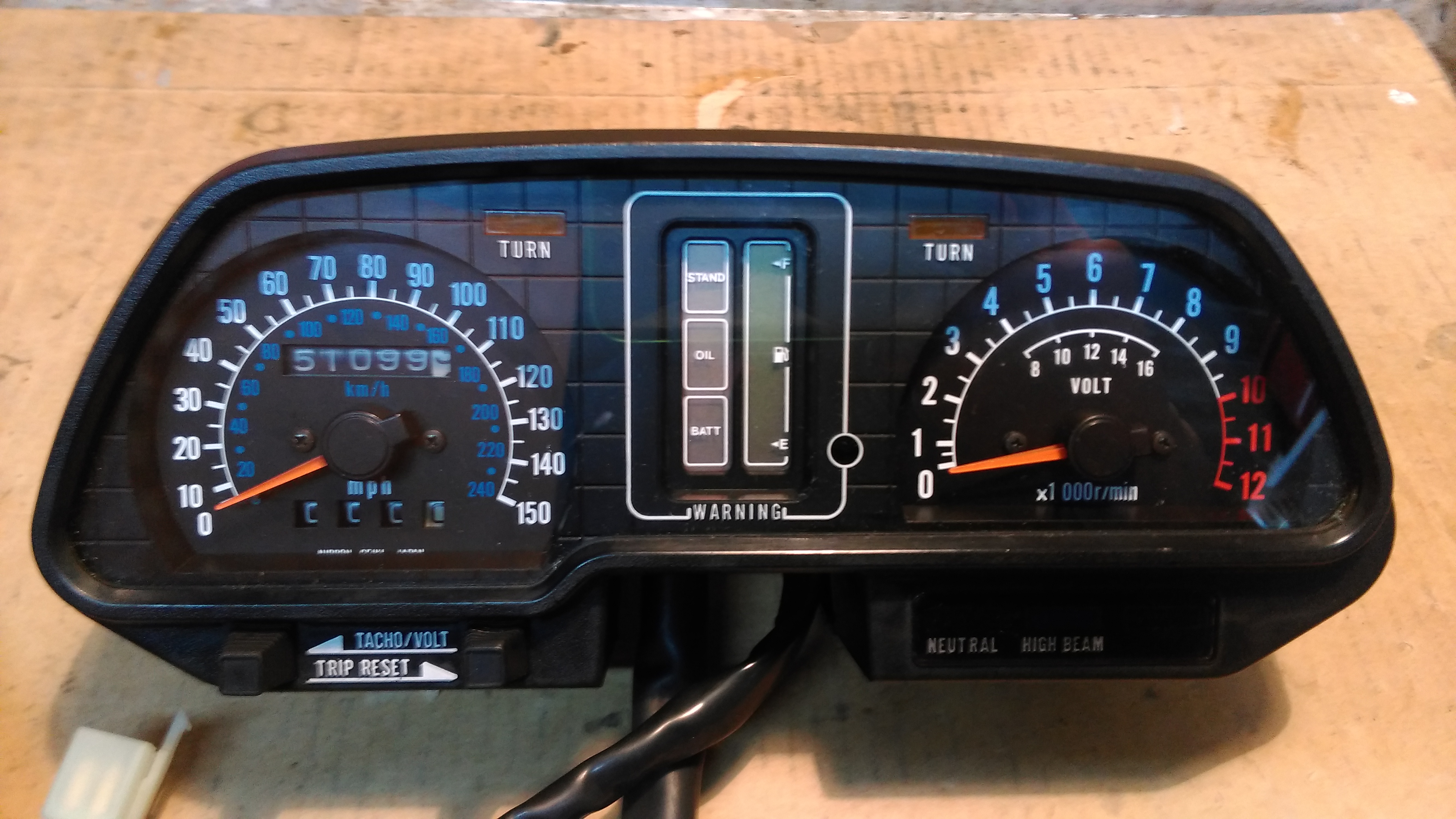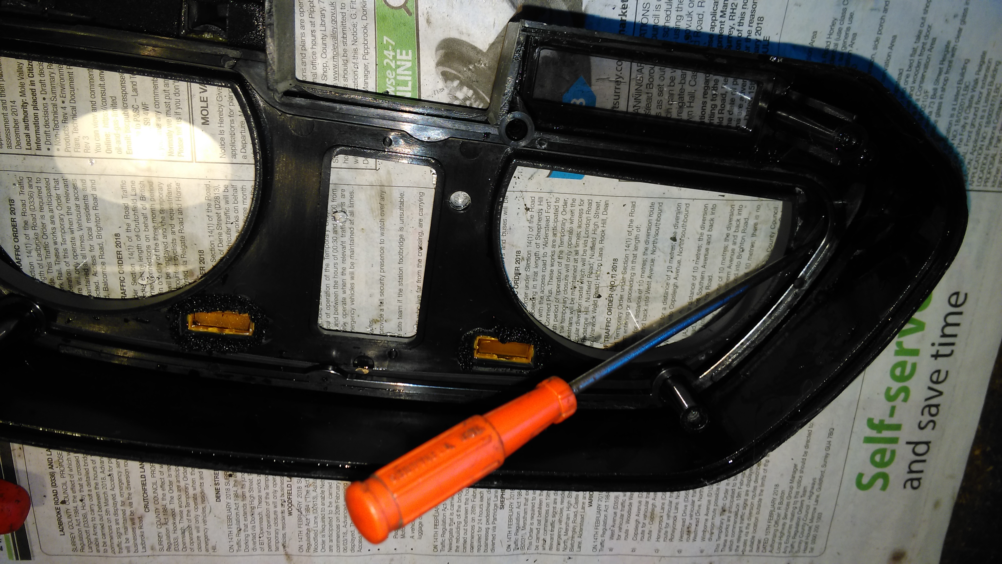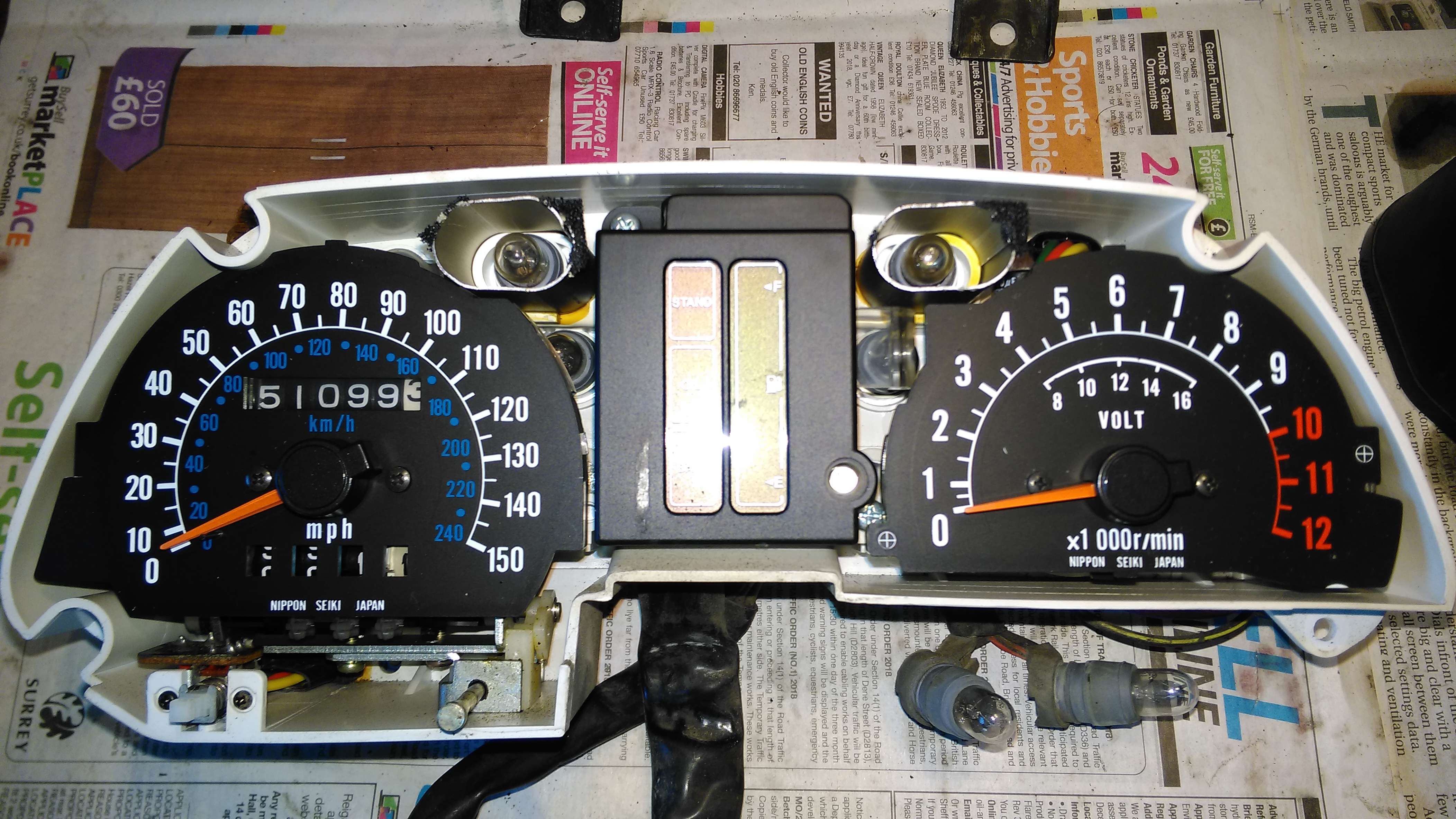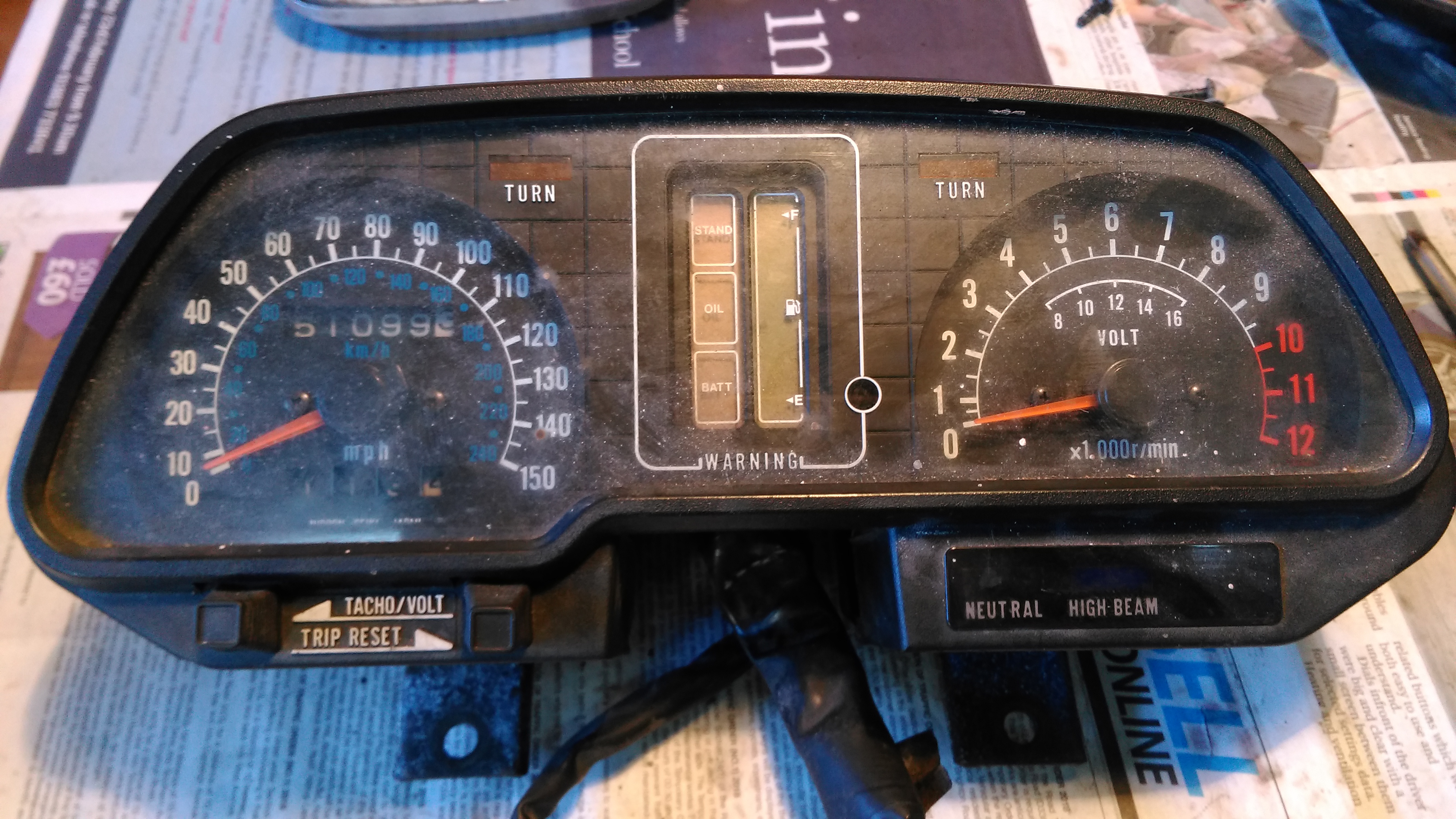 I've also stripped and cleaned the clocks as they were looking tatty. The worst part of this was removing the inner strip that holds in the clear plastic face panel. Some judicious use of a small screwdriver persuaded it to part company so I could clean it thoroughly. Reassembly wasn't too bad, just fiddly. I didn't zero the milage as I want to keep the history of the bike intact where I can.