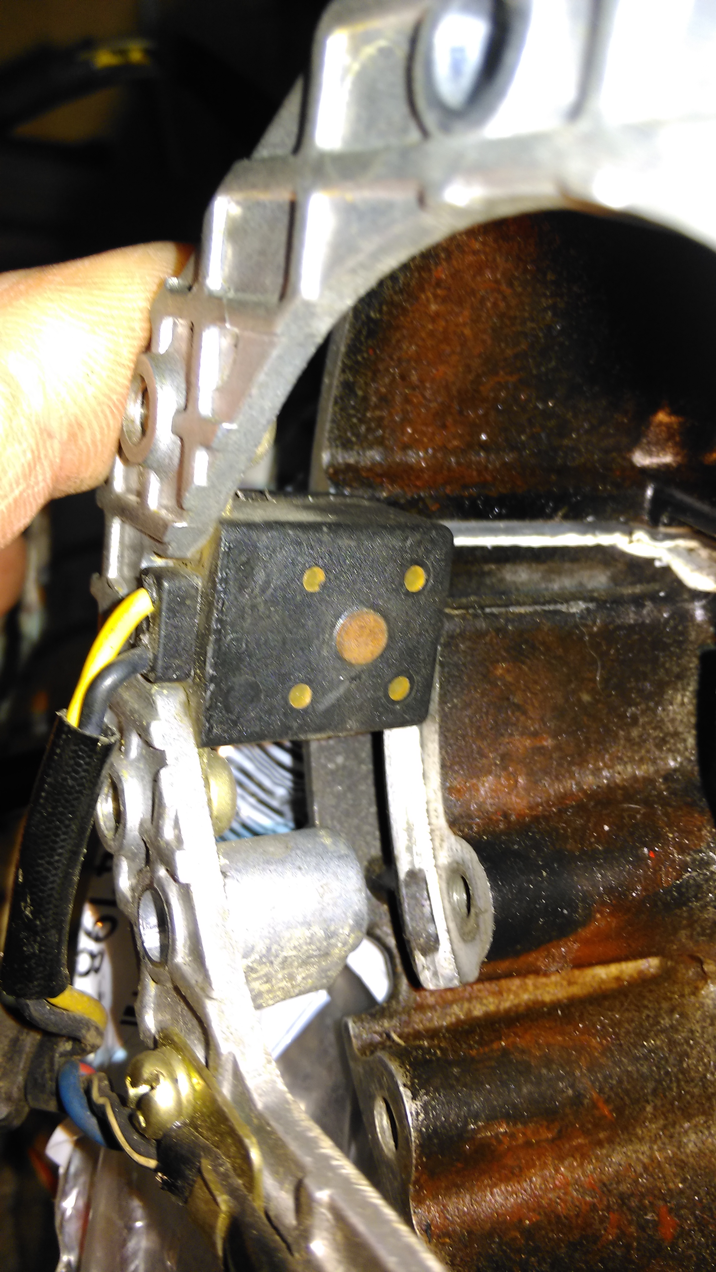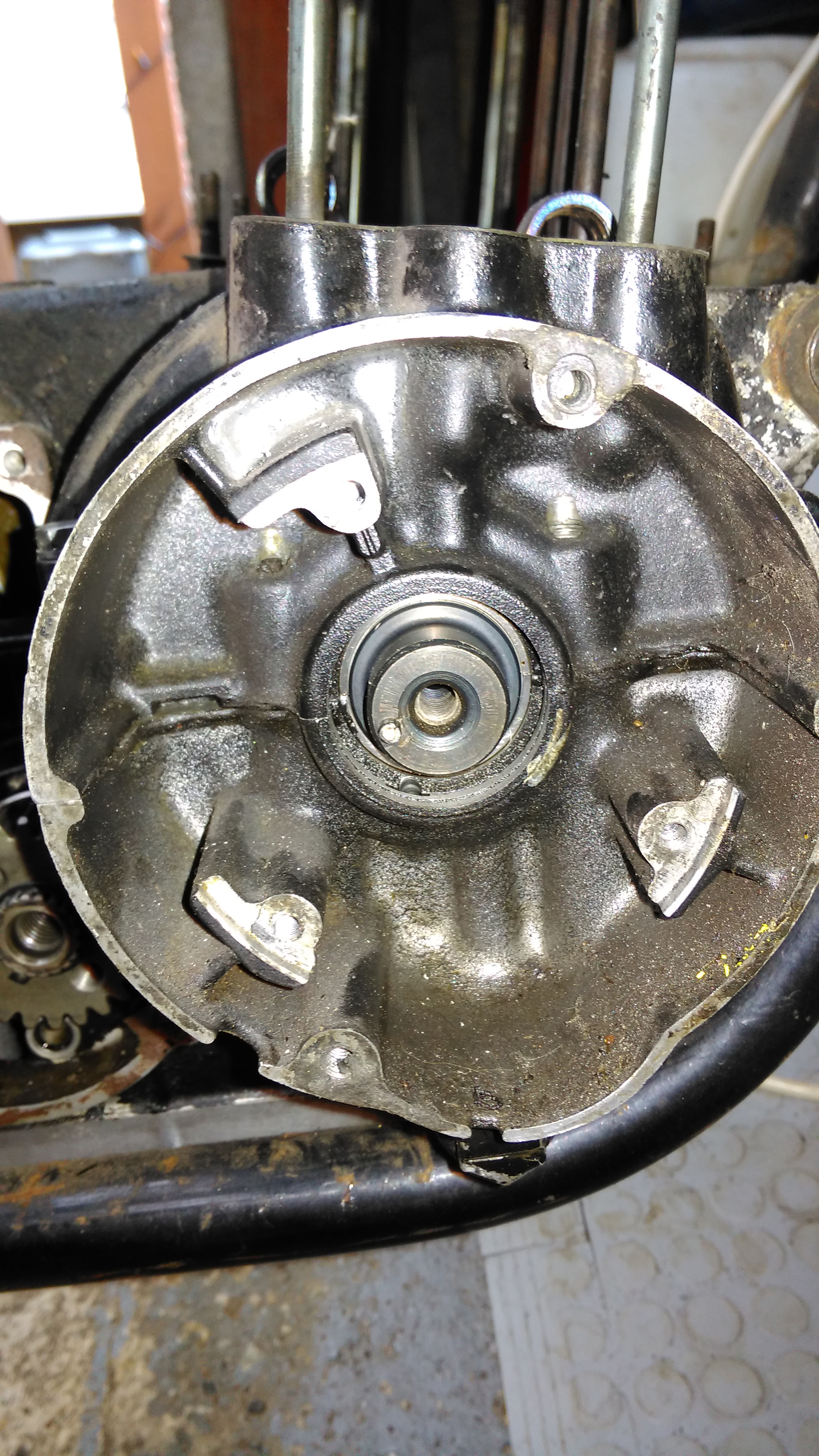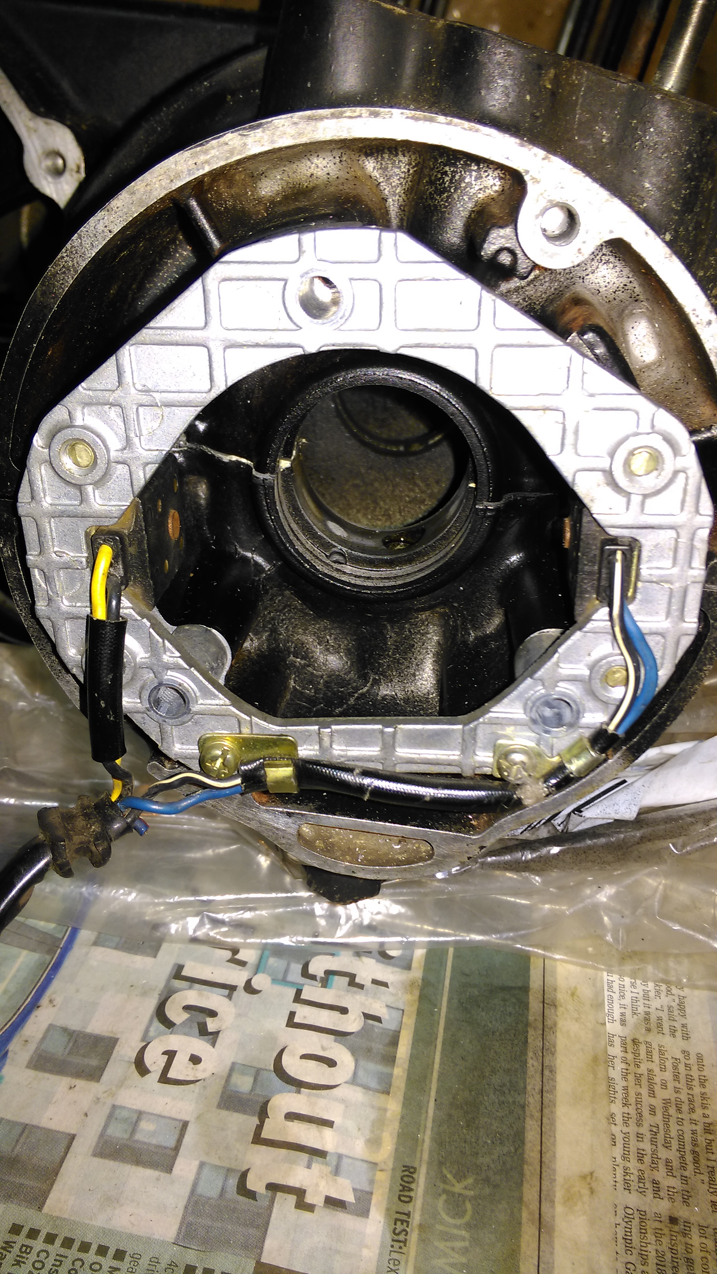 The first modification I wanted to do on the engine, was to replace the "H" GPz ignition plate & bob weight for the advance retard, with the later "A" series static pickup plate & CDI box. The newer CDi has the advance curve built in and also has a rev limiter, which the standard "H" ignition doesn't. I've done this successfully on the GPz750 motor in my P&M and that was a straight swap - not so with the 550 ! When trying to fit the later pickup plate it was fouling on the webs used for the original plate.