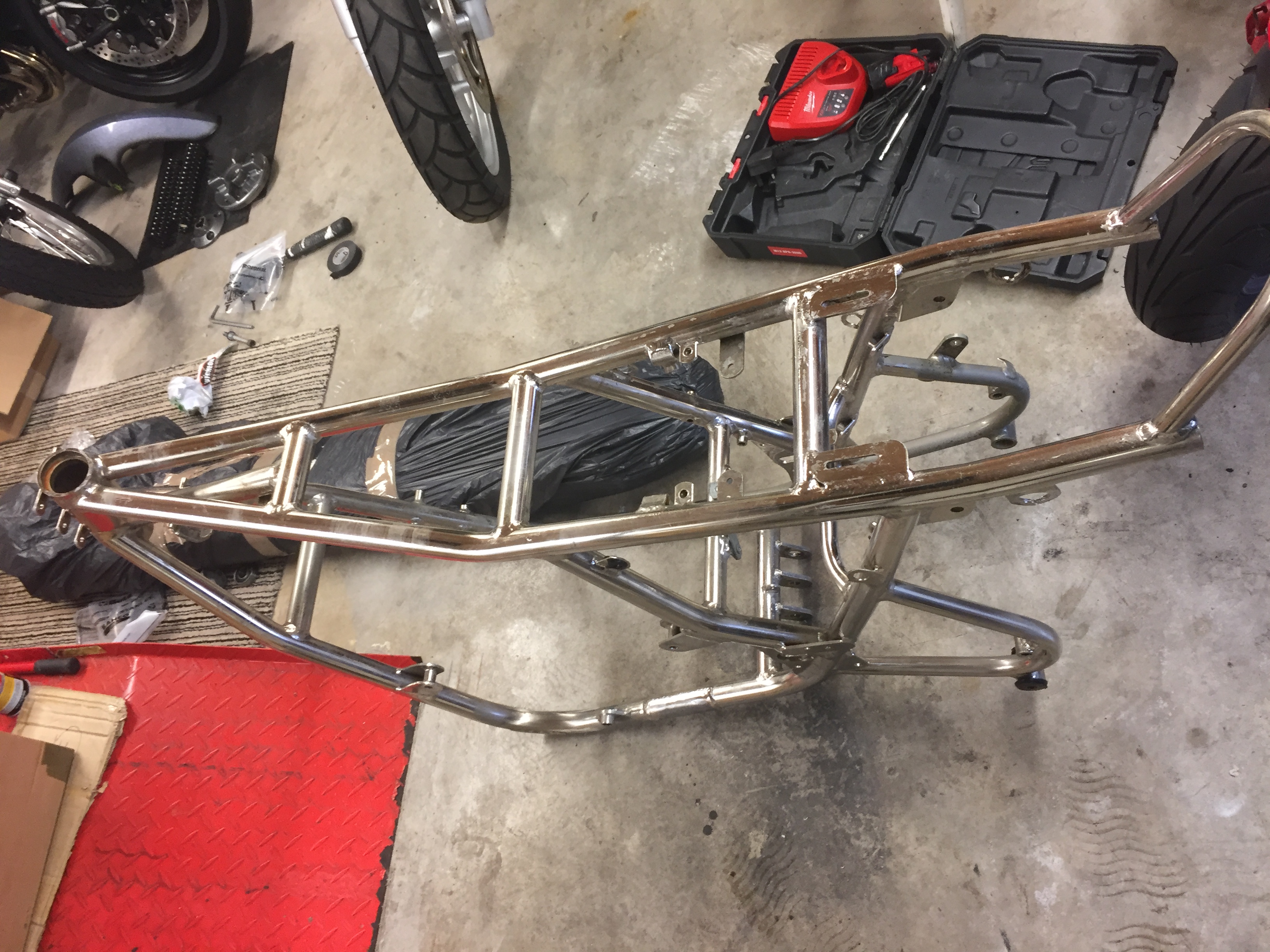 RAYZ1 wrote:Some bling back,, from Doug Taylor Bristol I’ve got some heat insulating paint for the exhaust inner face to stop blueing, frost sell it , can only go on clean metal so now is time to do it , will it work ? Log header is quite thin, re nickel on swinging arm looks awesome , so if frame doesn’t polish up it will get same treatment, so that would add 2 months to build and another 1k