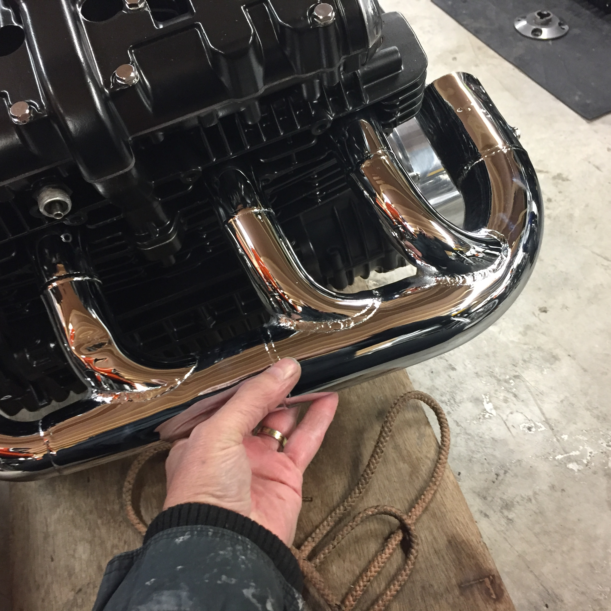 , from Doug Taylor Bristol I’ve got some heat insulating paint for the exhaust inner face to stop blueing, frost sell it , can only go on clean metal so now is time to do it , will it work ? Log header is quite thin, re nickel on swinging arm looks awesome , so if frame doesn’t polish up it will get same treatment, so that would add 2 months to build and another 1k