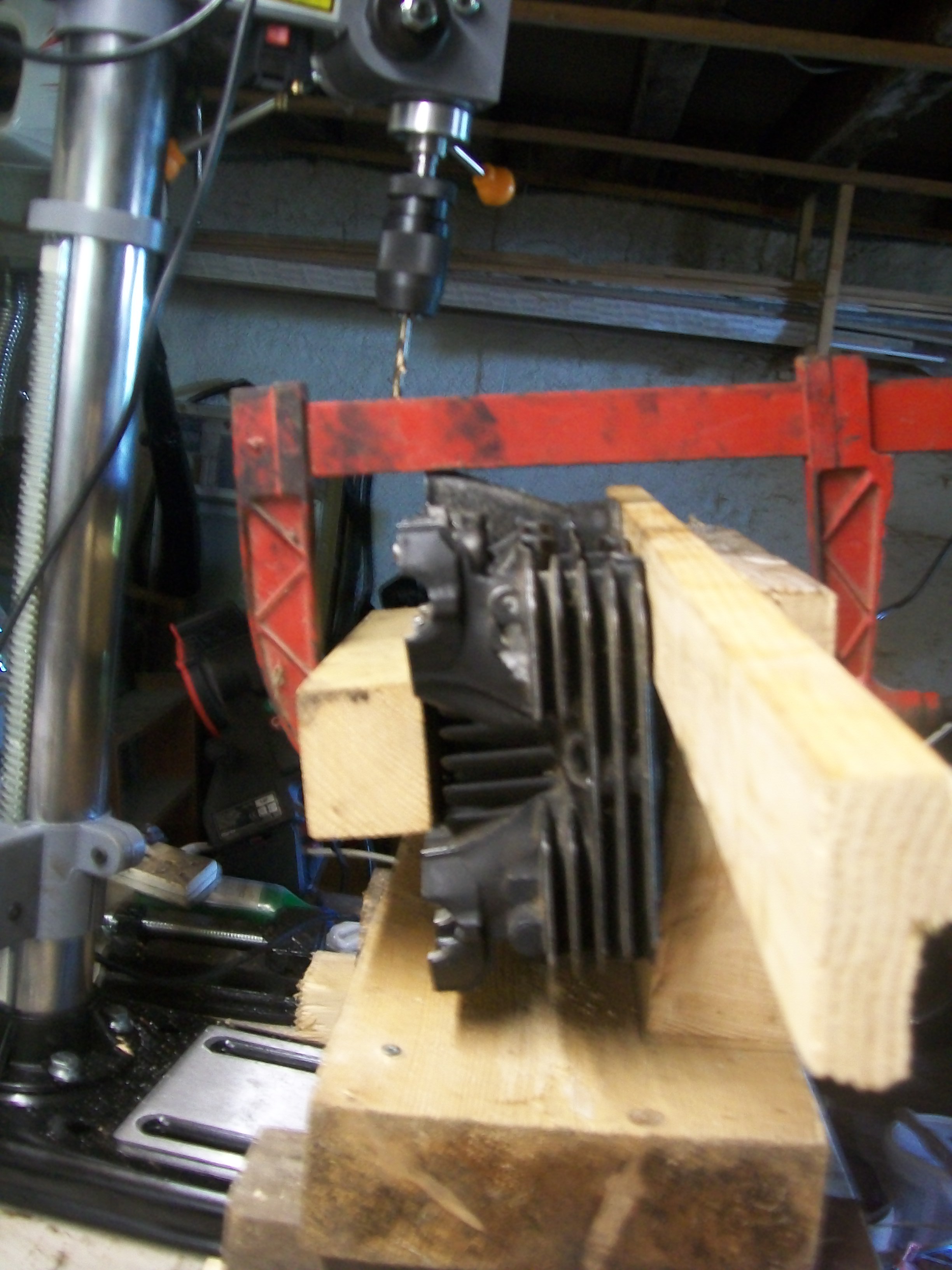 Small update, but many hours. The spare head had it's sheared exhaust studs sorted. The two the were already sheared were drilled and tapped, No.2 cylinder, top stud didn't want to go, sheared leaving me 20mm, then the welder packed up, went up my mate's, welded a nut on, loads of heat, sheared again. So it got cut off, drilled and tapped, using my Heath Robinson jig to make sure the angles were correct.