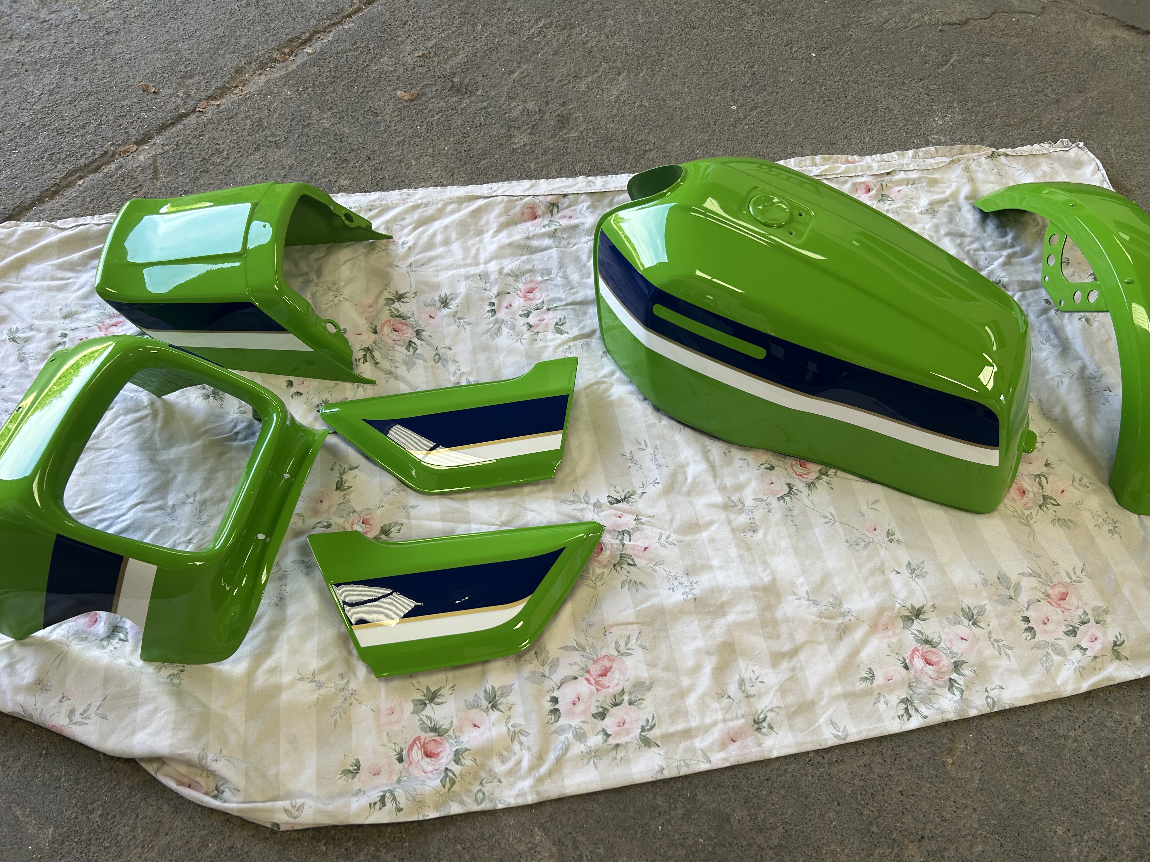Skid Mark wrote:Well, at long last I got the body work completed. The decals are a little short around the edges of the bikini fairing and the tank, but the paintwork is spot on and I'm not going to loss sleep over something the vast majority would not notice. One word of advice, don't get decals until you are ready to paint. I got mine a while back and when the sprayer went to fit them the gold stip stuck to the backing paper, turns out the post mark on the envelope was 2022! I only have myself to blame, and the spray painter wasted no time and just ordered a new set, which was fair enough.