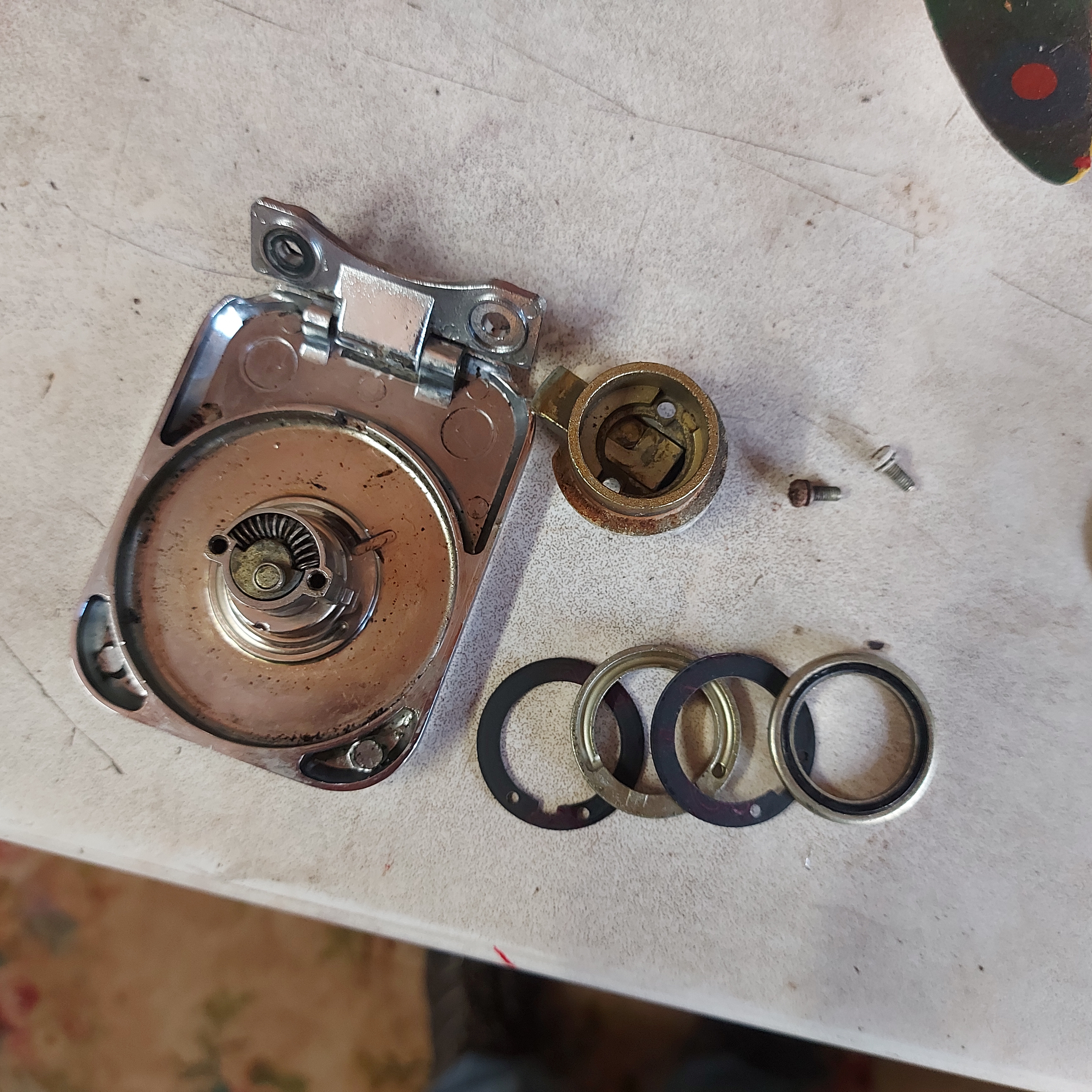 the lid and the parts looks not bad - air comes in the keyhole, through the barrel, into the channel cast in the lid that goes from 7 o'clock on your picture, clockwise to 5 o'clock to the slot in the casting leading outwards, thru one of the holes in the 1st gasket, round the channel cast in the top ring in the pile , thru the hole in the 2nd gasket and then onward to the interior of the tank ( can't see a channel in the bottom round metal ring) Difficult to tell without the parts in hand.