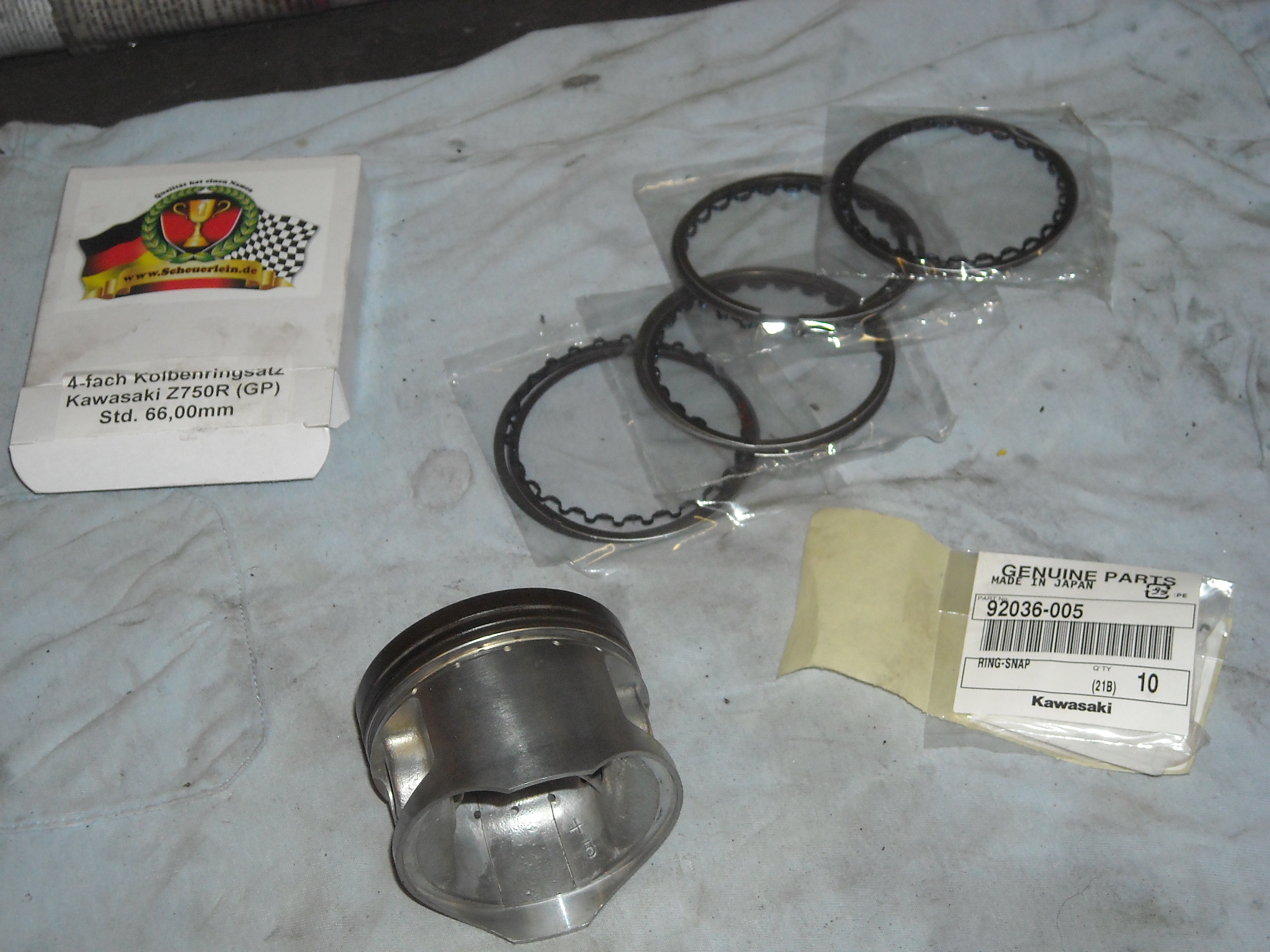 Since the Kawasaki piston ring compressor is only suited for the Z900 and the Z1000, I mounted the cylinders by hand...first pistons 2 and 3 and then pistons 1 and 4...it took me a few hours of work and it costs me a few broken fingernails but the pistons are in!