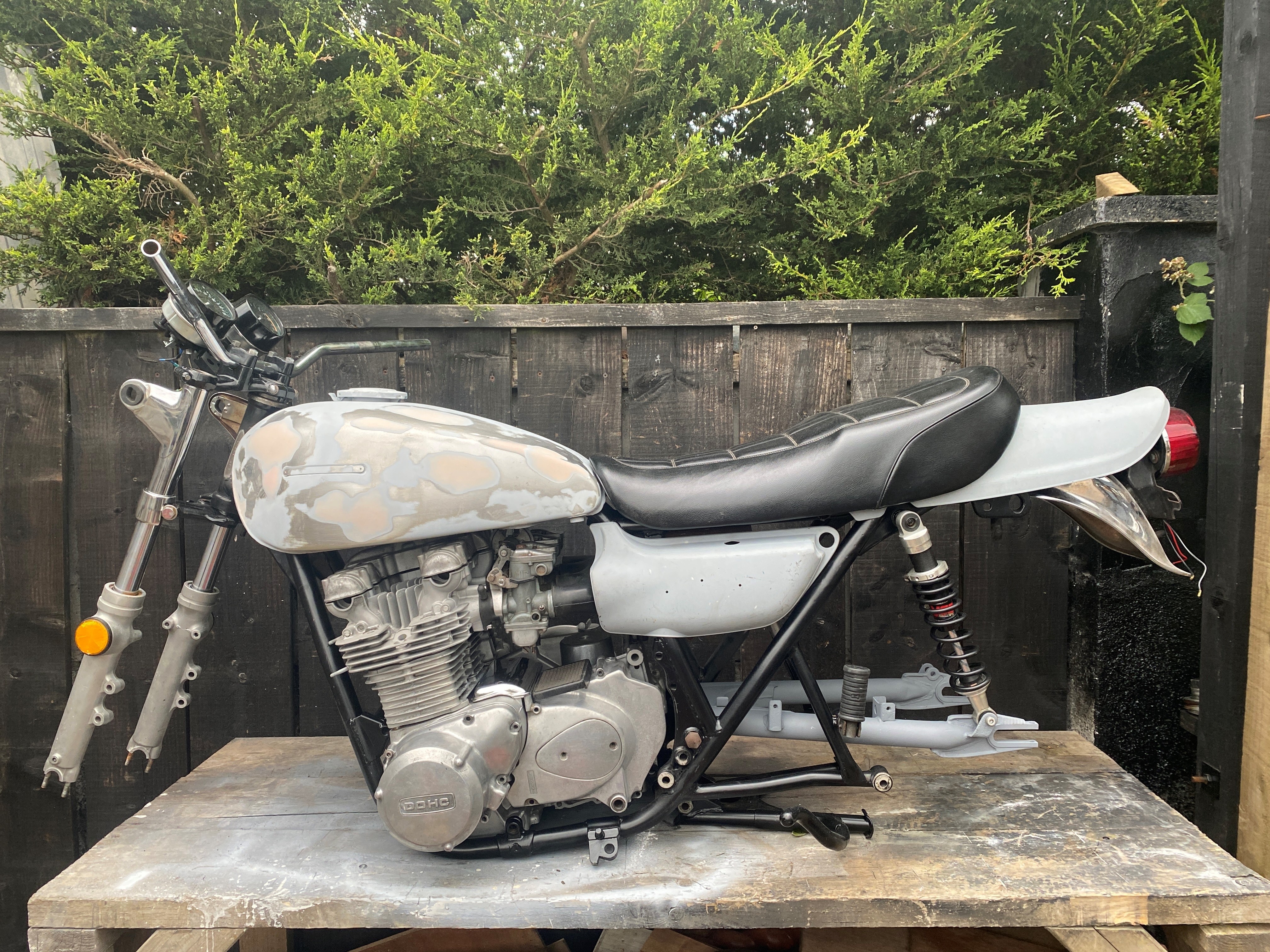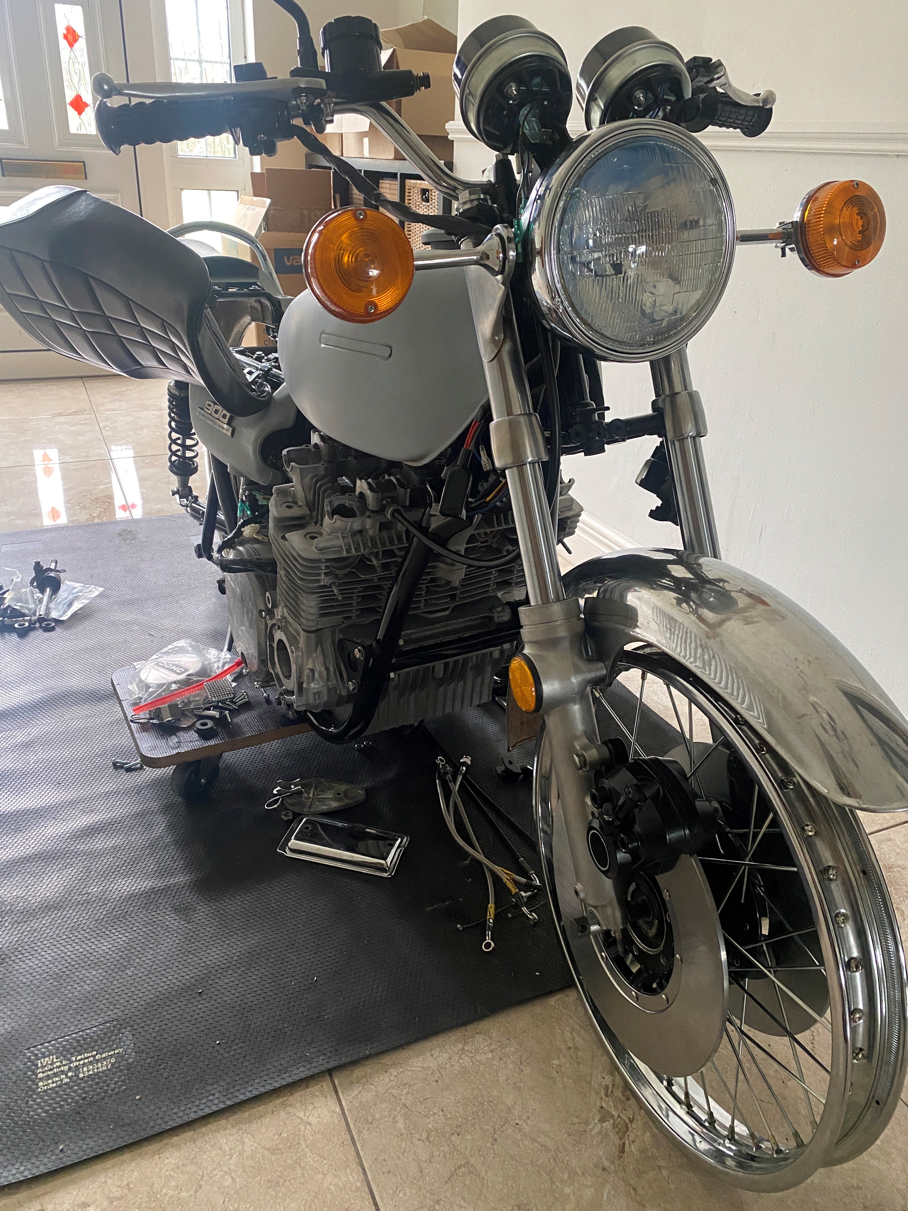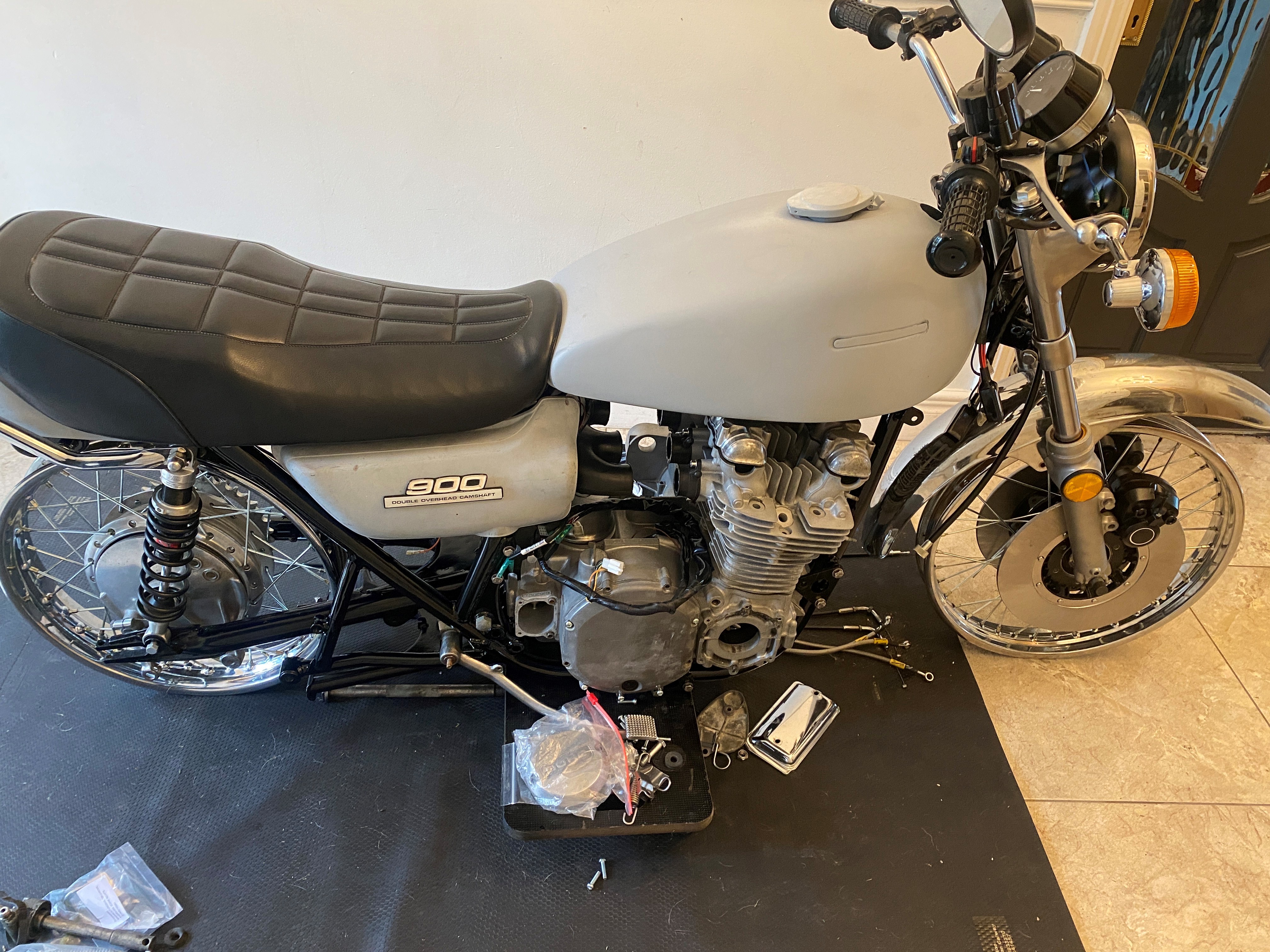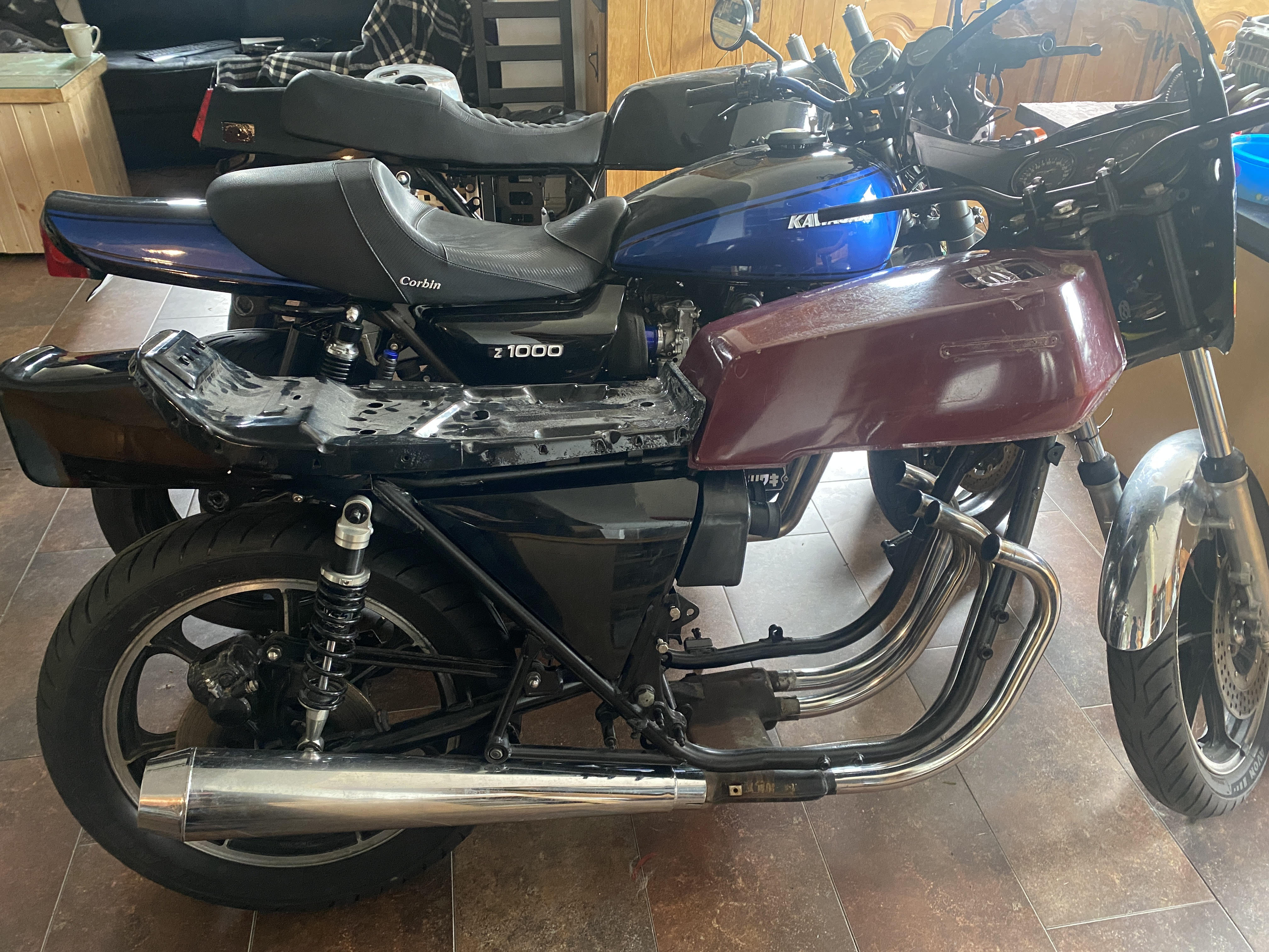 Just blew the budget of €1500 on parts and thats minus the exhaust, front mudguard and a few other parts that will be picked up if i survive not eating for the next month..I decided to go dual front brakes (both new Z1, calipers and disks) progressive fork springs that added to the YSS shocks for riding but Z1 "mock stock shocks" if im going to a show and braided goodridge hoses, because i live where the roads are like roller coasters and i don't want to die.