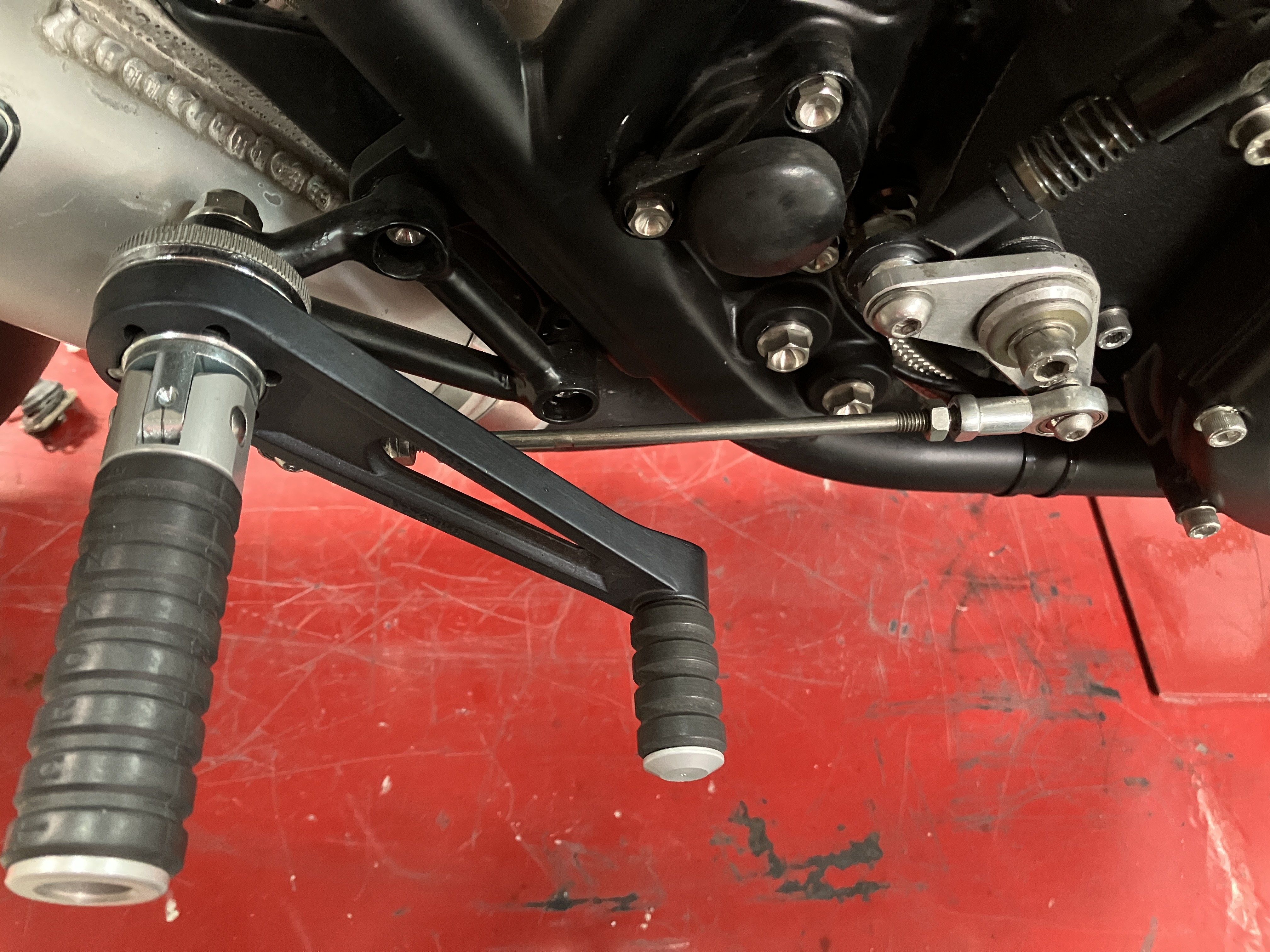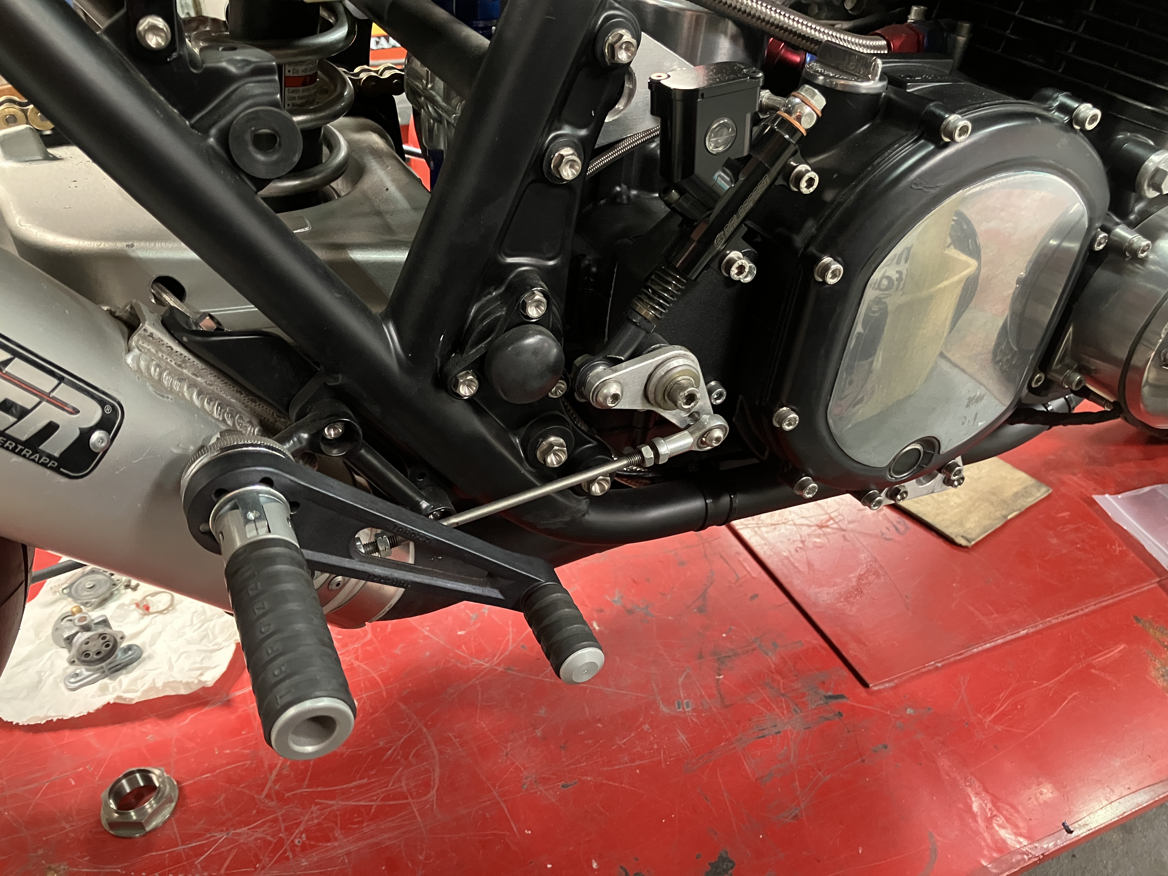 And that rear brake actuation.... glad you noticed it hahaha. It took us a while to get that figured out with the muffler, the frame tubes, the kickstarter shaft and the billet master. So we decided to ditch the kickstarter together with the shaft and make a new base plate where the kick start cover first was. On that cover we installed the master and the swivel point.