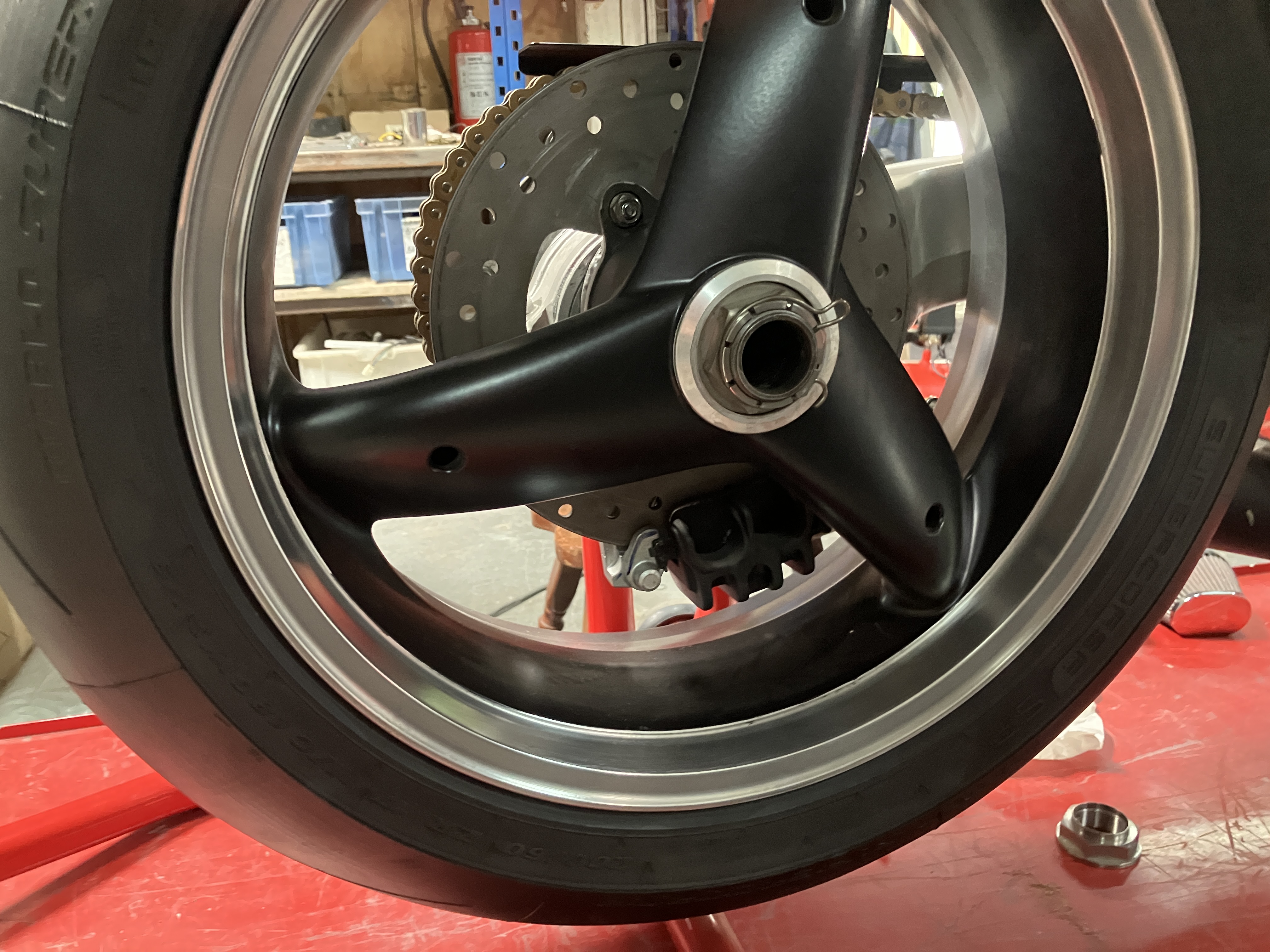The rear Triumph brake caliper wasn't that nice to look at, so we cut and welded the caliper hanger to get it in the bottom position and then hid the brake line by guiding it through the swing arm from the existing hole in the rear to a new hole in the right side up front. Rubbers are on their way to be fitted in the holes.
