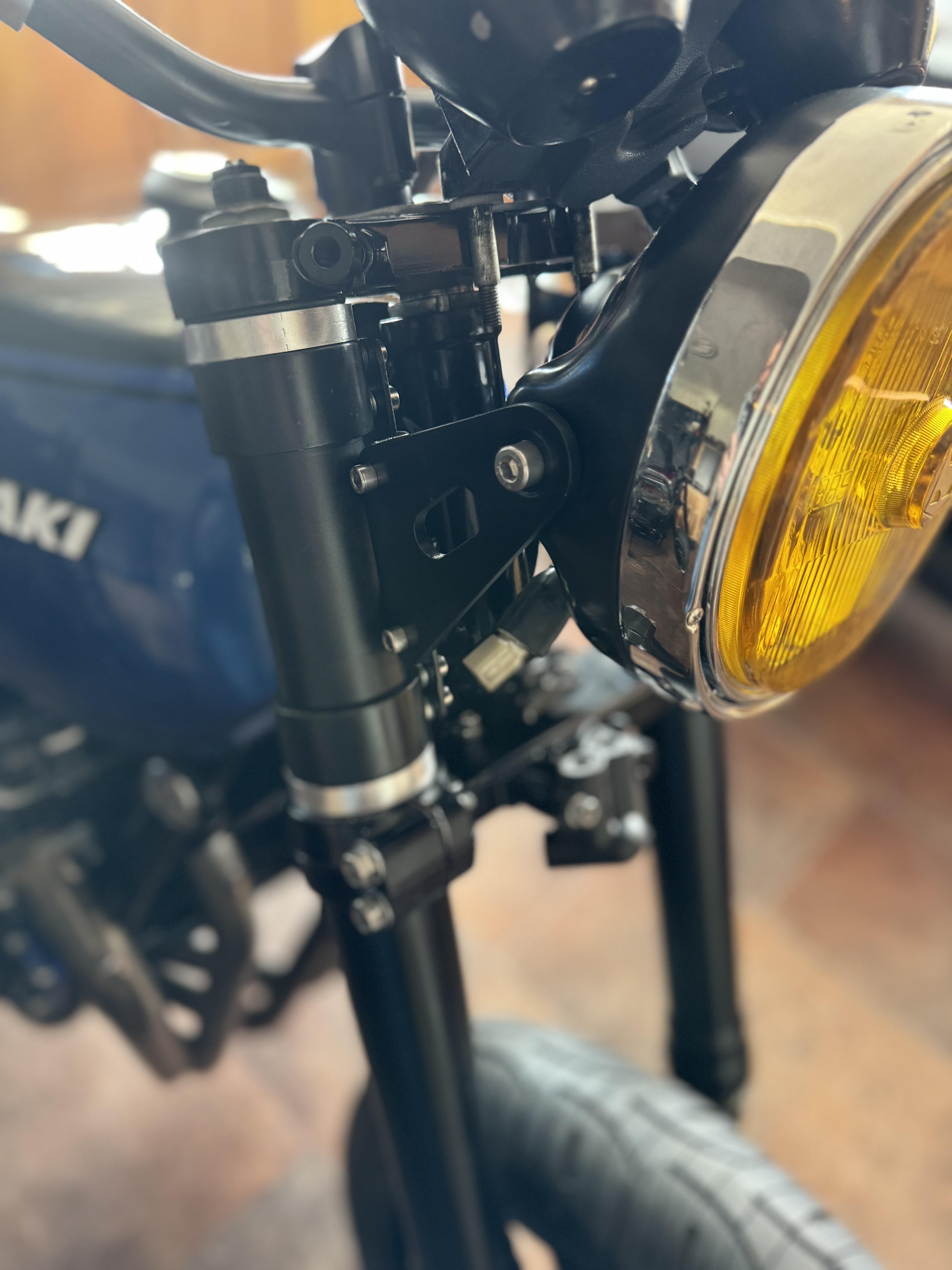 Yesterday was spent figuring out a tidy way to mount both the standard z1000 box a headlight bracket for the 50mm forks. I basically used th bandit 1200 system and chopped it up and with some fabricated spacers everything fits snug and solid. The clocks are mounted from a custom laser cut bracket that fits over the standard GSXr yolks.
