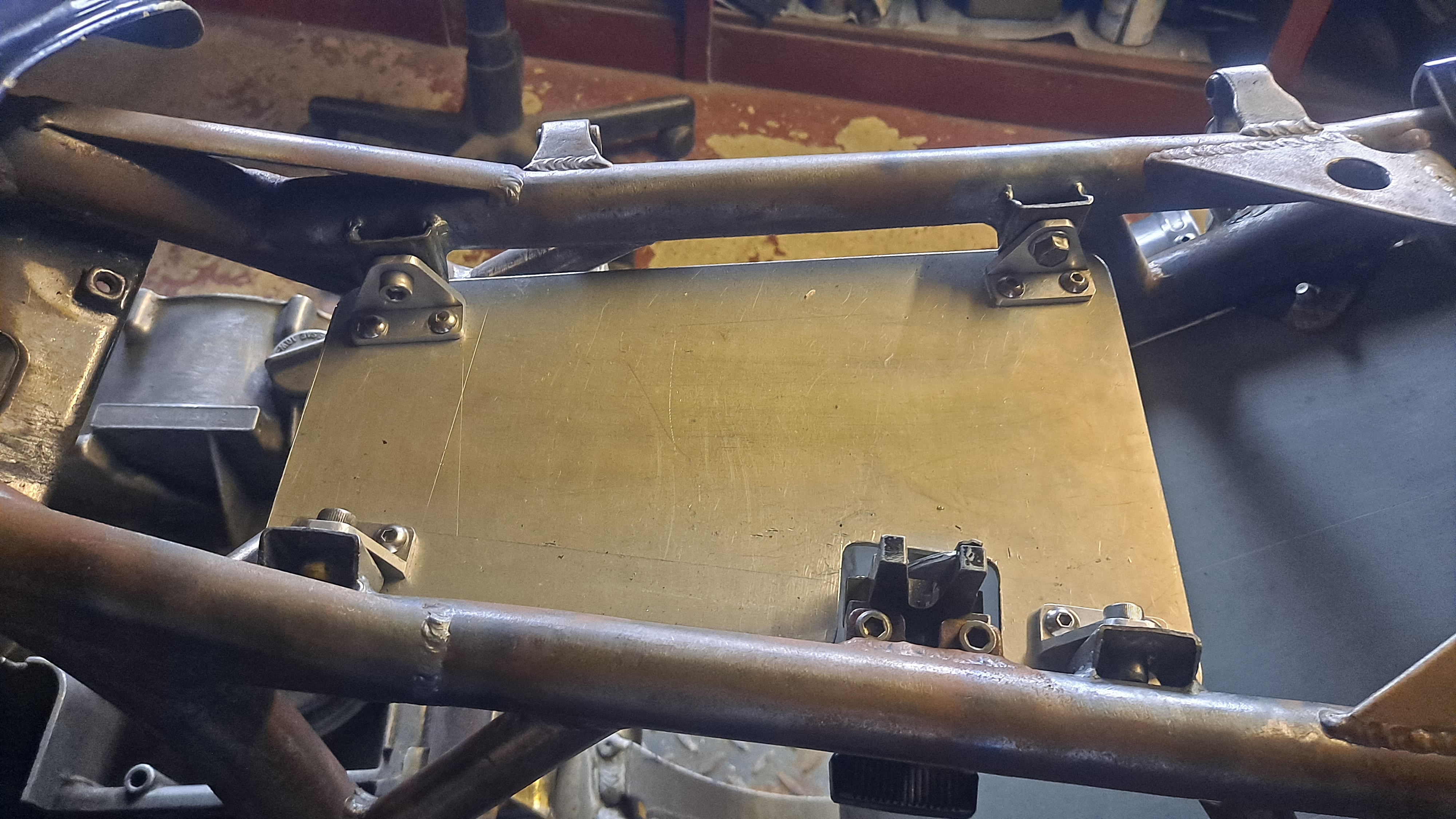 Came up with four captive nut frame tags to take a minimal underseat tray which will house the reg/rec and starter solenoid