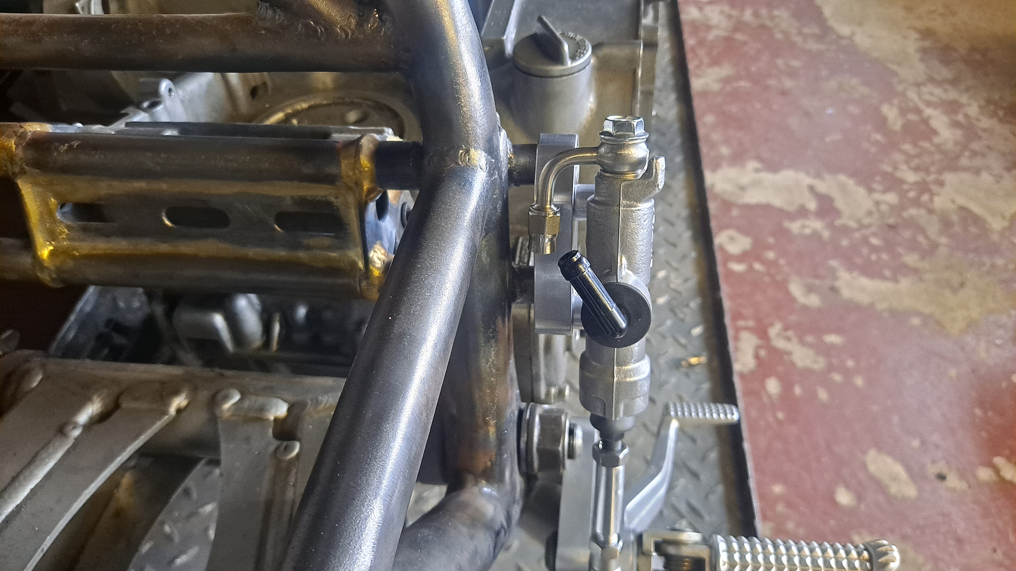 And then machined up and welded on a couple of extensions to the right hand rear engine mount frame bolt holes to take a plate and alignment spacers for the rear brake master cylinder
