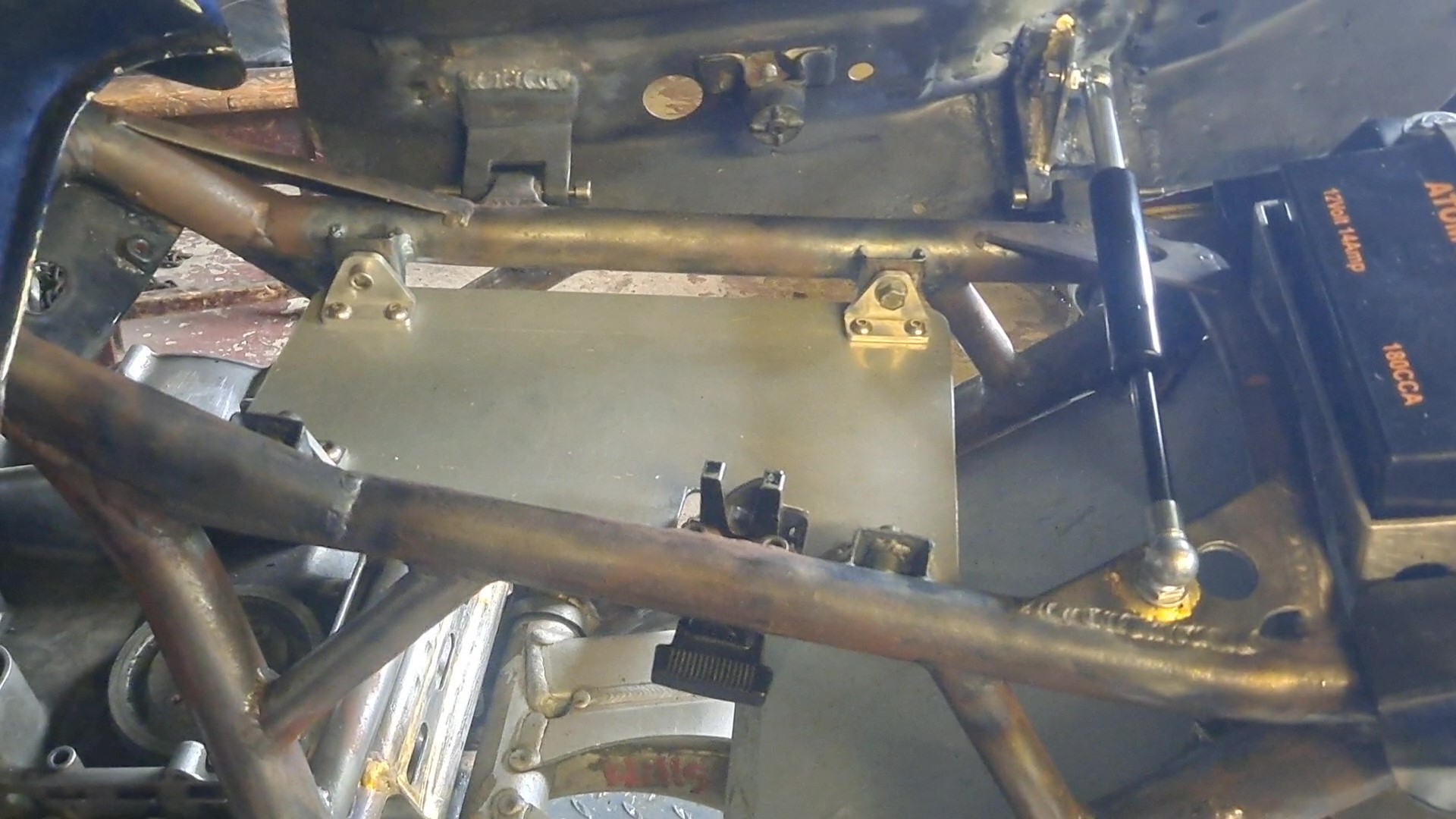 Ebay gas strut arrived ( 200MM full extended length, 60mm travel ) so after a bit of guesstimation i brazed in a threaded boss into the frame gusset for one end and welded a strengthening web on the rear hinge with a 8mm hole to take the other and voila! one self opening seat ( once you've turned the latch )..