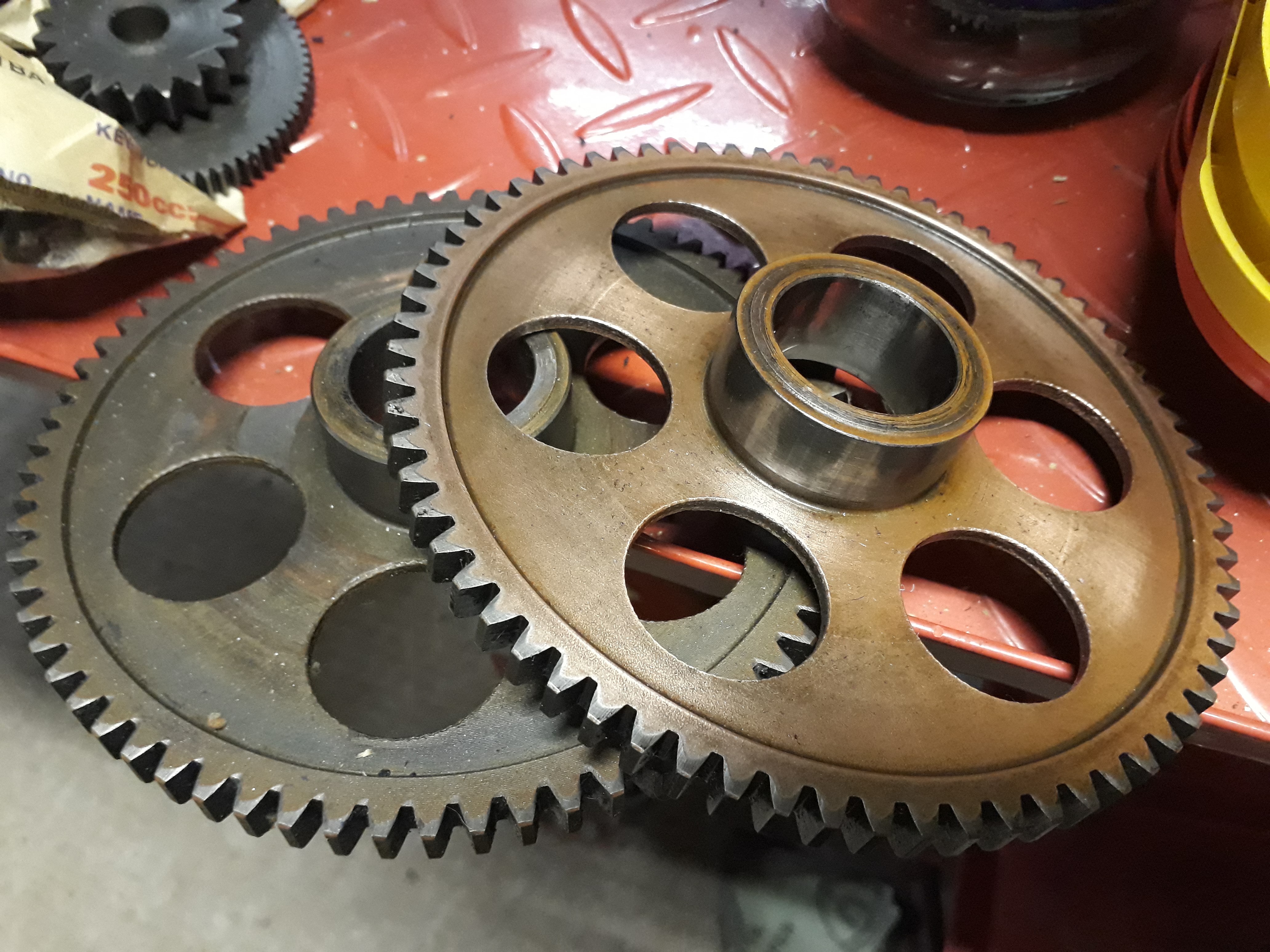 I managed to get the bits I needed to fit the starter clutch etc - Thanks Rob! - and the aftermarket starter clutch refurb stuff and a new needle roller bearing. But looking at the ring gear and idler gear, they were really nasty and smeggy, and the idler gear had what looked like bits of old magnet between the teeth, presumably from a knackered alternator...