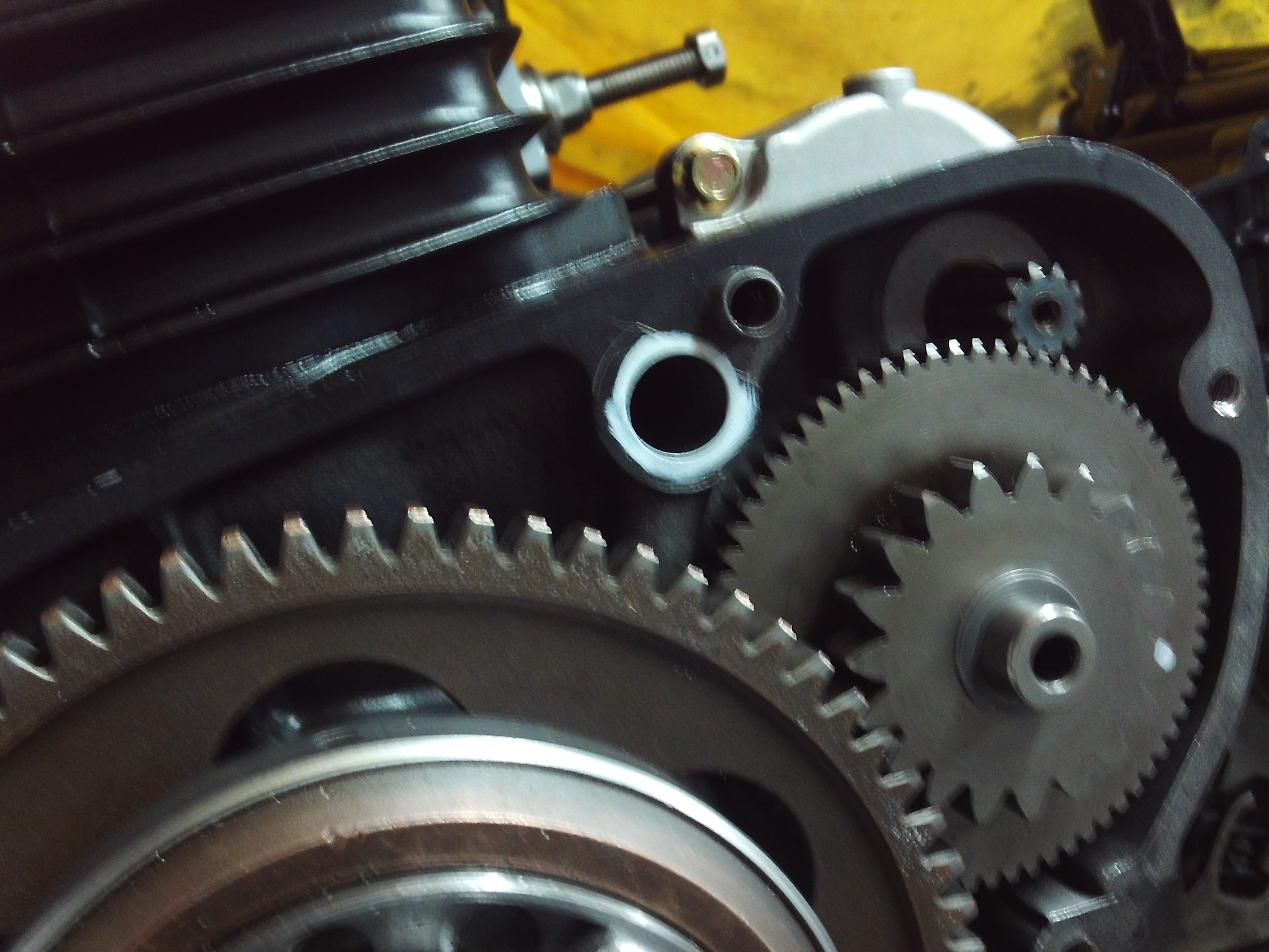 And in the true spirit of recycling they are genuine repurposed Kawasaki Z1 camchain top idler collars which were exactly the correct diameter at the wide end to fit the counter bore and just needed a slight height reduction of the wider face to allow the bolt head to remain just below the surface to clear the starter gear and the smaller tube sections o/d slimming to allow a tight press into the housing .