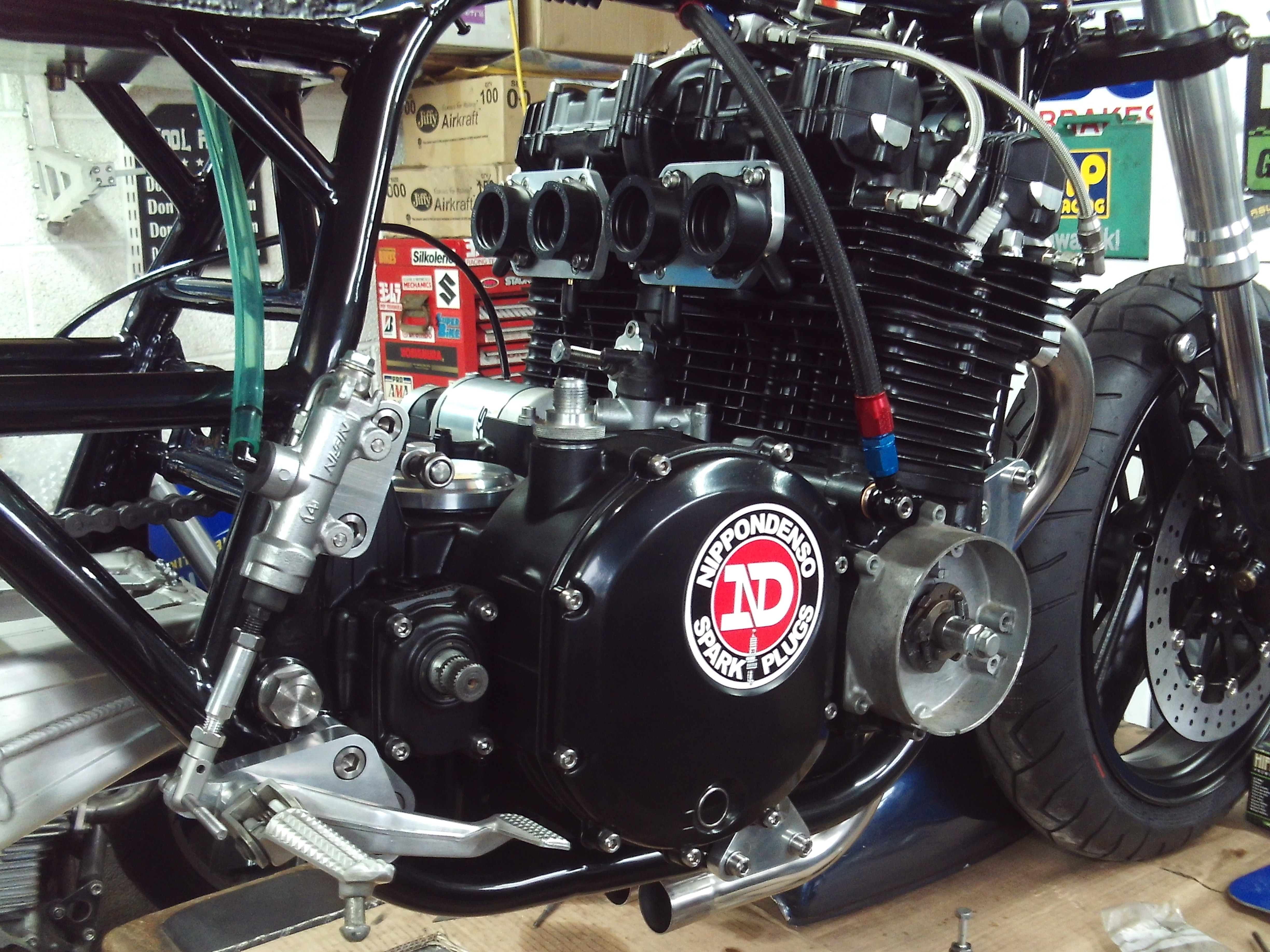 Made some stainless exhaust studs and got the downpipes on but they run very close to the sump and the collector fouls the stock filter cover so had to knock up another low profile version with flush fitting bolt the same as i did on the alloy cafe..